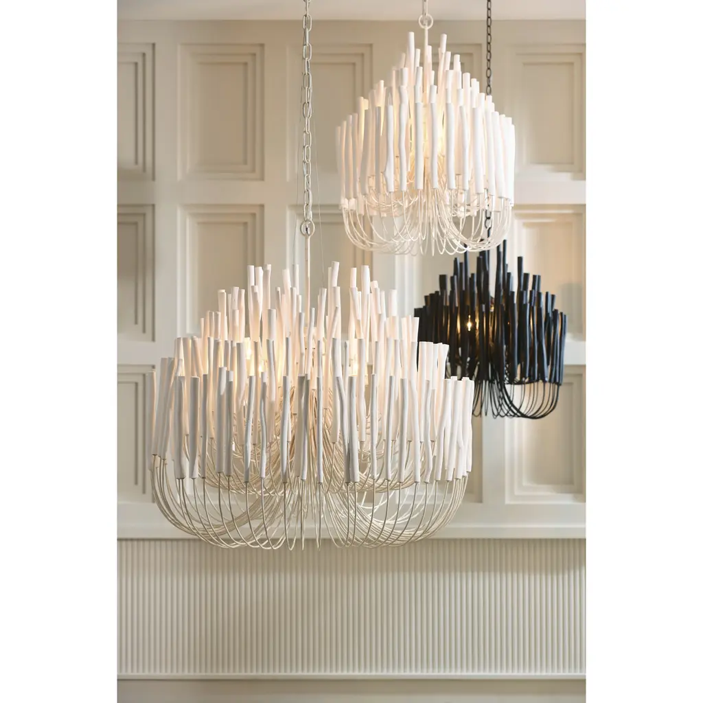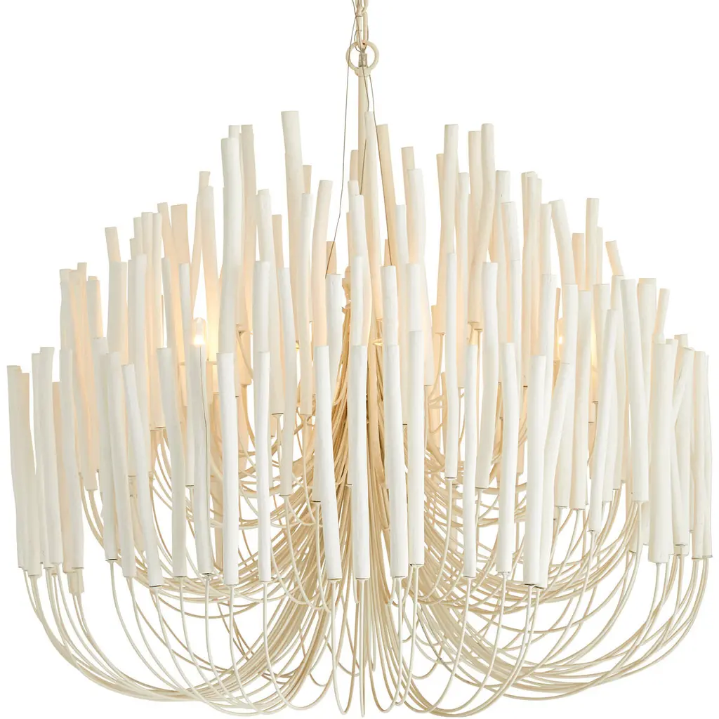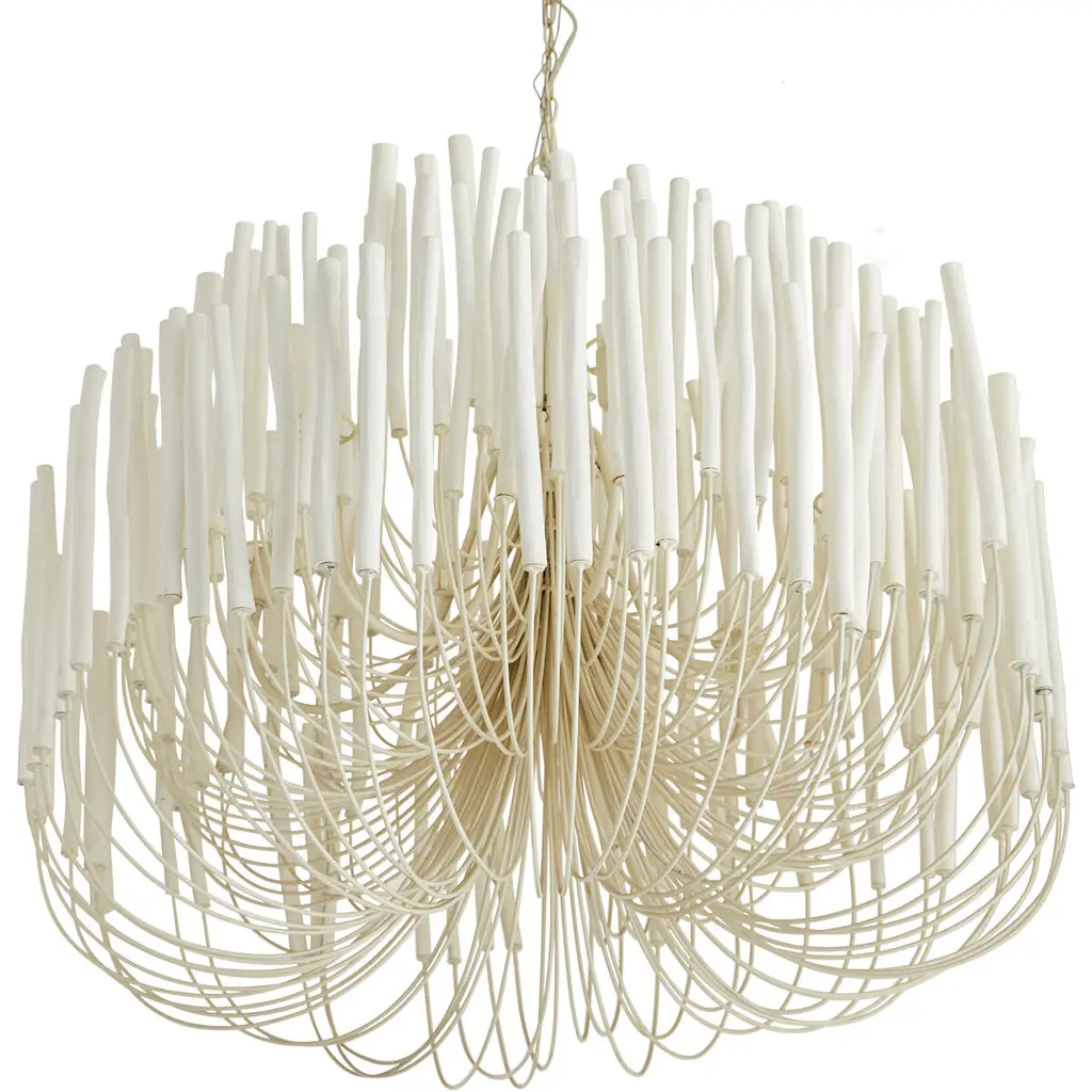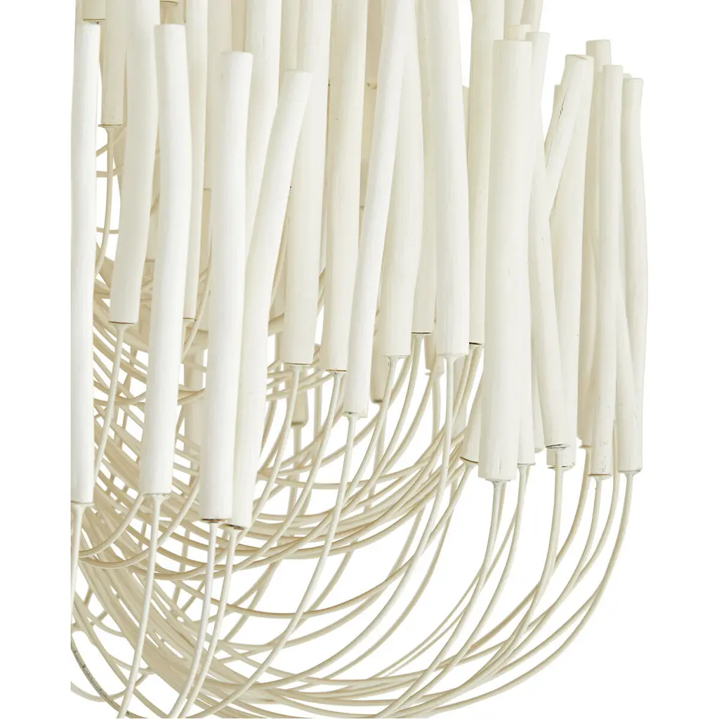 6-light chandelier with several tiers of wooden sticks on curved iron arms all in a whitewash finish. The wooden dowels are placed atop pliable arms. When switched on the light glows from within and transforms the space into something magical. During installation please ensure that all bulbs are not touching any of the wooden dowels. If they are gently press the arm away from the bulb about an inch to allow heat to properly disperse. Also comes in small (89559) and as a pendant (49558).