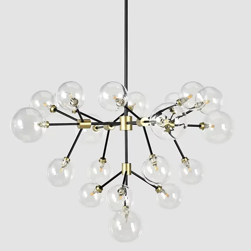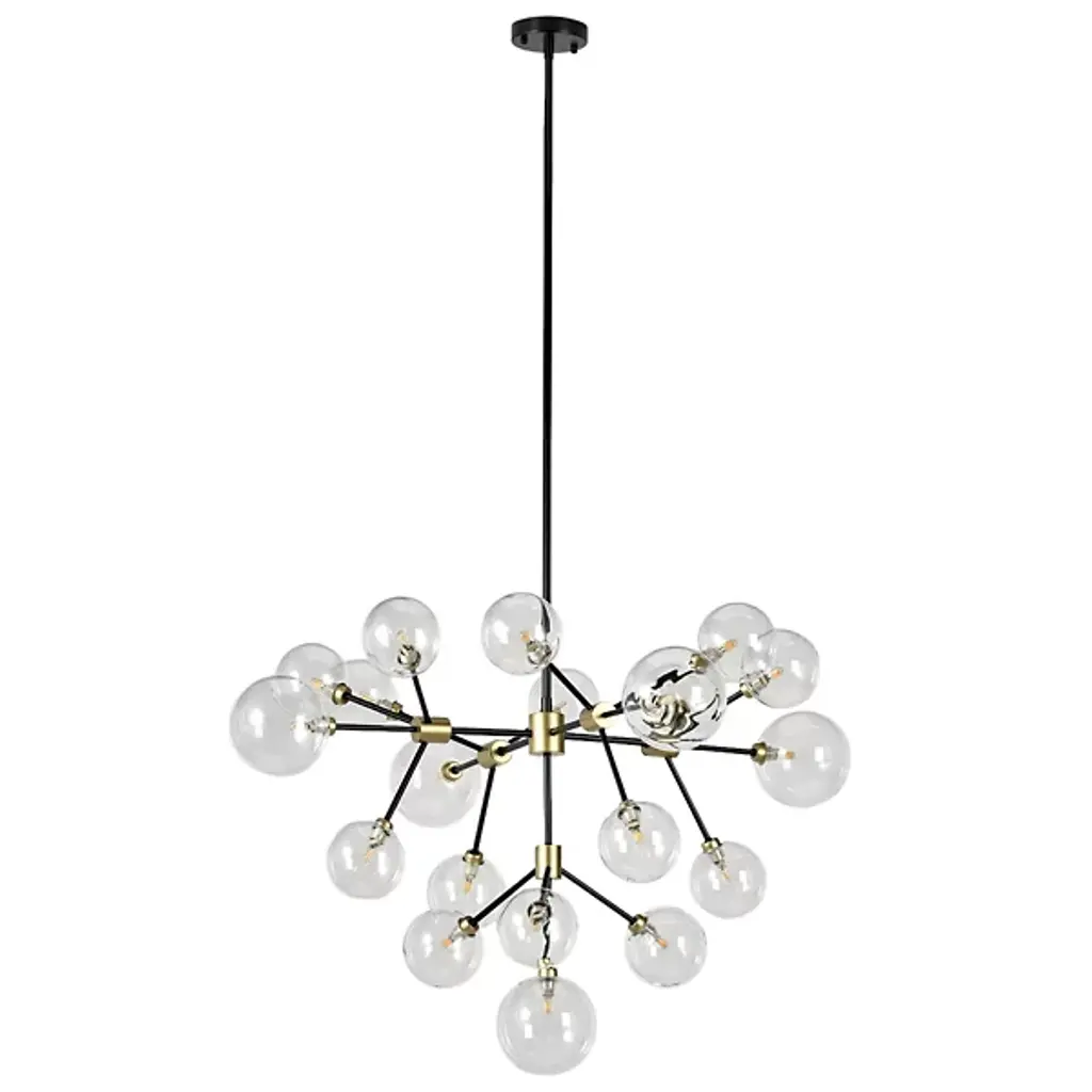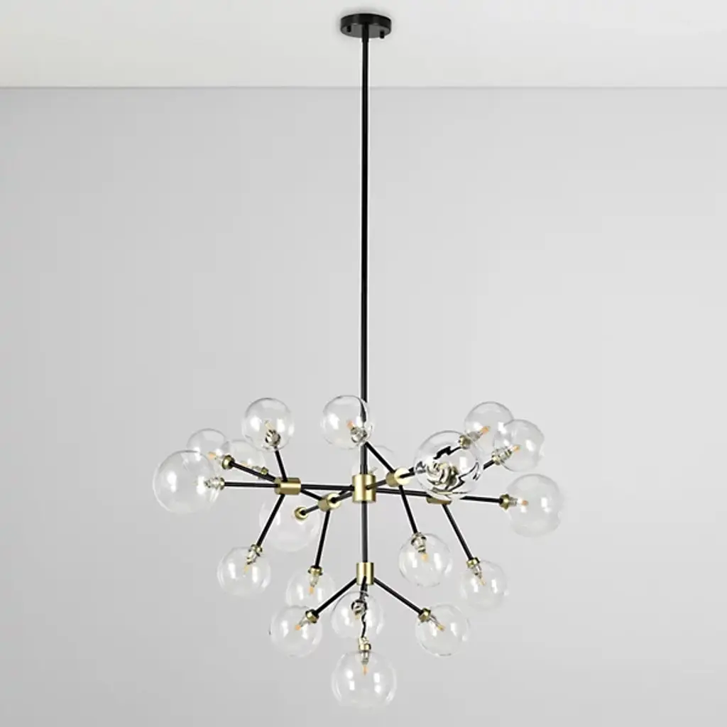 Transform your space with the Timothy Chandelier from Classic Home, creating a bold blend of modern design and mid-century charm. Its black iron frame and gold fittings support twenty clear glass globe shades branching out in all directions to radiate dazzling warmth. The striking arrangement of stems creates a dynamic silhouette, perfect for brightening its surroundings. A stylish and sophisticated statement, this chandelier turns any space into a vibrant constellation of light.