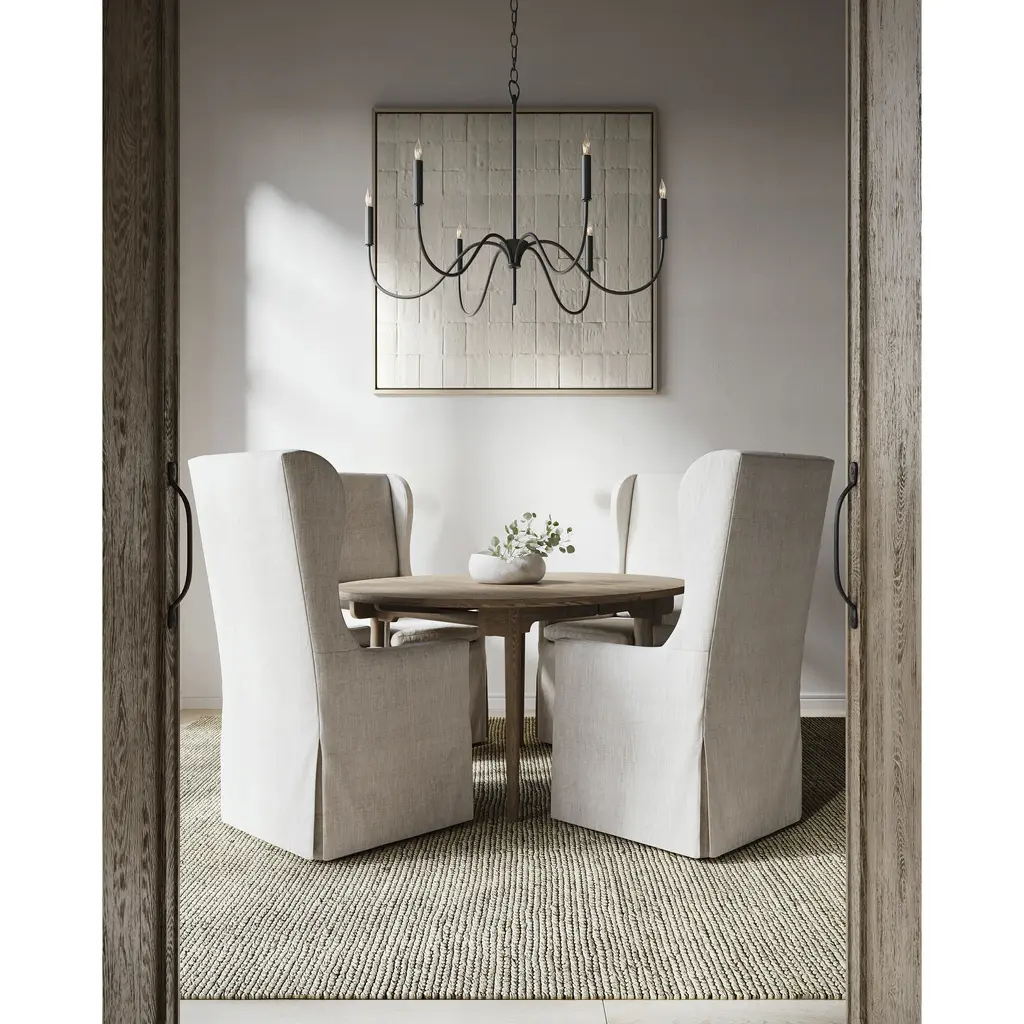 A nod to Early American style, the Tirrell Small Chandelier has graceful arms that arc upward to hold its candle sleeves with simple dignity. The black chandelier is made of wrought iron in an antique black finish. We also offer the Tirrell in medium and large sizes.