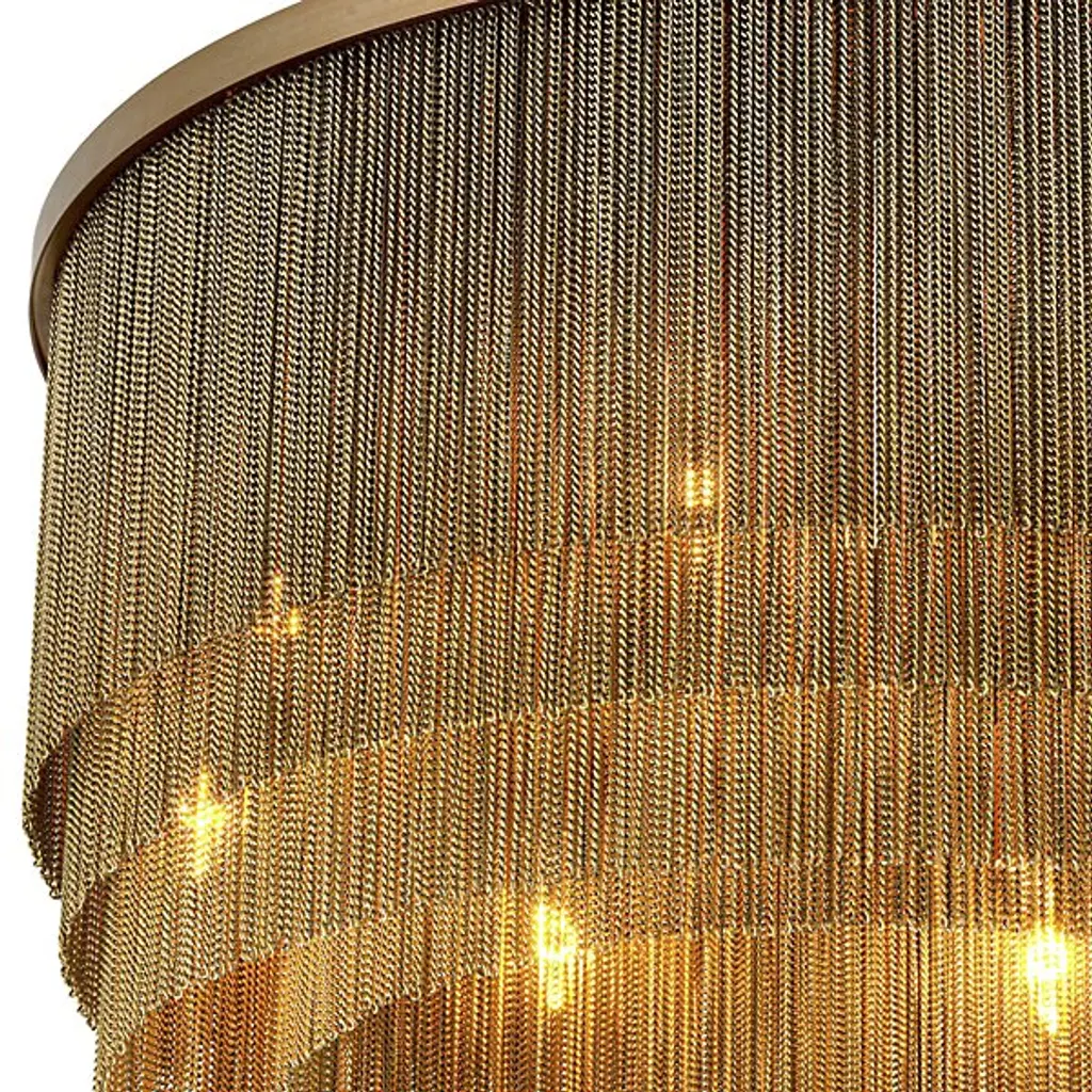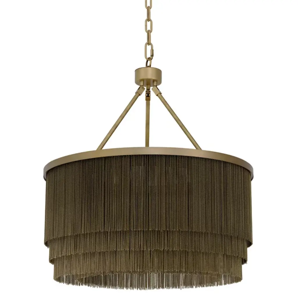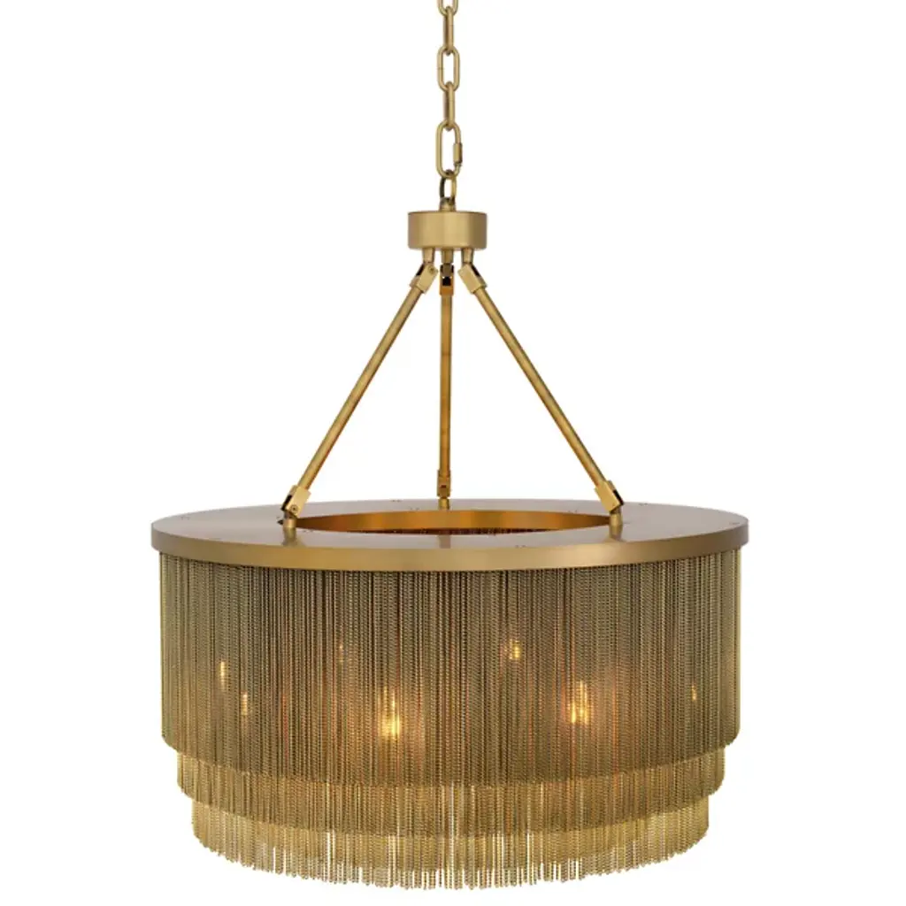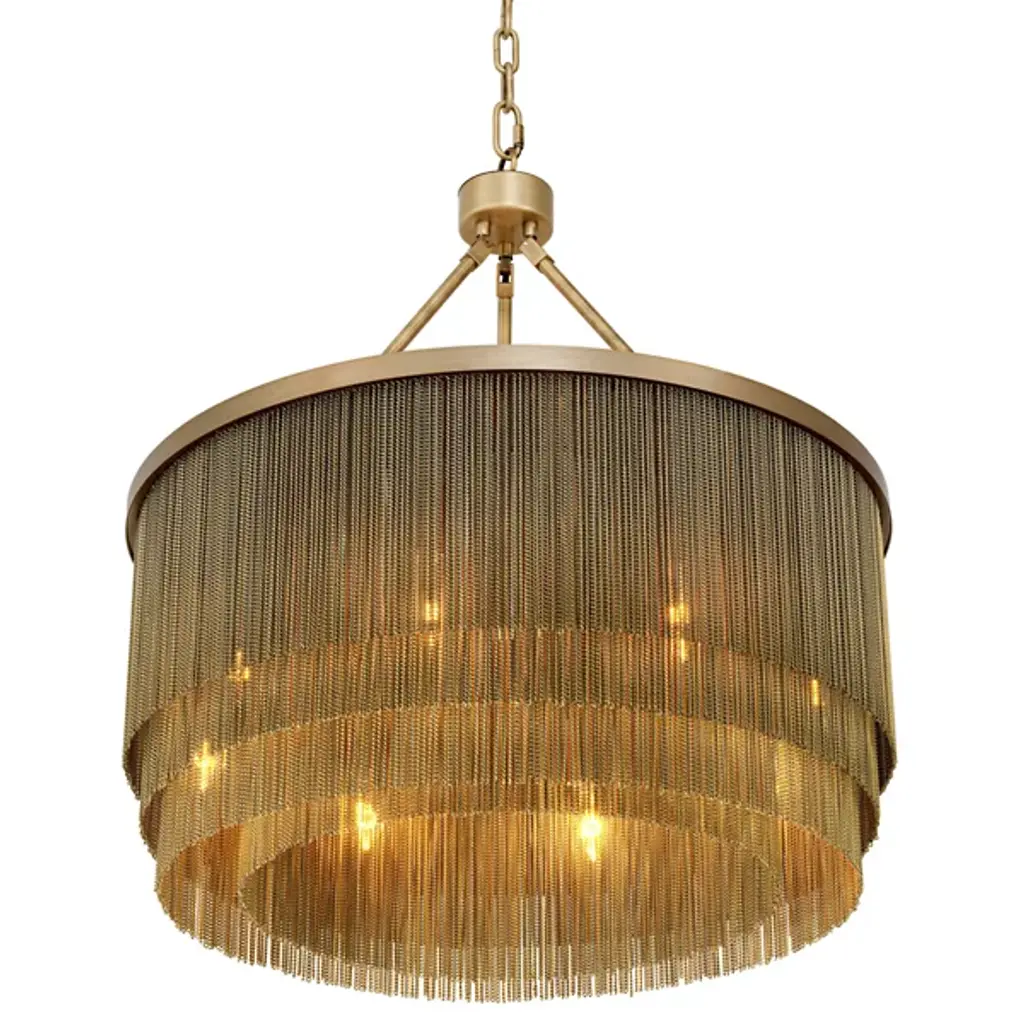 The Tissot Chandelier is a stunning piece of luxury lighting from Eichholtz. Boasting a distinctive reminiscence of flapper fashion from the art deco era, each of its tiered rows of fringe makes up the shade, tastefully hiding the interior illumination. Three-pronged stems hold up the structure, hanging from chain link and canopy, all in a matching antique brass finish. It makes a glamorous and bold statement above a dining table, in a grand foyer, or some other enchanting interior of your dreams.