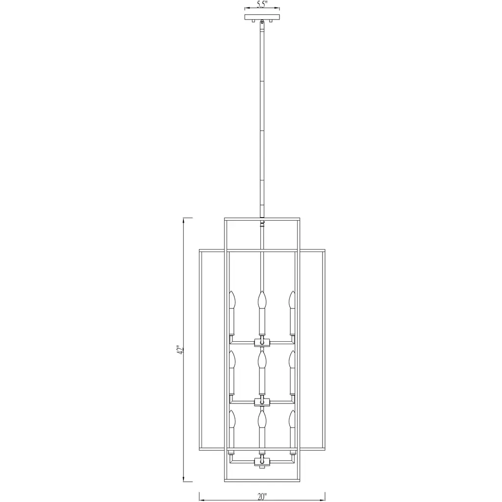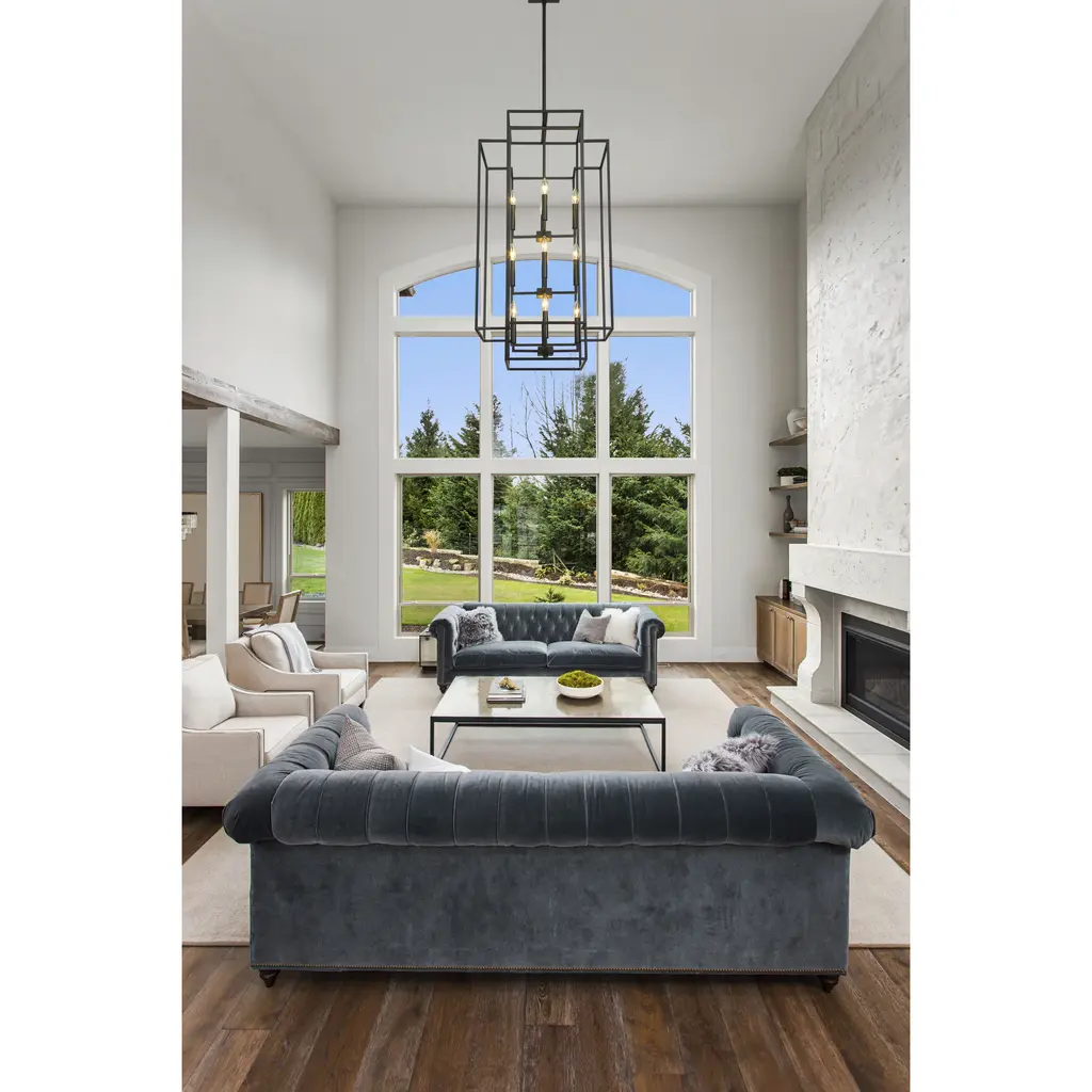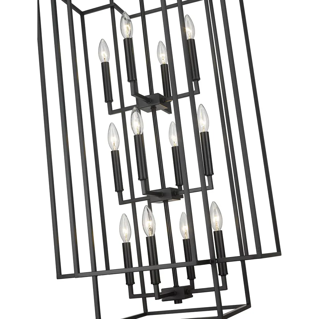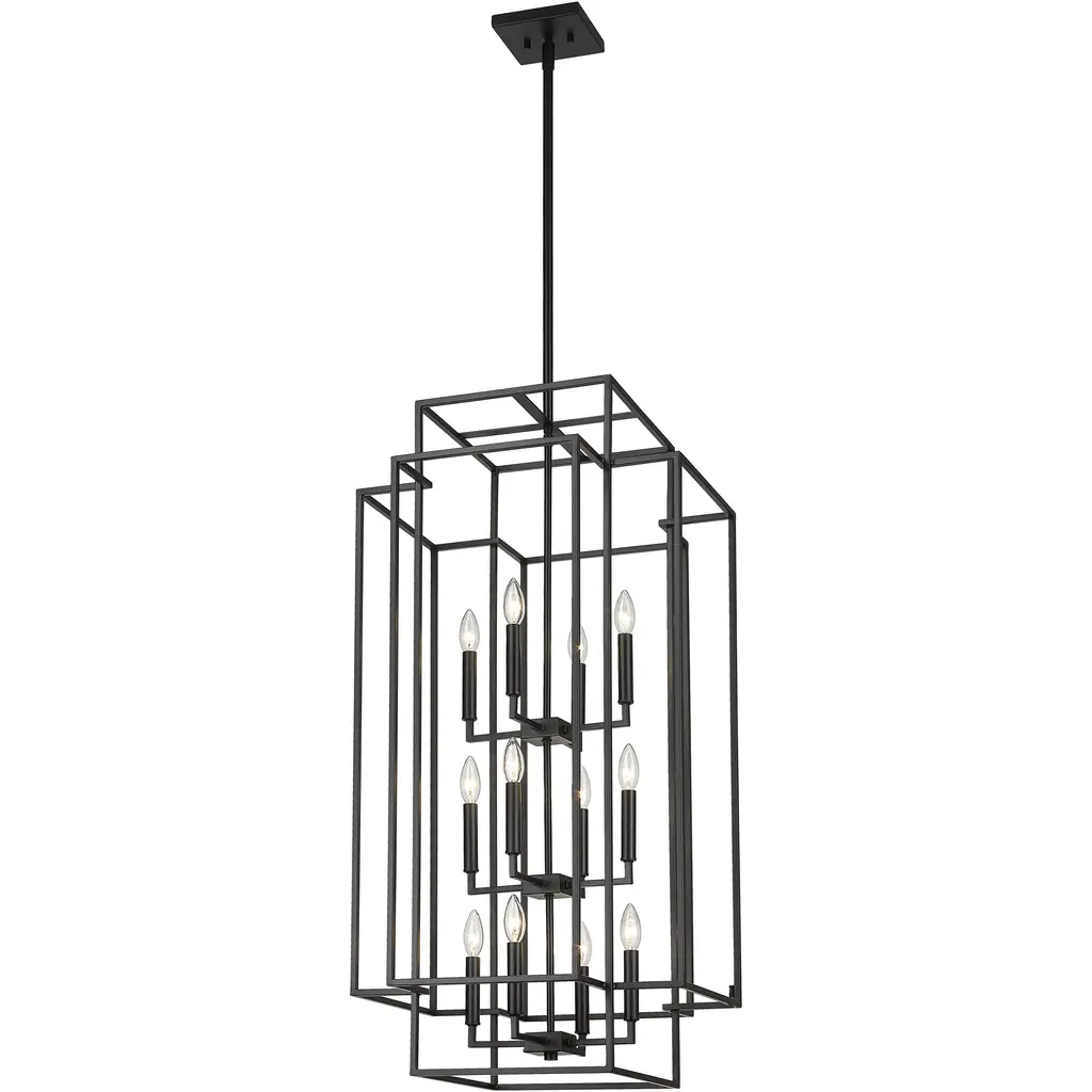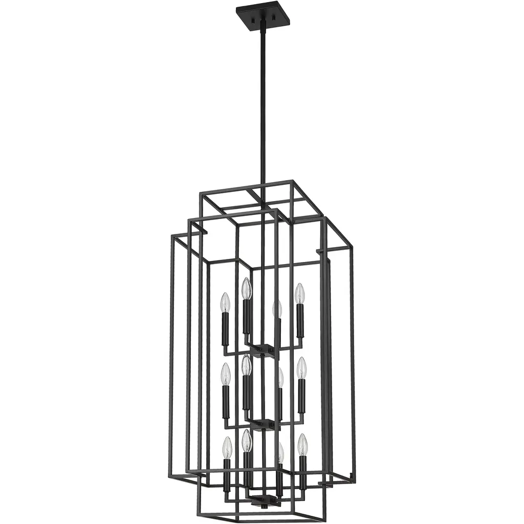 An elongated steel cage offers a grand minimalist aesthetic to this contemporary 12-light pendant, designed with a tall geometric tesseract-inspired shape. Designed with a modern architectural feel and Frank Lloyd Wright-inspired aesthetic, this oversized transitional pendant makes a breathtaking, dramatic addition to museum-like interiors or two-story entryway foyers with high ceilings with its stark matte black finish. Illuminate the entire space with its generous tiered candelabra, showcasing 12 lights within its open and airy black cage.