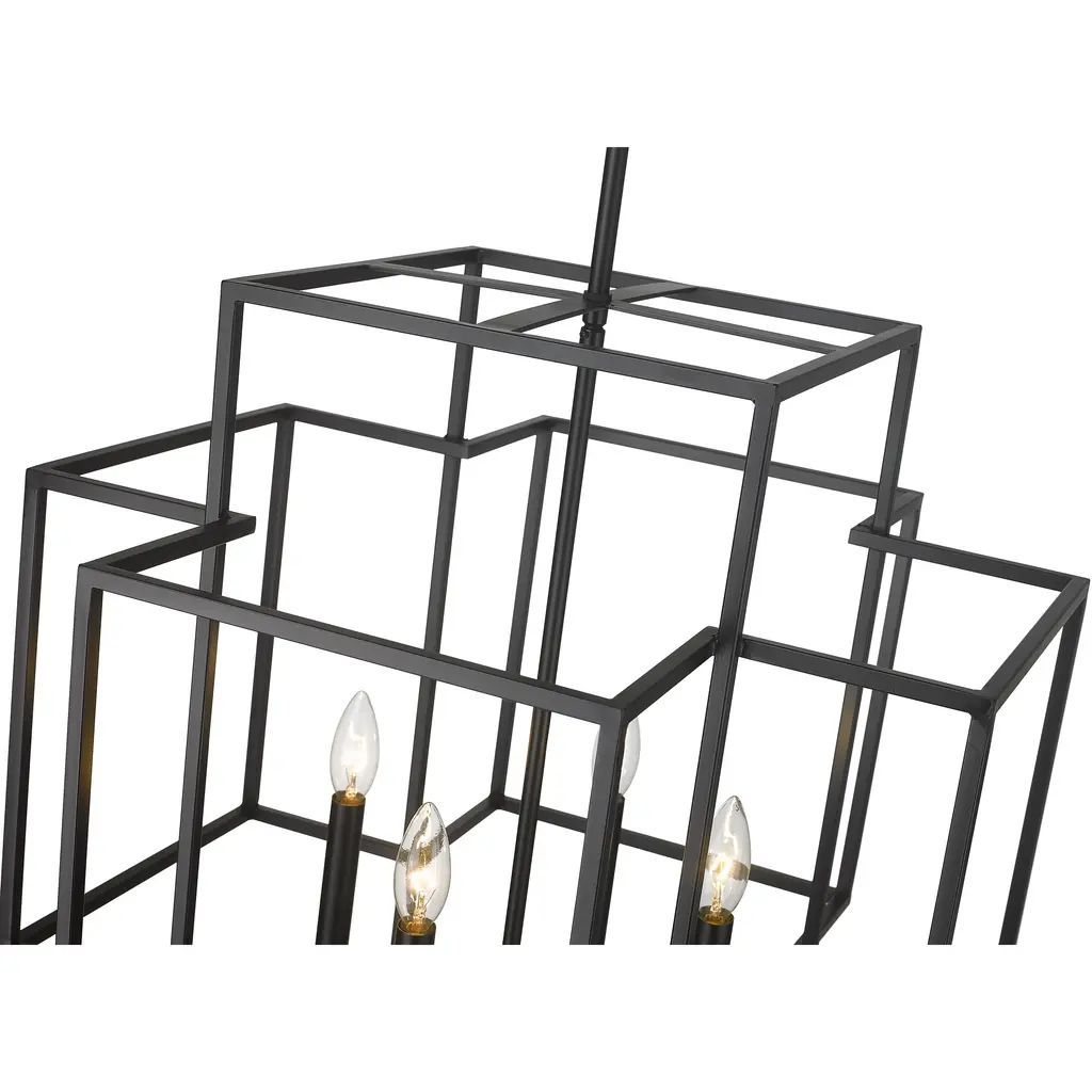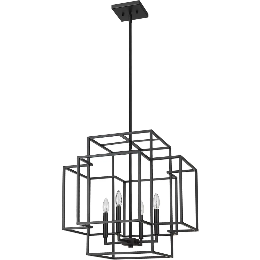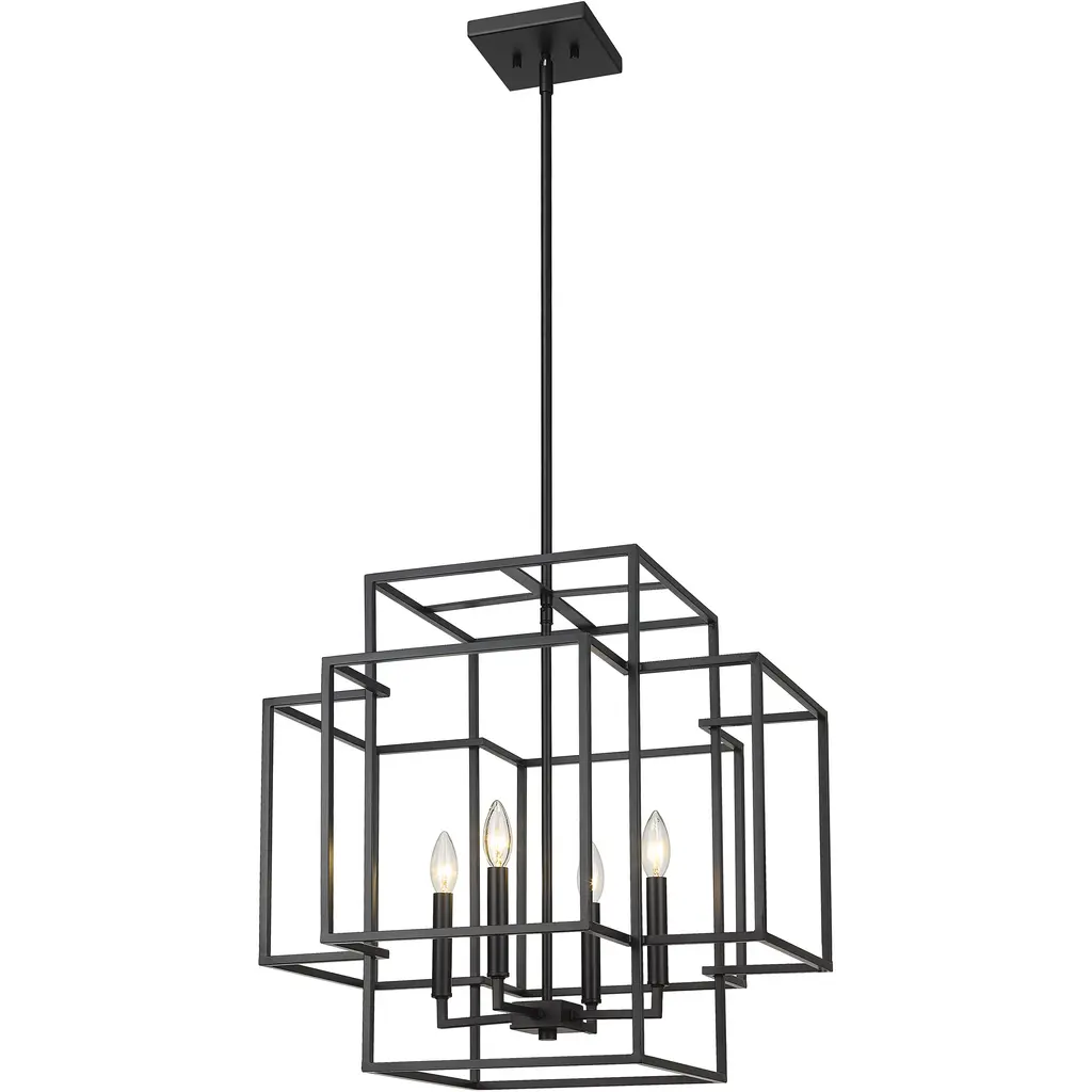 Sleek steel offers a minimalist aesthetic to this large contemporary four-light pendant and presents a sophisticated tesseract-inspired shape. Modernizing spacious transitional interior spaces like open concept living rooms and master bedroom retreats, this grand transitional pendant boasts a dramatic stark matte black finish that presents a modern architectural aesthetic and Frank Lloyd Wright-inspired flair. Within its oversized open and airy contemporary shade is four candelabras topped with exposed bulbs that lend a chic industrial feel.