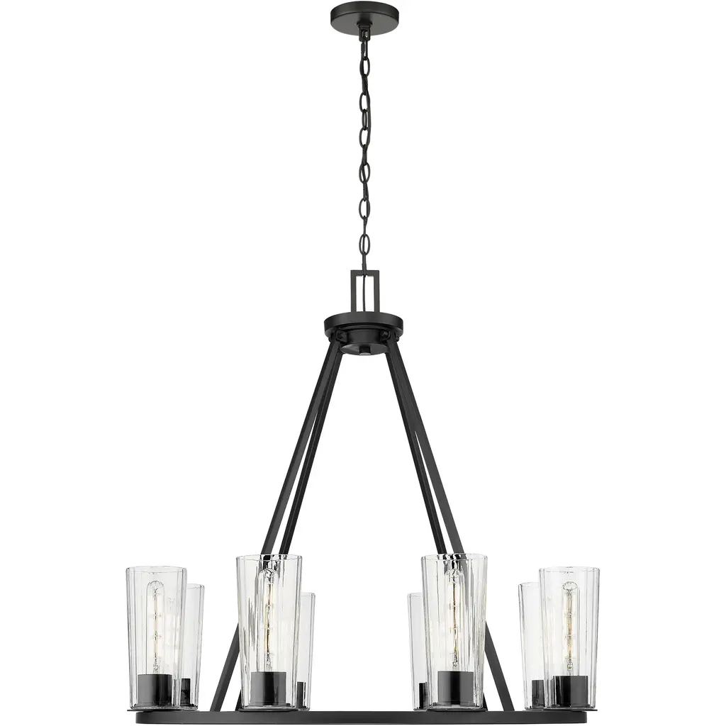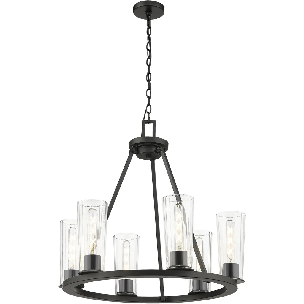 Create a sense of intimacy over a dining table or seating group with an industrial six-light ring chandelier from the Titus collection. In matte black, it boasts a clean-lined structure crafted in steel and paired with clear tapering glass shades for bright, beautiful illumination. It's dimmable, perfect for creating the right ambiance for every occasion.