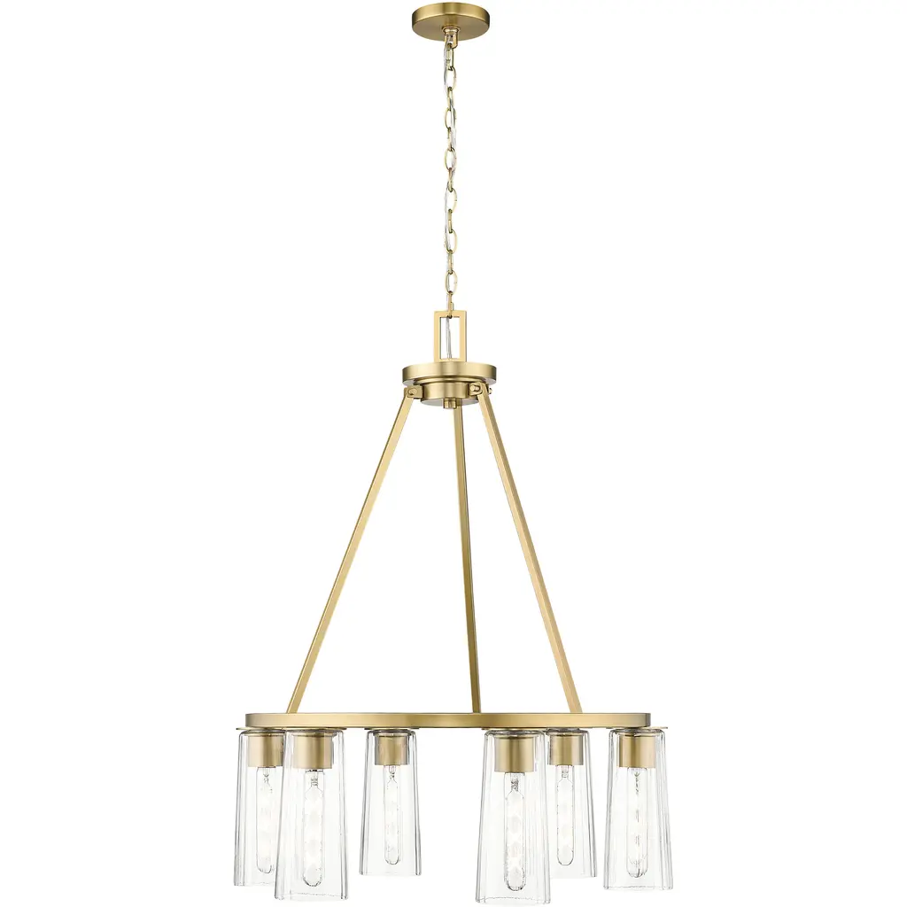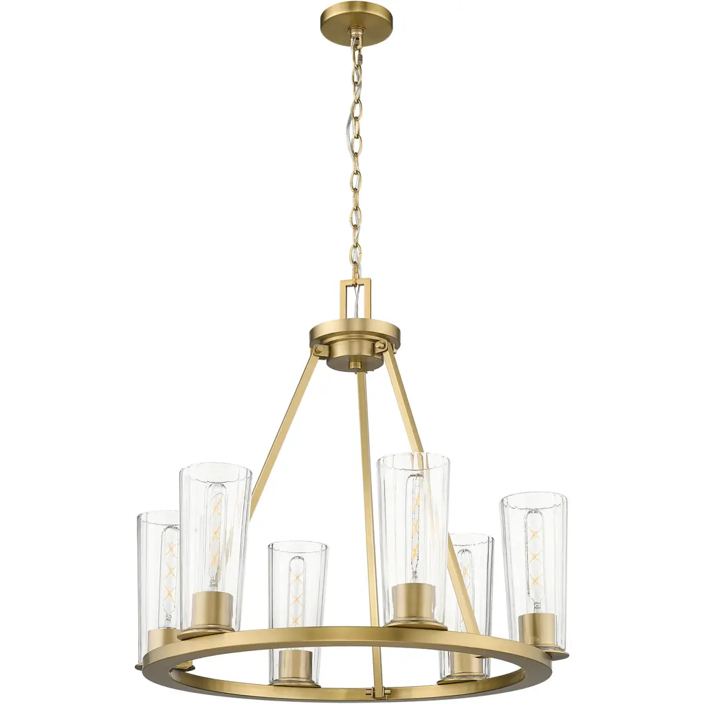 Create inviting warmth with the modern gold finish featured on a fashion-forward six-light ring chandelier. This chandelier is perfect for a breakfast nook or dining table, it boasts a classic silhouette and vintage charm with tubular bulbs. Tapering glass shades are clear and crisp, adding the perfect dose of character.