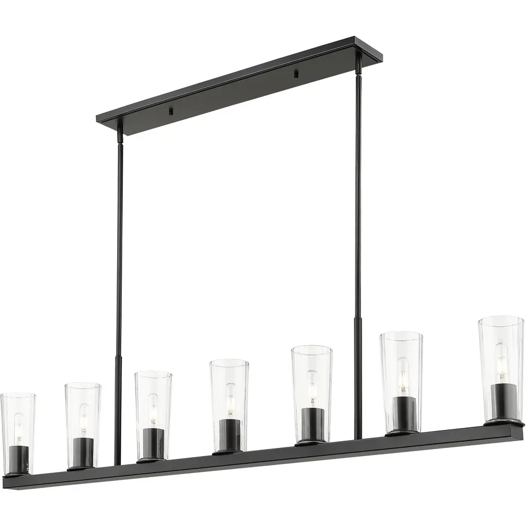 Span a substantial dining table or kitchen island with an industrial modern seven-light linear chandelier. Beautiful tapered glass shades and tubular bulbs provide stylish, vintage-looking illumination. The clean lines of this stylish chandelier are ideal for a variety of spaces, while a matte black finish offers excellent versatility.