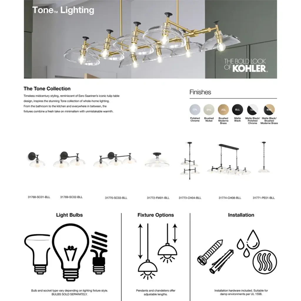 With clear glass dome shades, mixed metal trumpet bases, and intersecting rod supports, the Tone bathroom lighting collection delivers a fresh take on midcentury modern style. Blending minimalism, warmth, and thoughtful functionality, Tone lighting fixtures are versatile enough for any space in your home. These contemporary pieces were created to complement the Kohler® Tone faucet collection for a cohesive home design.