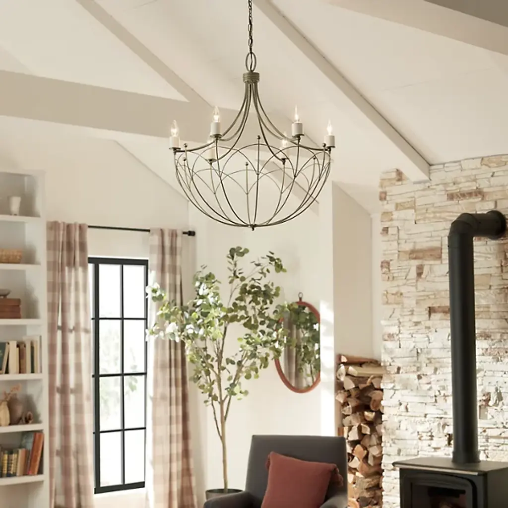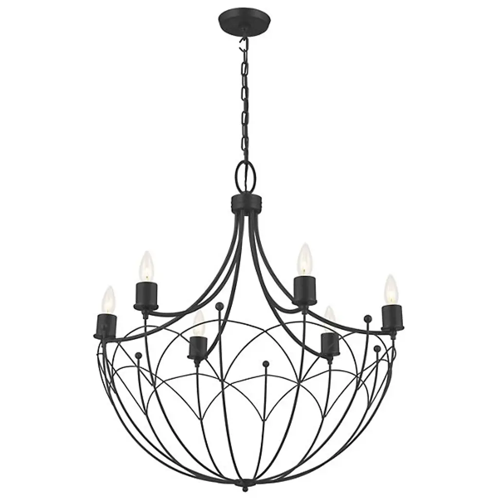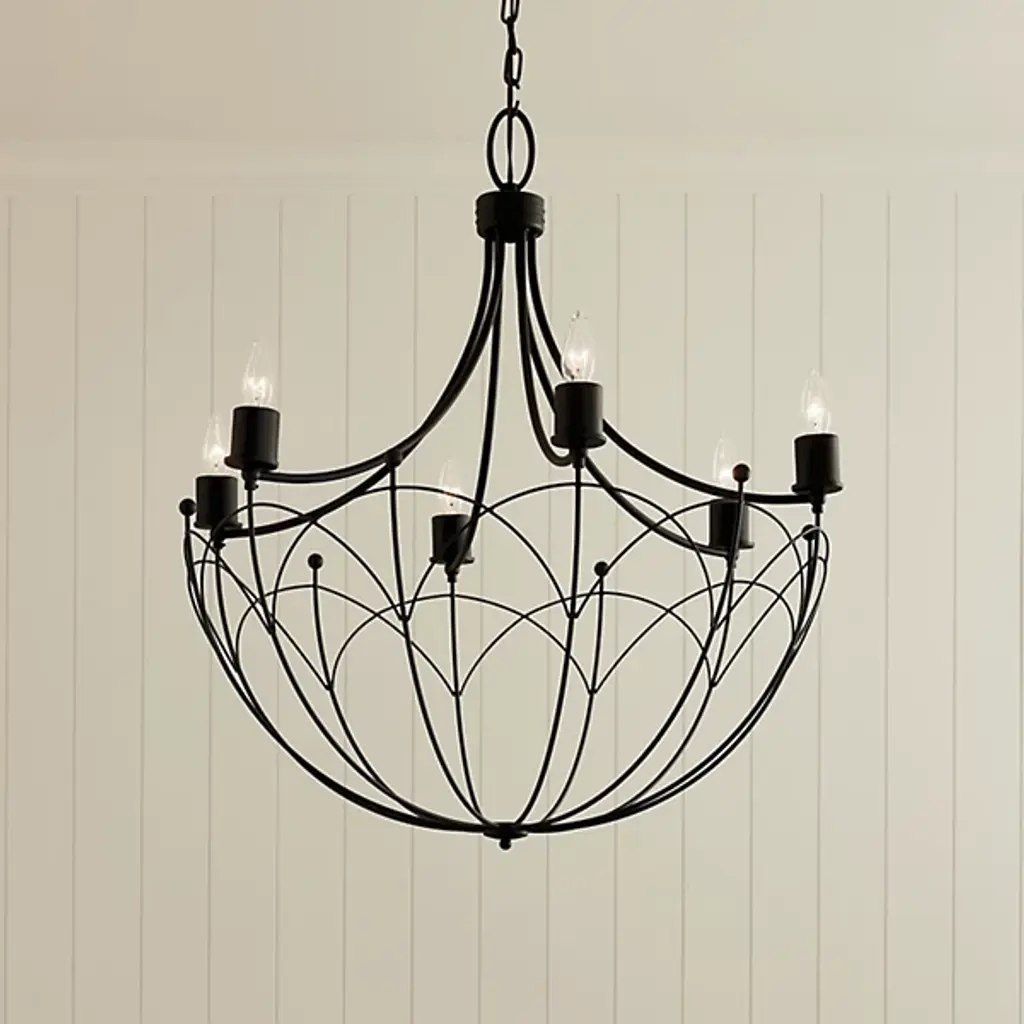 Give your contemporary home an ornate appearance with the Topiary Chandelier by Kichler. Fine steel forms a downward-facing dome silhouette that draws your gaze. This chandelier is lined with flame-shaped bulbs perched atop petite, cylindrical casings. The Topiary Chandelier brings a candlelight sensibility into the 21st century. A canopy at your ceiling facilitates this fixture’s midair suspension by securing a chain of links. The chandelier’s incandescent bulbs are arranged in a carousel fashion, letting light emit from effortlessly from overhead.