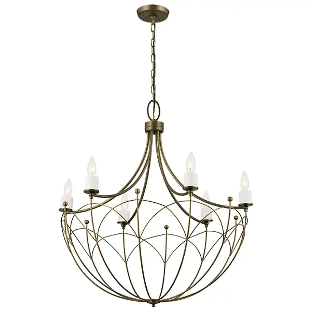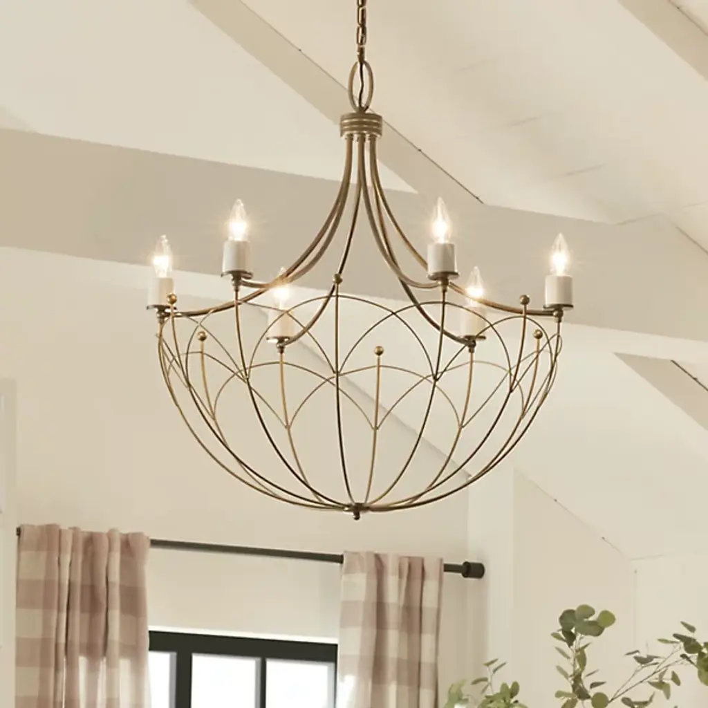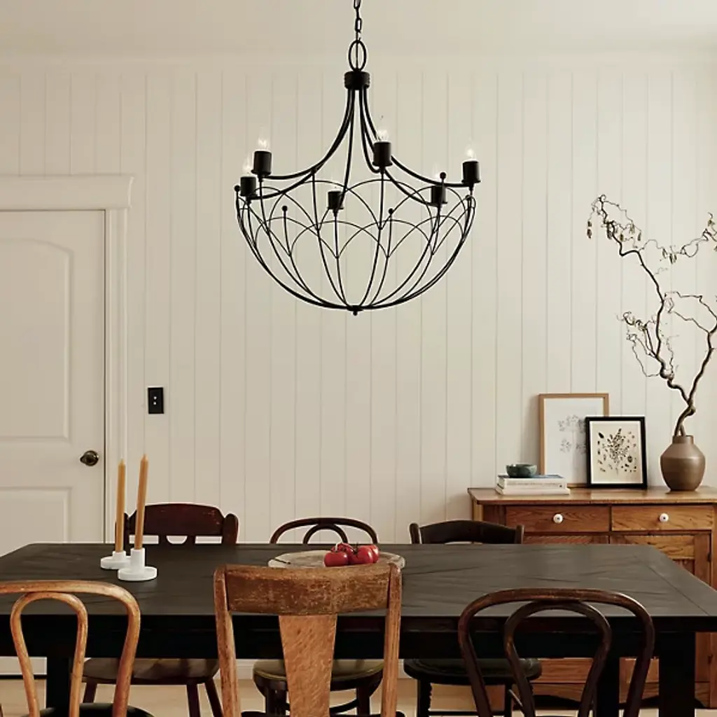 Give your contemporary home an ornate appearance with the Topiary Chandelier by Kichler. Fine steel forms a downward-facing dome silhouette that draws your gaze. This chandelier is lined with flame-shaped bulbs perched atop petite, cylindrical casings. The Topiary Chandelier brings a candlelight sensibility into the 21st century. A canopy at your ceiling facilitates this fixture’s midair suspension by securing a chain of links. The chandelier’s incandescent bulbs are arranged in a carousel fashion, letting light emit from effortlessly from overhead.