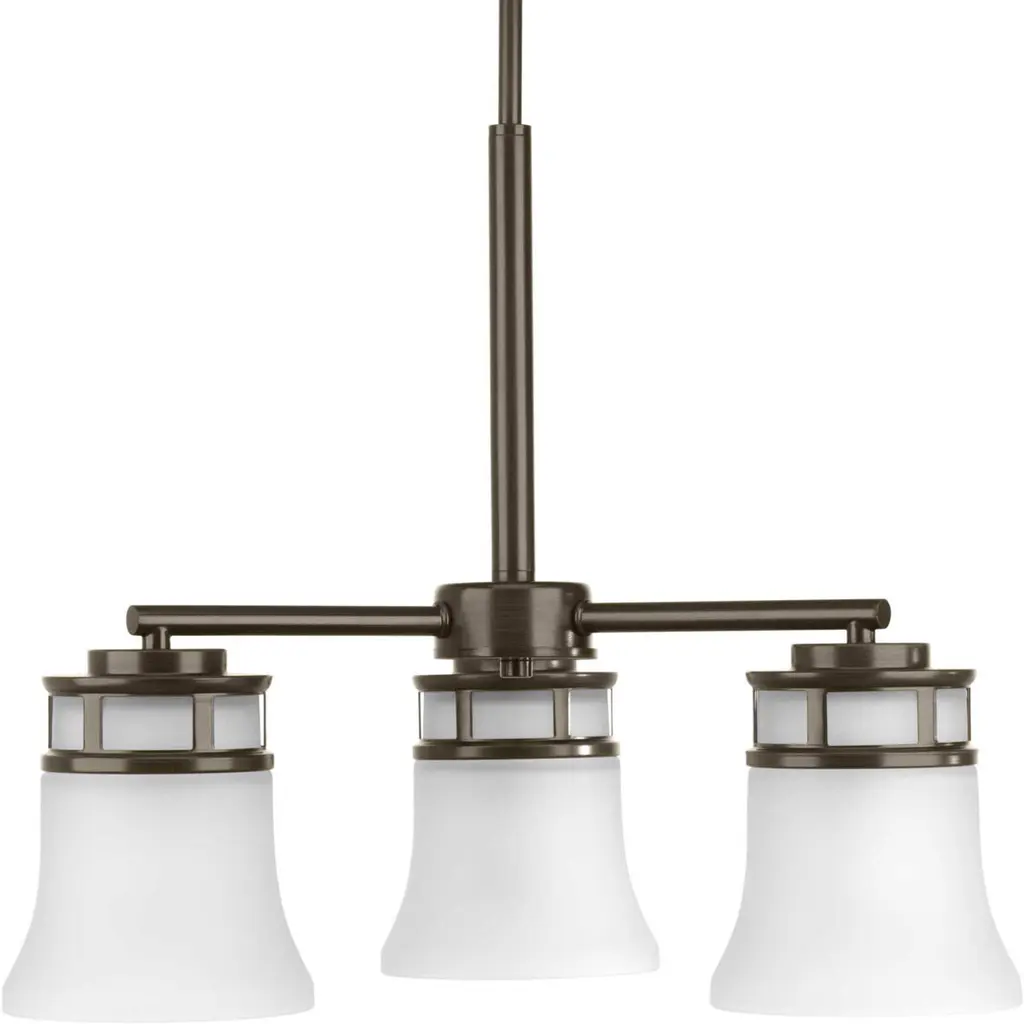 Topsail features a graceful curving frame paired with elegant parchment-finish glass shades to create a clean, modern form. Classic metal fittings enhance the crisp appearance of warm Antique Bronze finish. This three-light chandelier provides the perfect complement to coastal-inspired or casual decor.