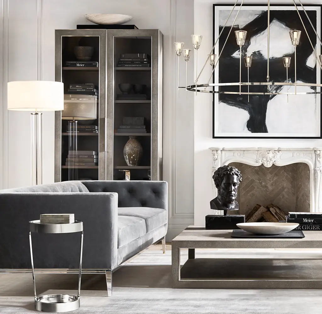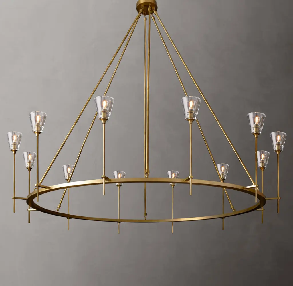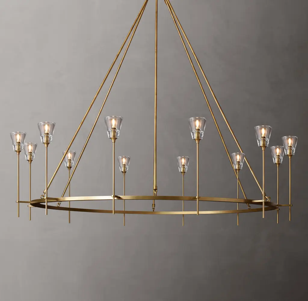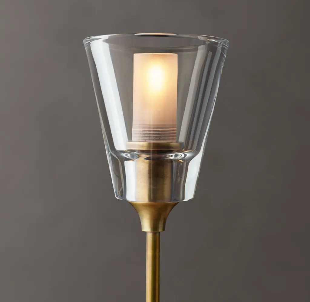 The torch form is distilled to its essence in this chandelier from acclaimed lighting designer Jonathan Browning. The tapered glass shades are reminiscent of French neoclassical designs, while the solid brass frame is decidedly modern. SHOP THE ENTIRE COLLECTION