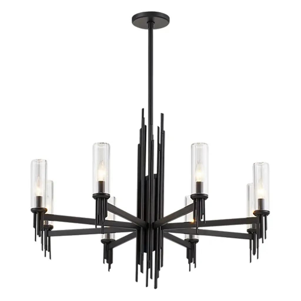 The Torres Ribbed Glass Chandelier is presented by Alora Lighting. Inspired by the resurgence of brutalist art and architecture, this chandelier is stark and striking in design. Expertly forged metalwork defines the Torres, featuring ribbed glass shades for a diffusion of light and a mid-mod inspired yet contemporary industrial influence in the composition.