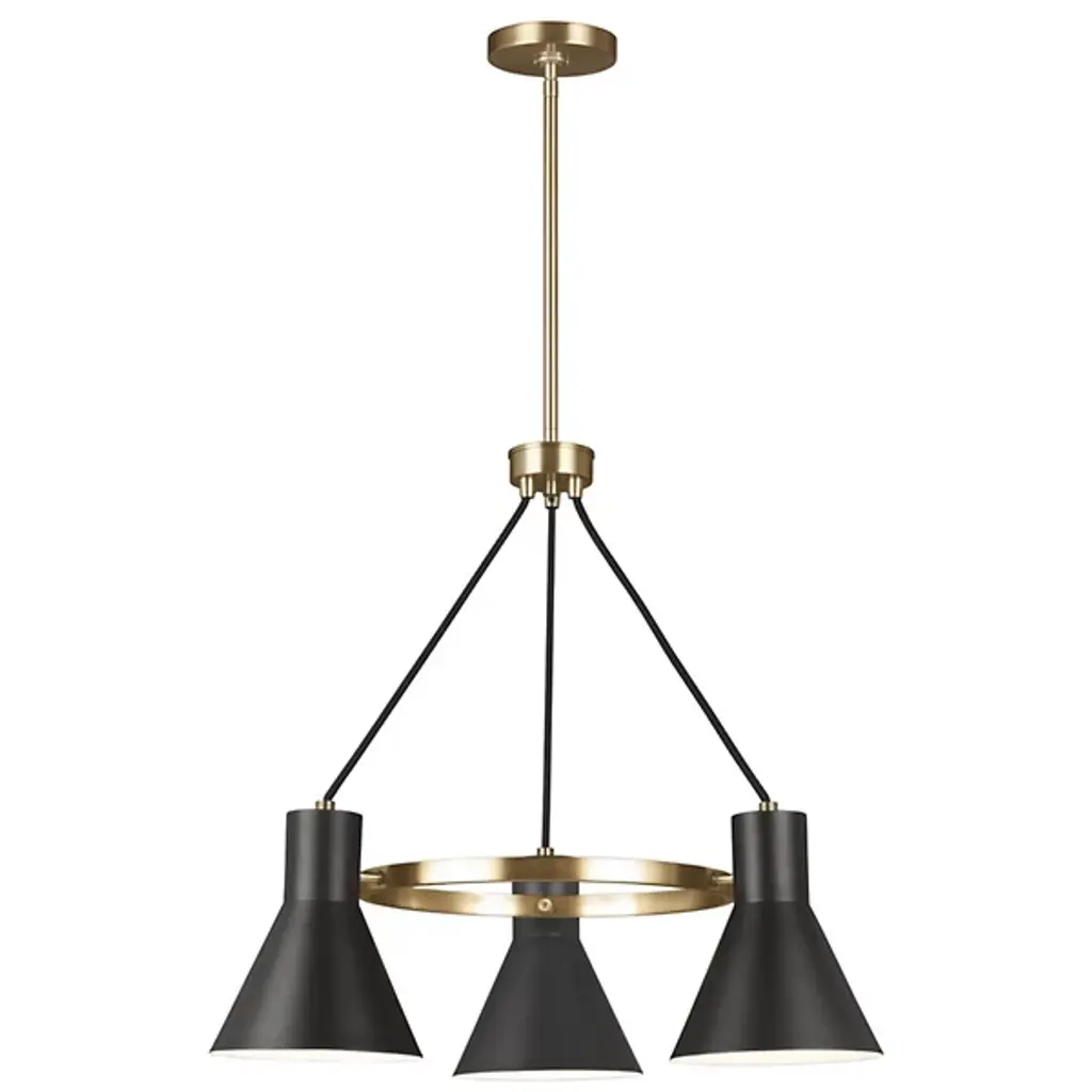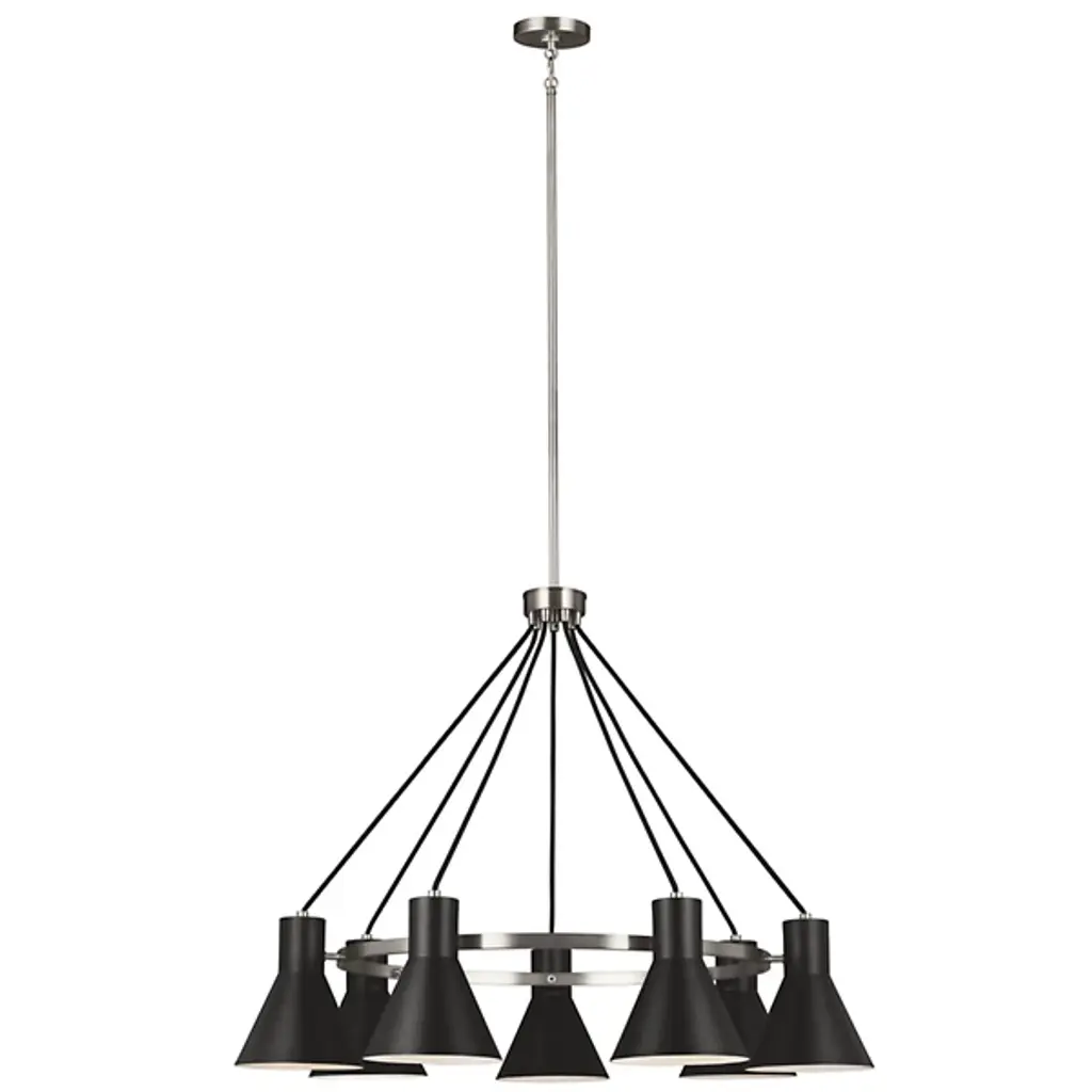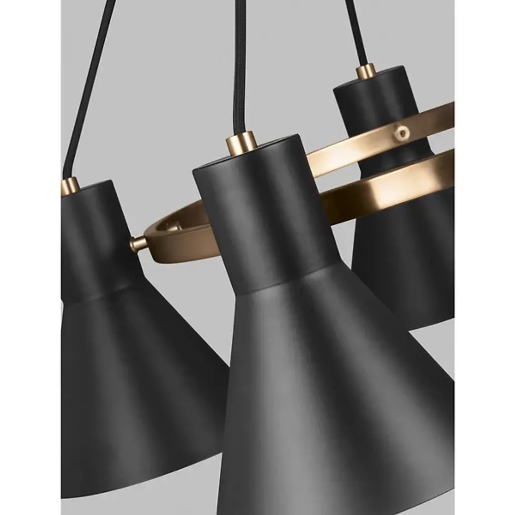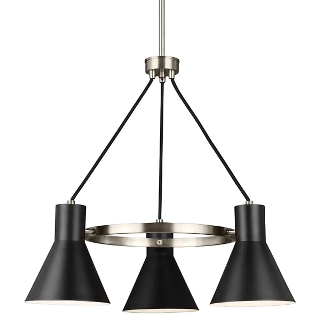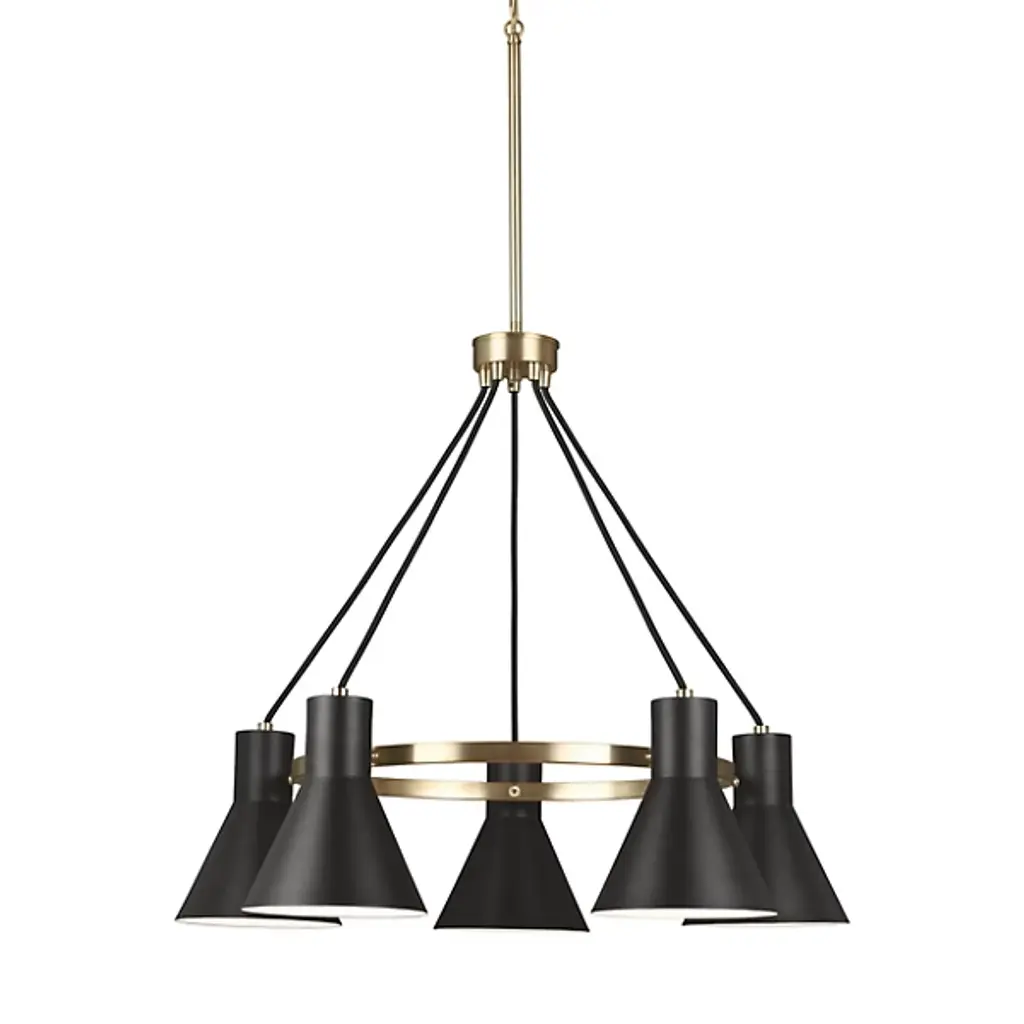 The Generation Lighting, formerly known as Sea Gull Lighting, Towner Chandelier uses retro style to set off the appearance of this fixture. A central circular band supports multiple shades while textured Black cloth cords provide power and aesthetics. These cords join at a multi-point canopy that is hung from the ceiling with a stem. Stem is height adjustable at installation.