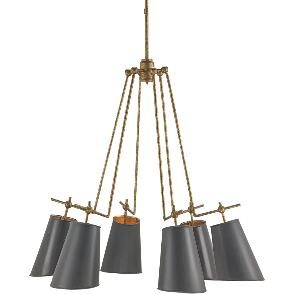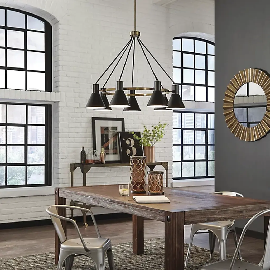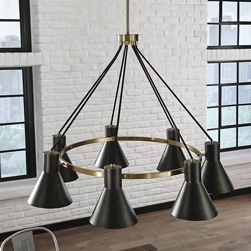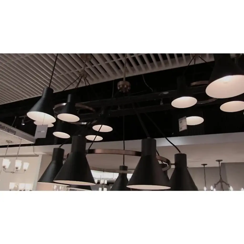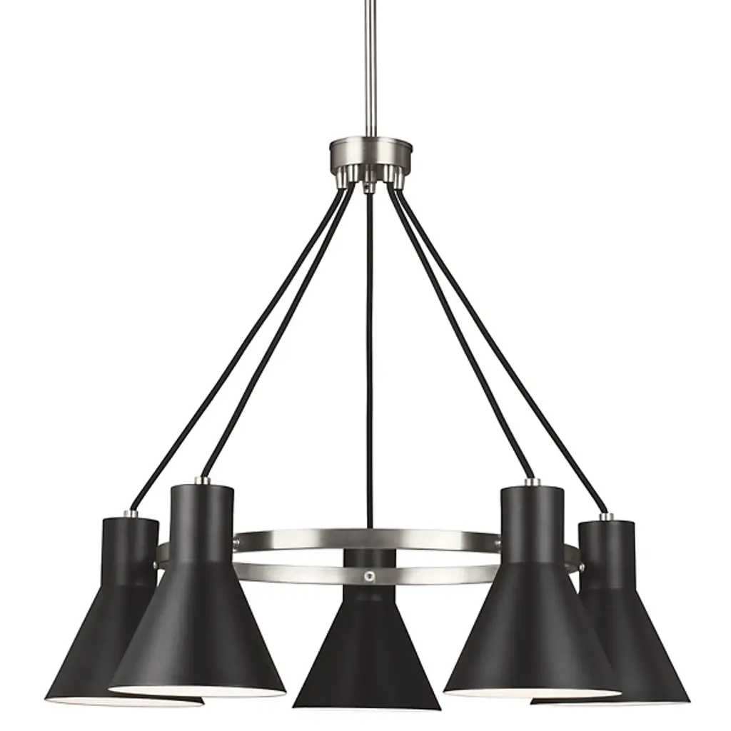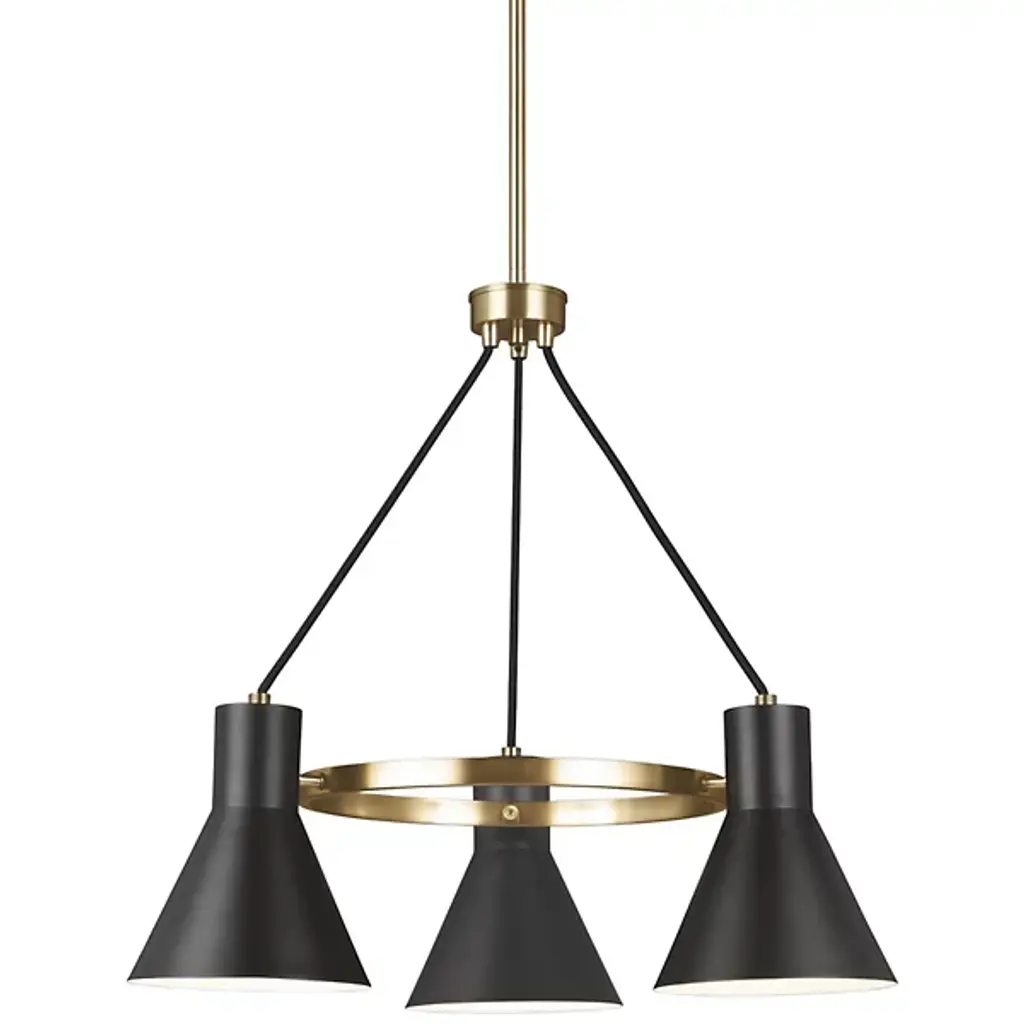 The Generation Lighting, formerly known as Sea Gull Lighting, Towner Chandelier uses retro style to set off the appearance of this fixture. A central circular band supports multiple shades while textured Black cloth cords provide power and aesthetics. These cords join at a multi-point canopy that is hung from the ceiling with a stem. Stem is height adjustable at installation.