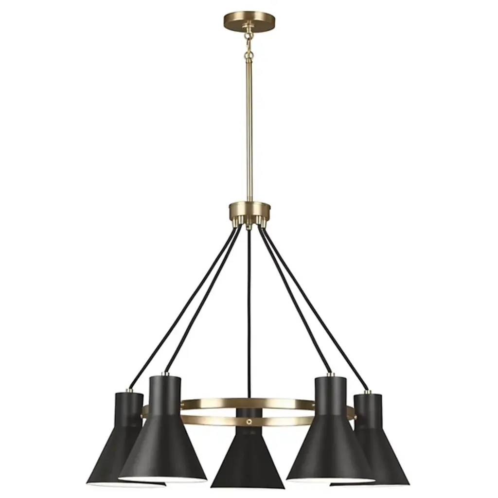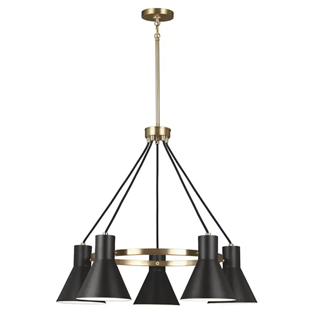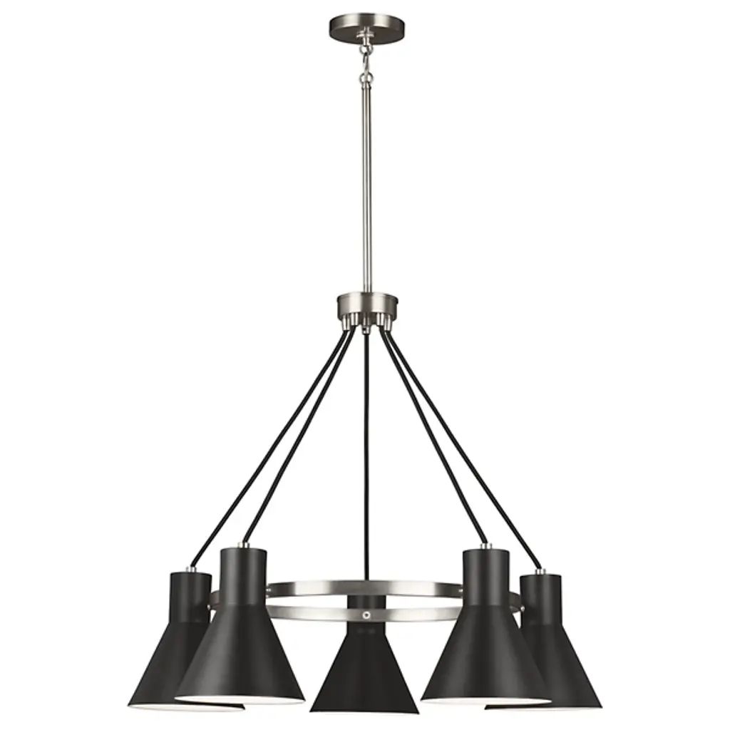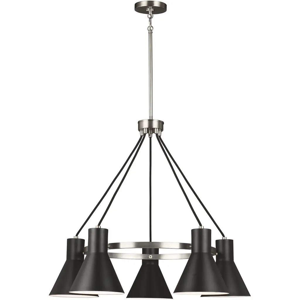The Generation Lighting, formerly known as Sea Gull Lighting, Towner Chandelier uses retro style to set off the appearance of this fixture. A central circular band supports multiple shades while textured Black cloth cords provide power and aesthetics. These cords join at a multi-point canopy that is hung from the ceiling with a stem. Stem is height adjustable at installation.