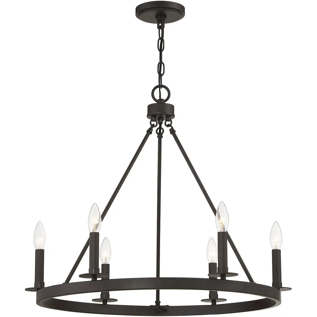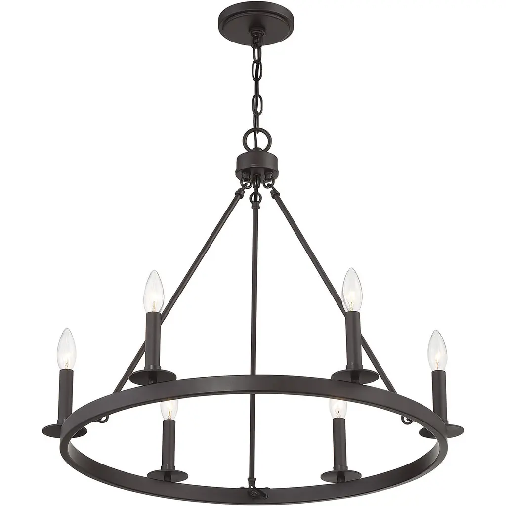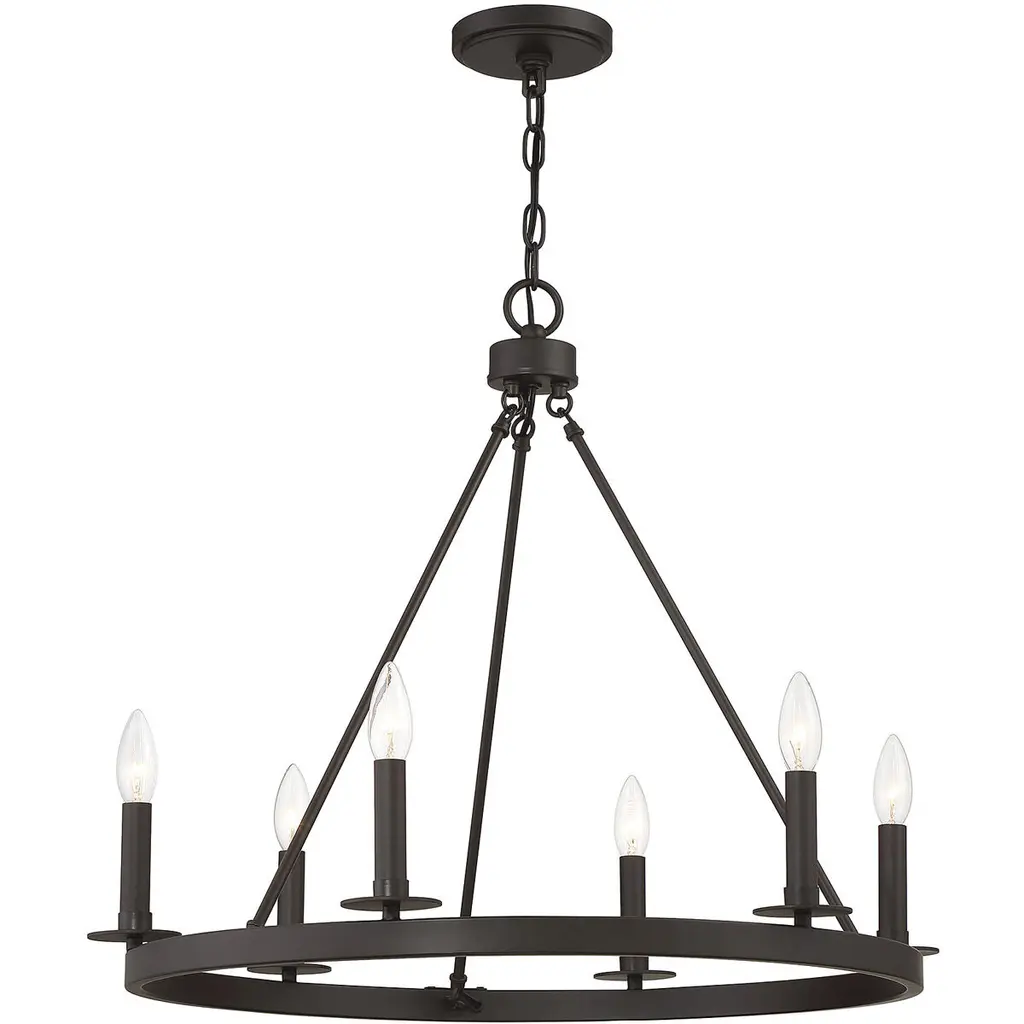 Featuring a stylish wagon-wheel shape, this Meridian 6-light chandelier offers up chic and versatile lighting for a wide variety of spaces and decor styles. Use it to brighten up a dining table, a living room, a bedroomthe possibilities are endless Finished in oil rubbed bronze. This chandelier is 22" in height and 26" in width, plus it includes 120" of chain to let you adjust the height. This chandelier uses 6 candelabra size bulbs of up to 60 watts each, is LED compatible and is dimmable.