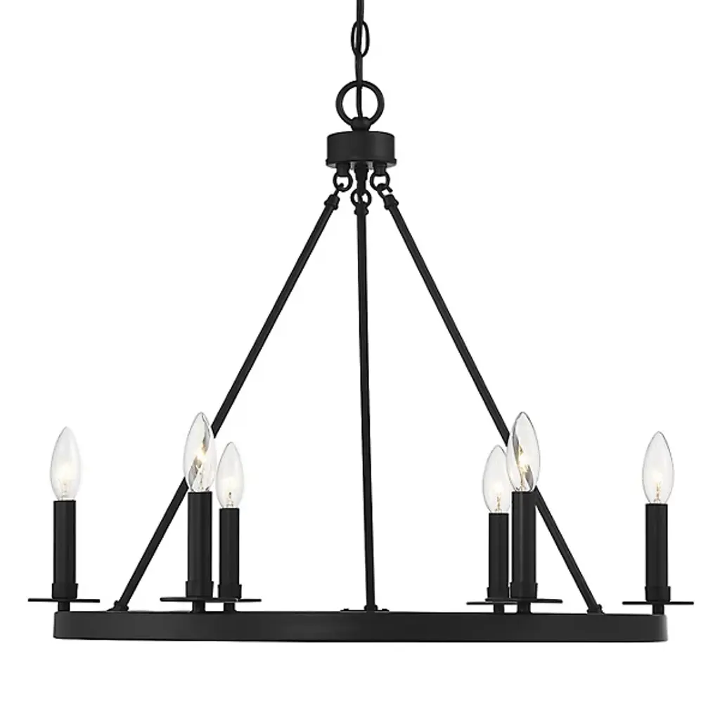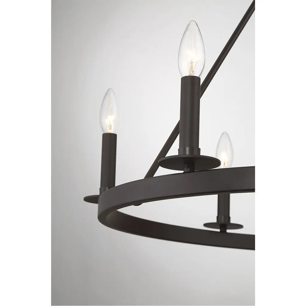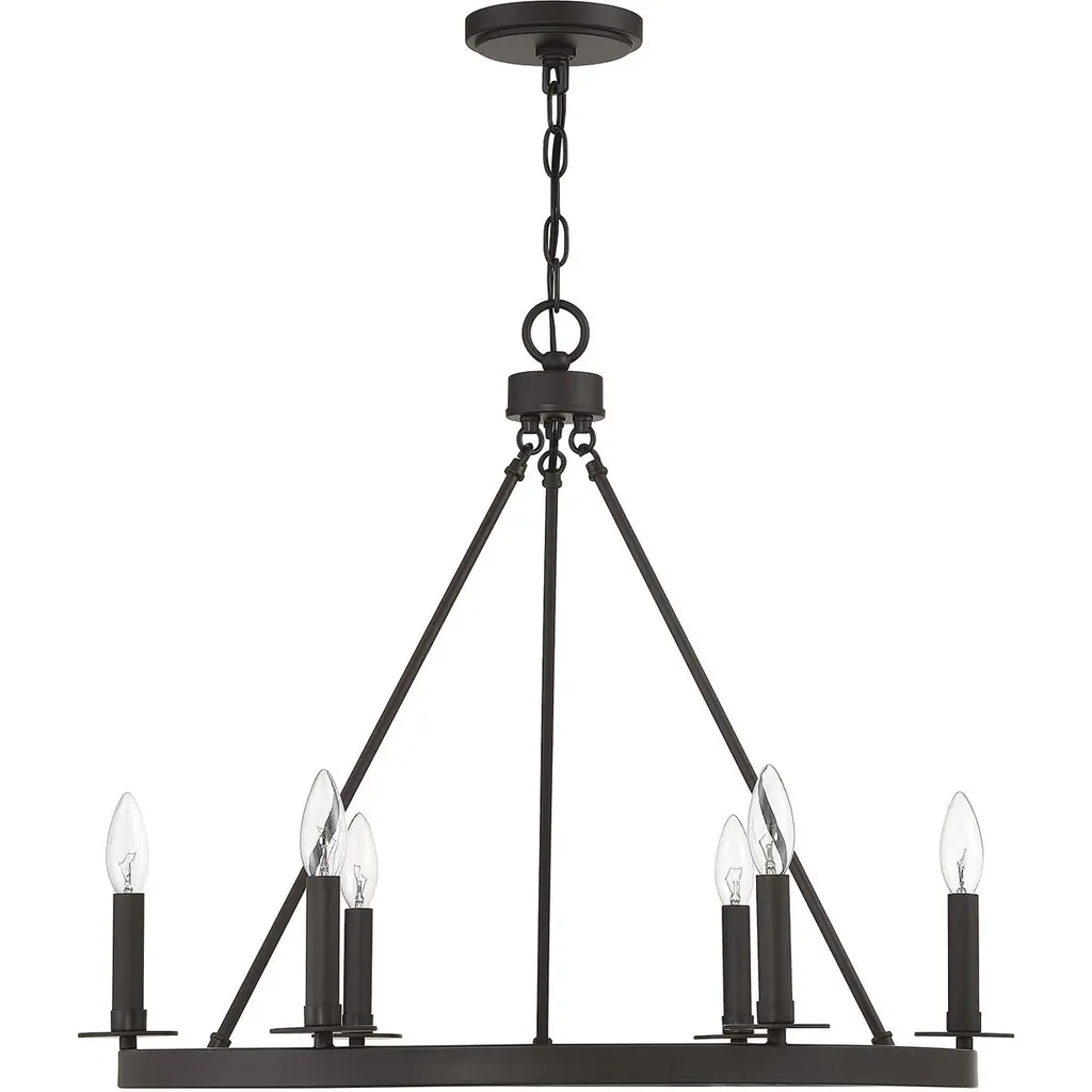 Featuring a stylish wagon-wheel shape, this Meridian 6-light chandelier offers up chic and versatile lighting for a wide variety of spaces and decor styles. Use it to brighten up a dining table, a living room, a bedroomthe possibilities are endless Finished in oil rubbed bronze. This chandelier is 22" in height and 26" in width, plus it includes 120" of chain to let you adjust the height. This chandelier uses 6 candelabra size bulbs of up to 60 watts each, is LED compatible and is dimmable.