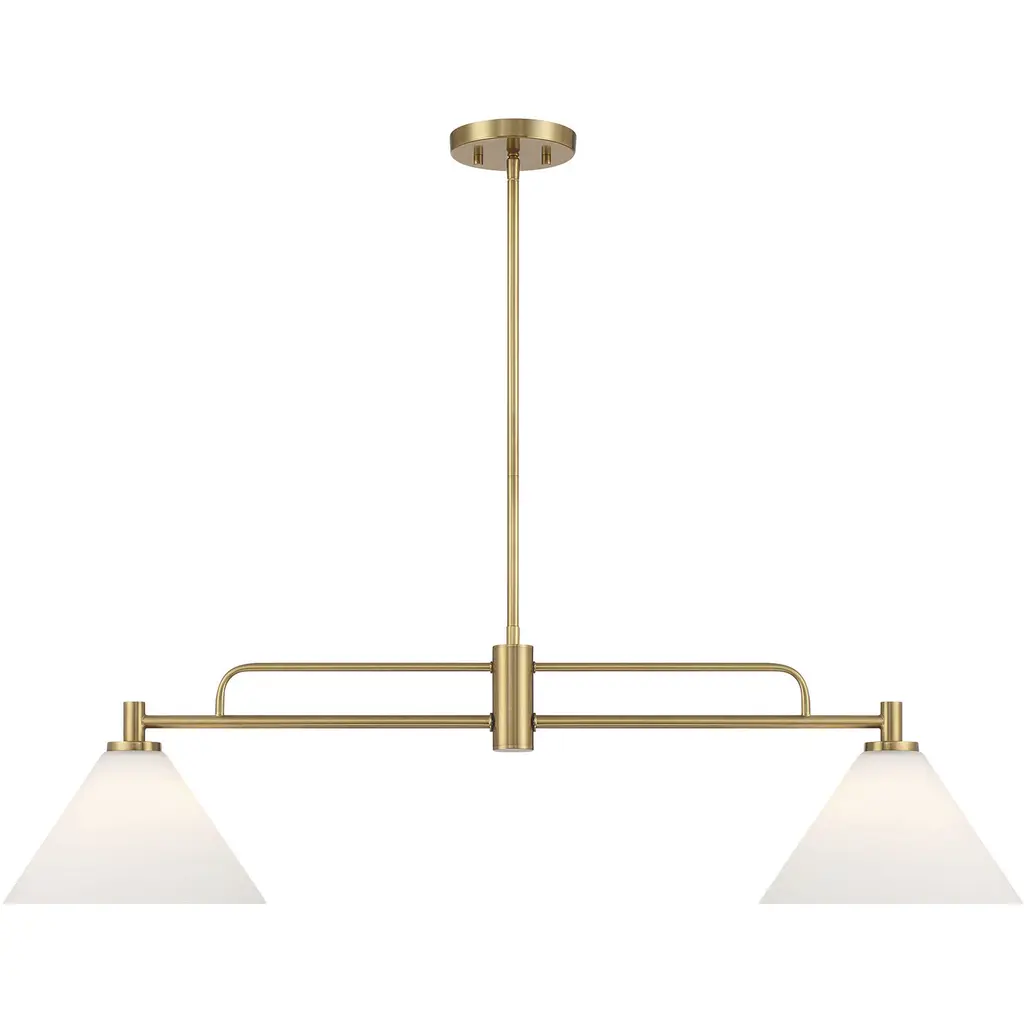 This crisp and elegant 2-light island pendant is a perfect way to illuminate a kitchen island, a long dining table, a billiards room or any other stylish space. Conical shades of opal white glass provide bright, smooth light. Understated detailing, finished in Natural Brass, adds a thoughtful touch. Adjustable height ranges from 10" to 64". Comes with eight 12" downrods and two 6" downrods. 40" in width. Uses 2 standard size bulbs of up to 60 watts per bulb. Bulbs not included.
