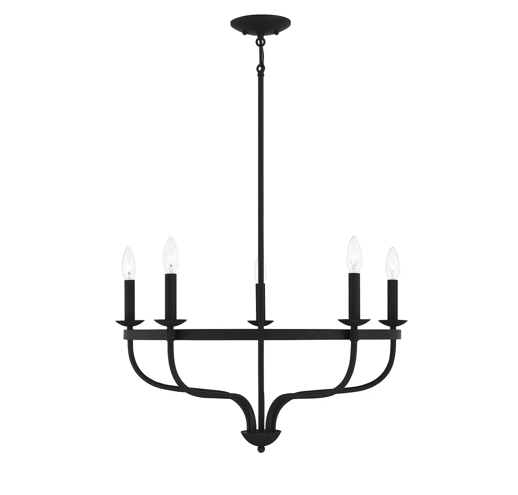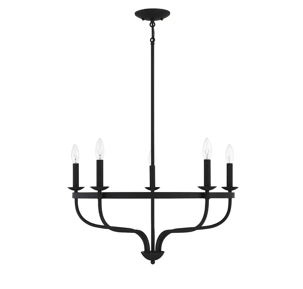 The sleek simplicity of this Meridian 5-light chandelier gives it versatility and makes it work well in a wide variety of decor styles, including transitional, farmhouse and even modern. It is finished in matte black, too, so it can go with anything. This chandelier is 14.5" in height and 26.63" in width, plus it includes four 12" downrods and one 6" downrod to let you adjust the height for a maximum of 68.5". This chandelier uses 5 candelabra size bulbs of up to 60 watts each, is LED compatible and is dimmable. You can use this chandelier on a sloped ceiling.