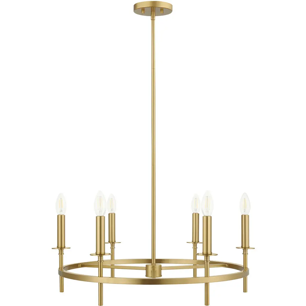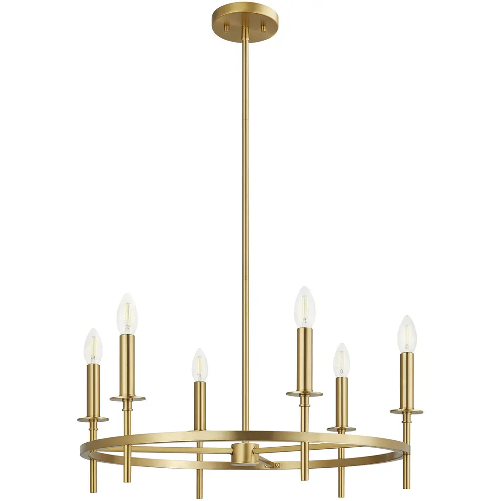 Discover an elegant lighting look with this 6-light chandelier. It showcases an understated style accentuated by stylized bobeches and is dressed in a Natural Brass finish. It is 9" in height and 25" in width. Uses six candelabra size bulbs of up to 60 watts per bulb. Bulbs not included.
