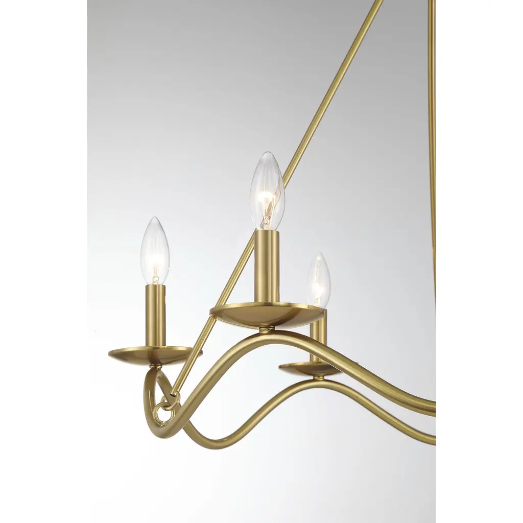 Traditional chandelier style is given a fun touch of movement in this 6-light chandelier. An undulating frame is finished in Natural Brass and dotted with sleek bobeches holding elegantly exposed bulbs. This is a perfect way to freshen up the look of any room The chandelier is 22.5" in height and 28" in width. It uses 6 candelabra size bulbs of up to 60 watts per bulb. Bulbs not included.