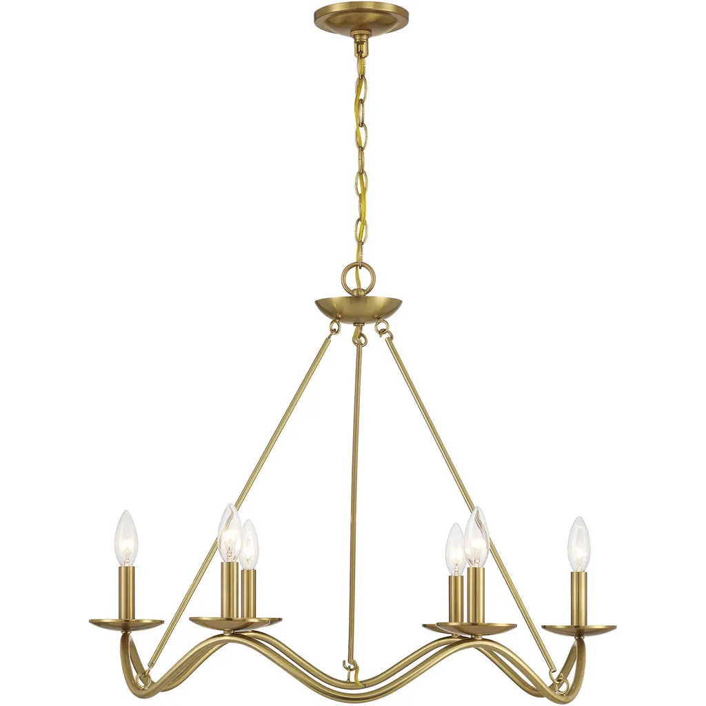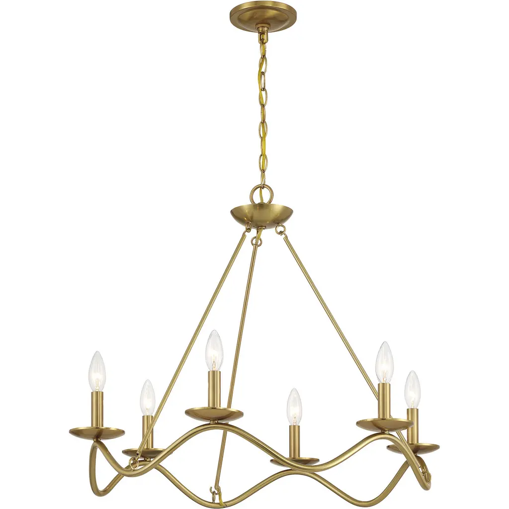 Traditional chandelier style is given a fun touch of movement in this 6-light chandelier. An undulating frame is finished in Natural Brass and dotted with sleek bobeches holding elegantly exposed bulbs. This is a perfect way to freshen up the look of any room The chandelier is 22.5" in height and 28" in width. It uses 6 candelabra size bulbs of up to 60 watts per bulb. Bulbs not included.