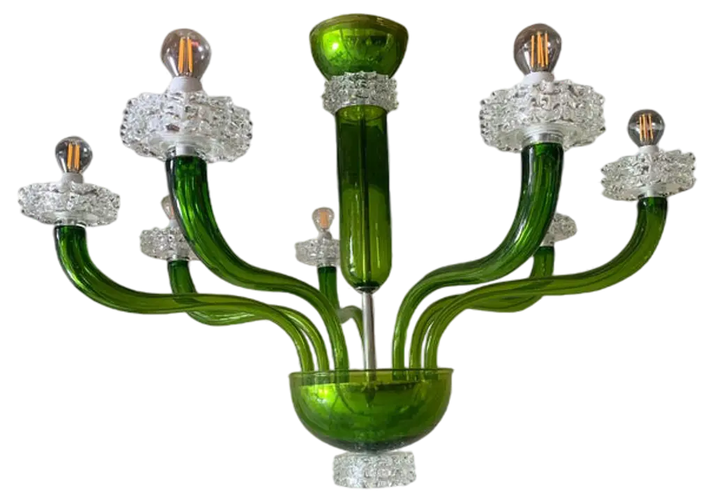 Contemporary murano glass chandelier in decò style decorated in translucent apple-green color which makes it extremely modern and luxurious. 6 bulbs, not included, compatible with led sustainability. chain 50 cm = 19.7″ more canopy design ad production made in italy. Murano glass, murano attributed. ship from italy not assembly d 80cm h 80cm/ d 31.9" h 31.9" only chandelier us plug (up to 110v).