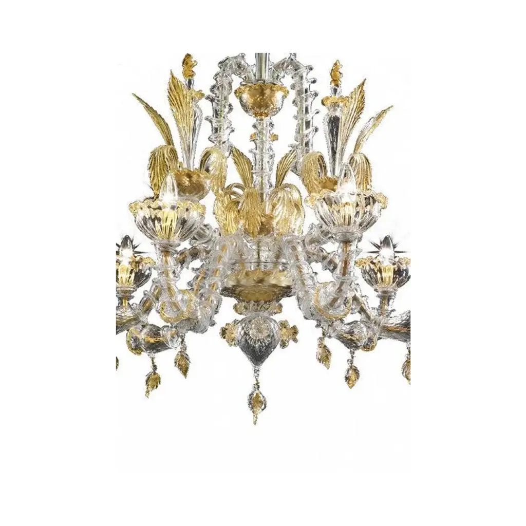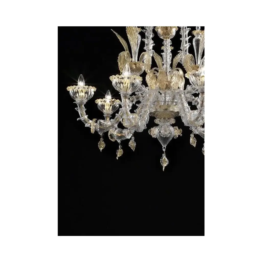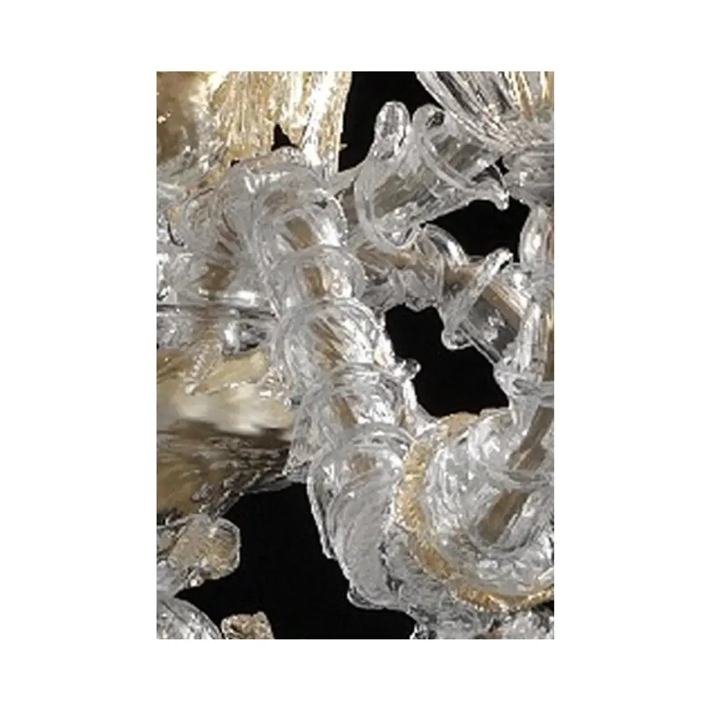 Venetian "ca' rezzonico" transparent and gold murano glass chandelier with flowers and leaves classical transparent murano glass chandelier with flowers and leaves, full of gold-leaf inside. traditional piece of italian art of blowing glass. Very elegant for classical and modern interiors. Design ad production made in italy. made in murano glass, very hand-made working glass, fruit of high italian craftsmanship. 6 bulbs, not included, compatible with led sustainability. chain 50 cm = 19.7″ more canopy lot of 2 or a pair of chandeliers ship from italy not assembled diameter 100cm height 120cm/ d.40” h.48” us plug (up to 110v).