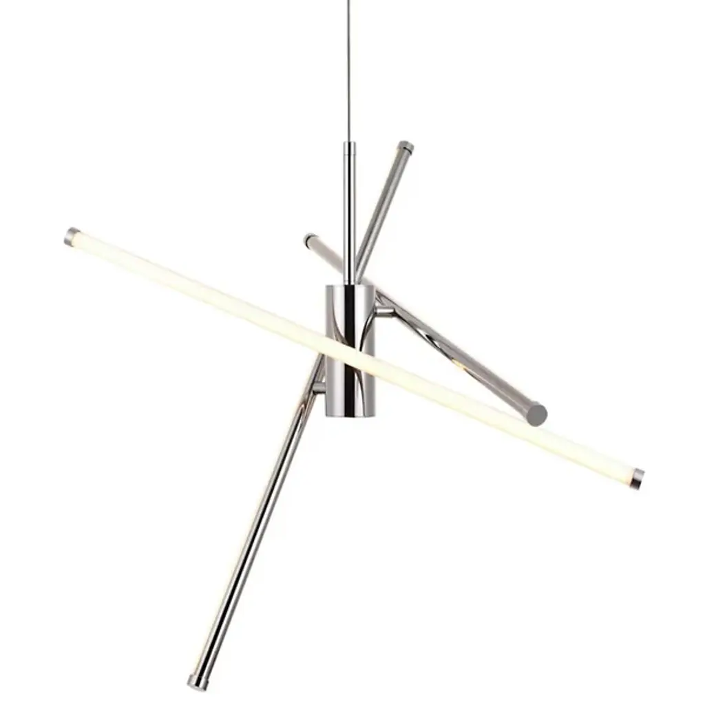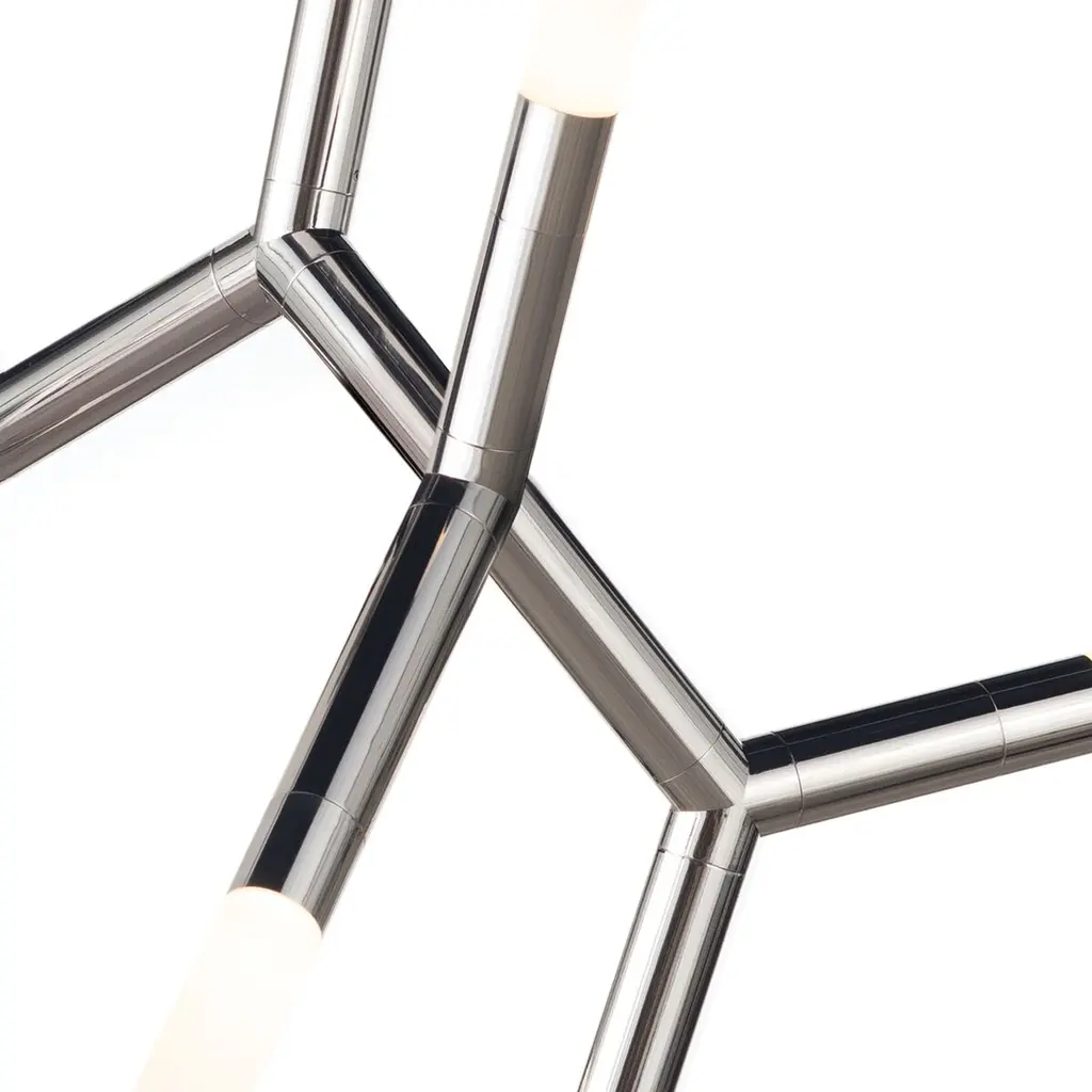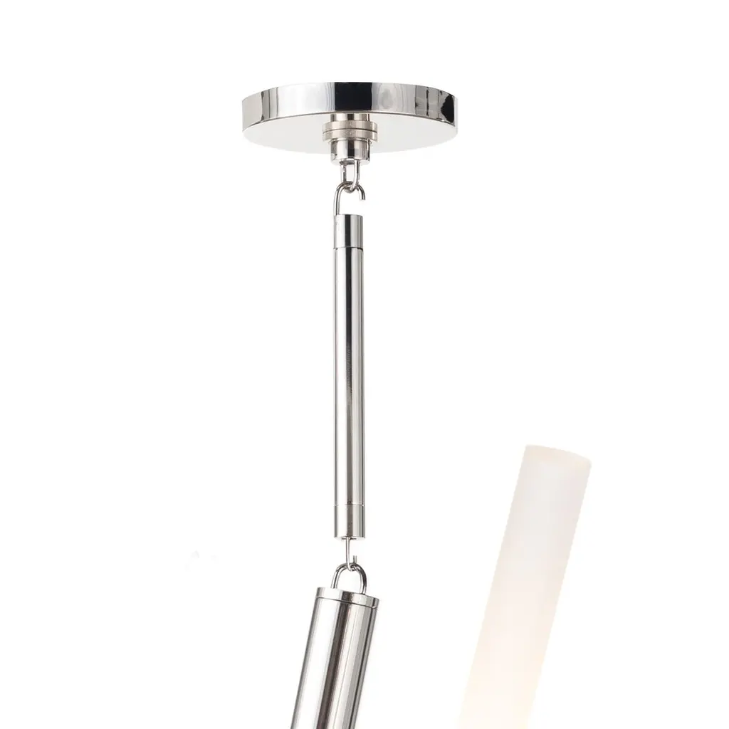 This sculptural chandelier was engineered to hang at a slight angle—just one reason it's certain to command attention. There's also its lustrous finish and unexpected asymmetry. The seven frosted acrylic bulb covers ensure soft, flattering illumination.
