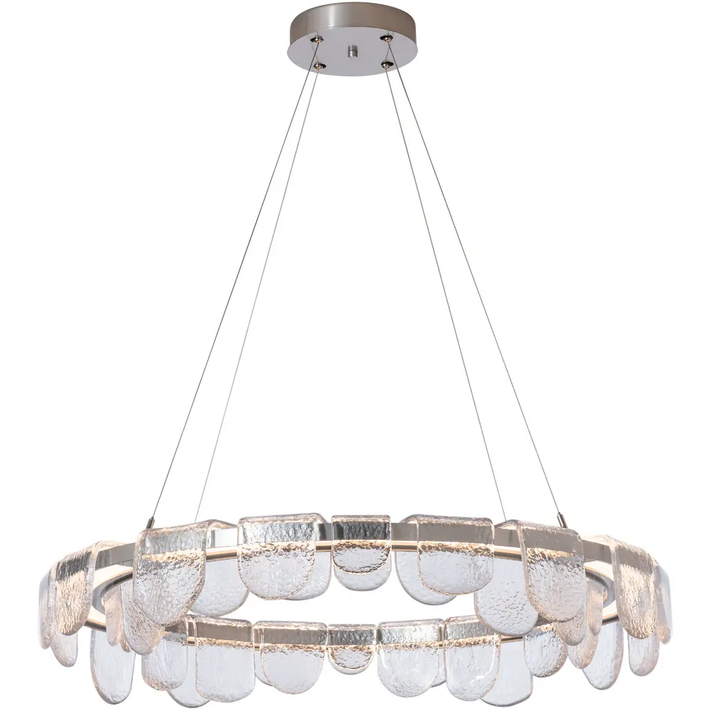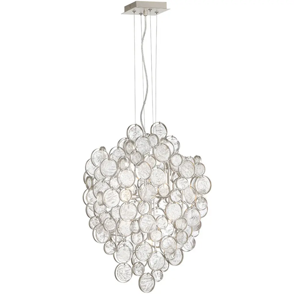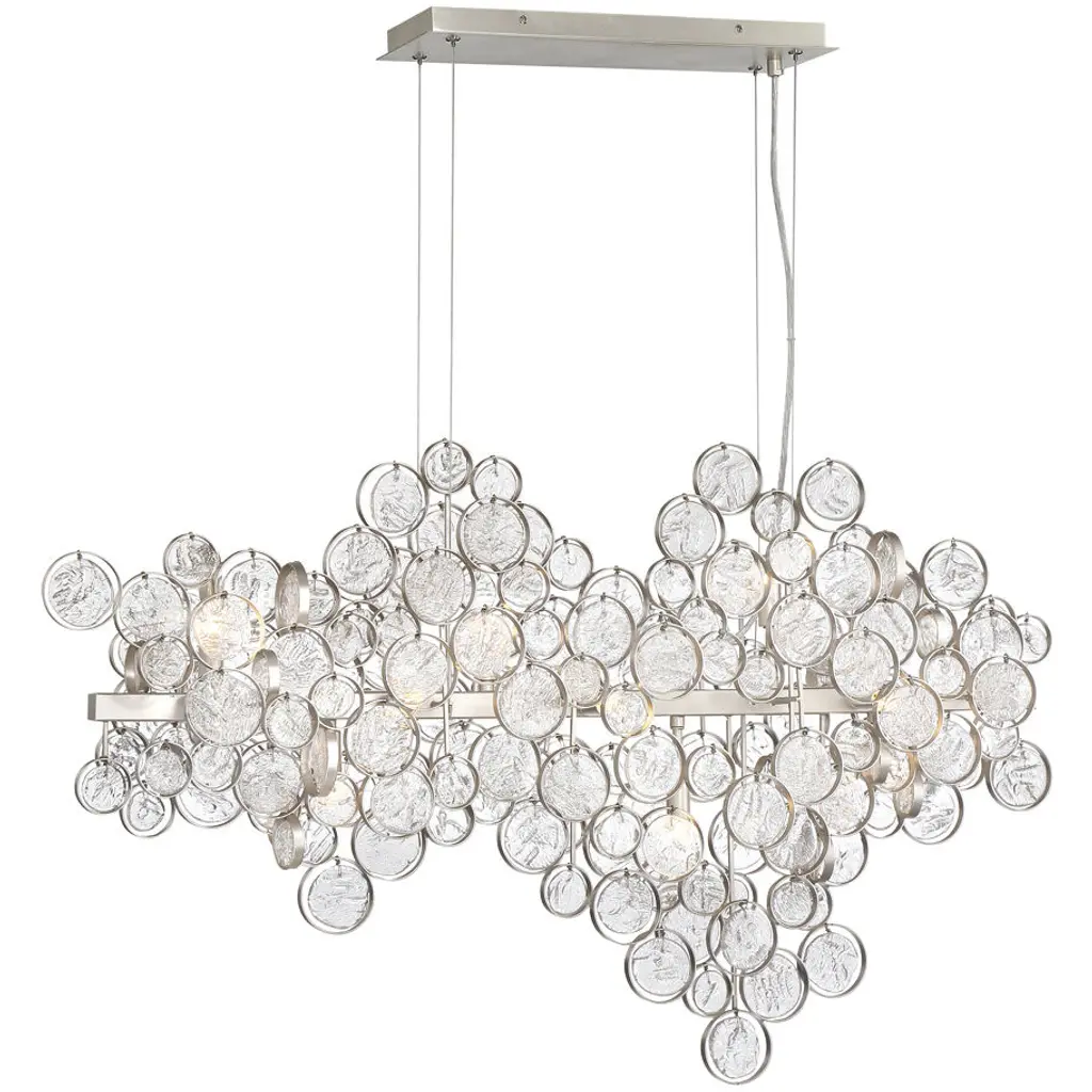 Intricate champagne silver or antique gold frames delicately hand strung glass wafers. The pressed glass, each one a distinguished piece of craftsmanship, float beautifully like clouds.