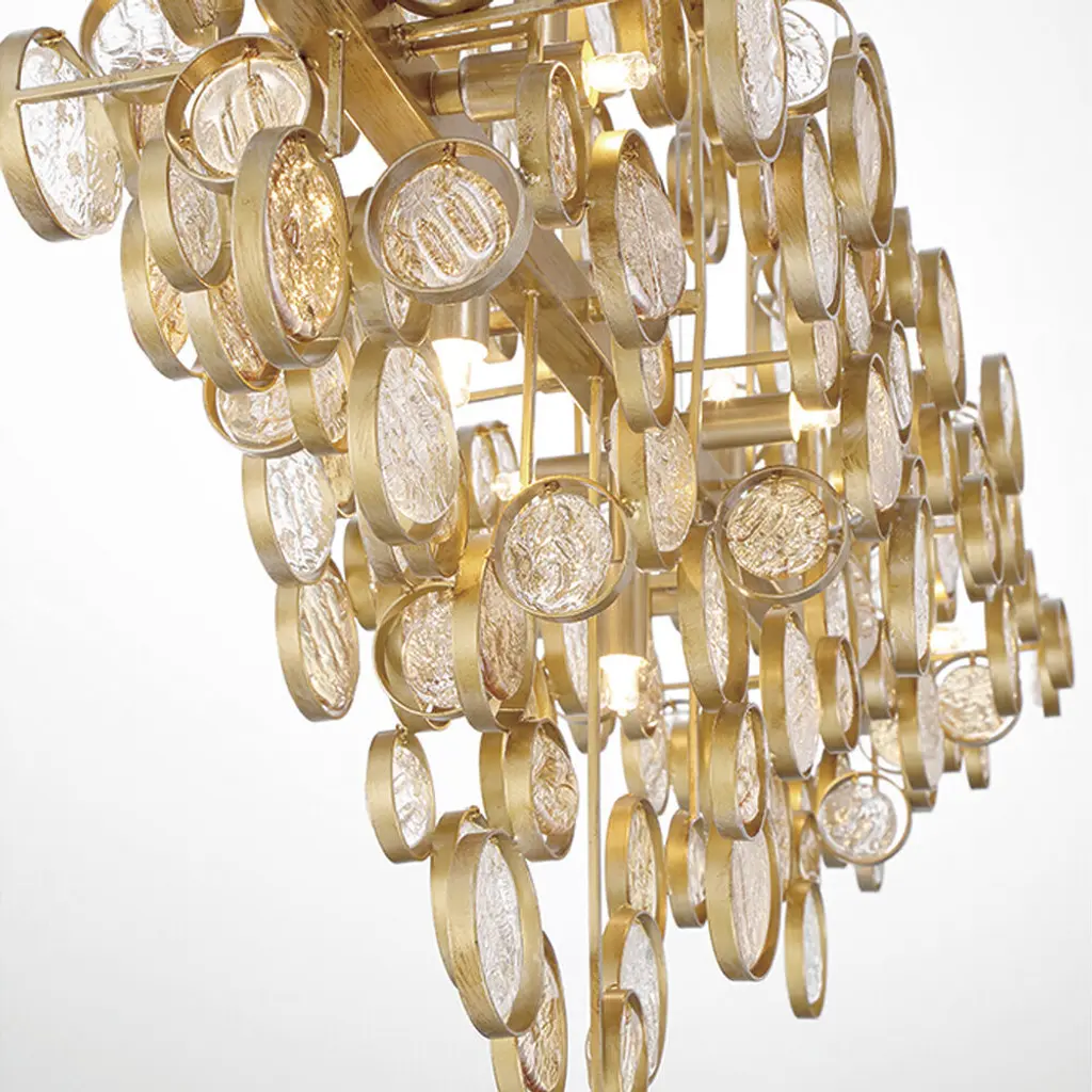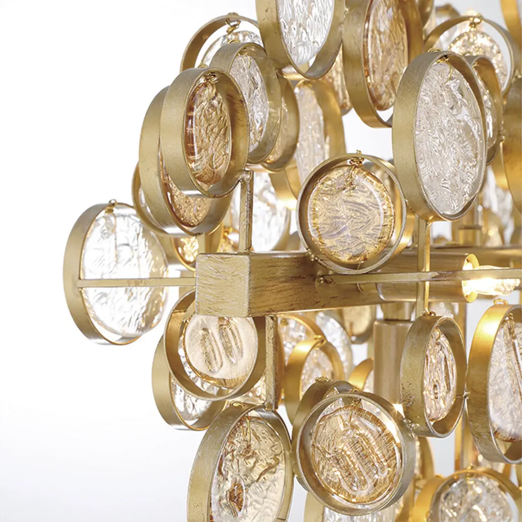 Intricate champagne silver or antique gold frames delicately hand strung glass wafers. The pressed glass, each one a distinguished piece of craftsmanship, float beautifully like clouds.