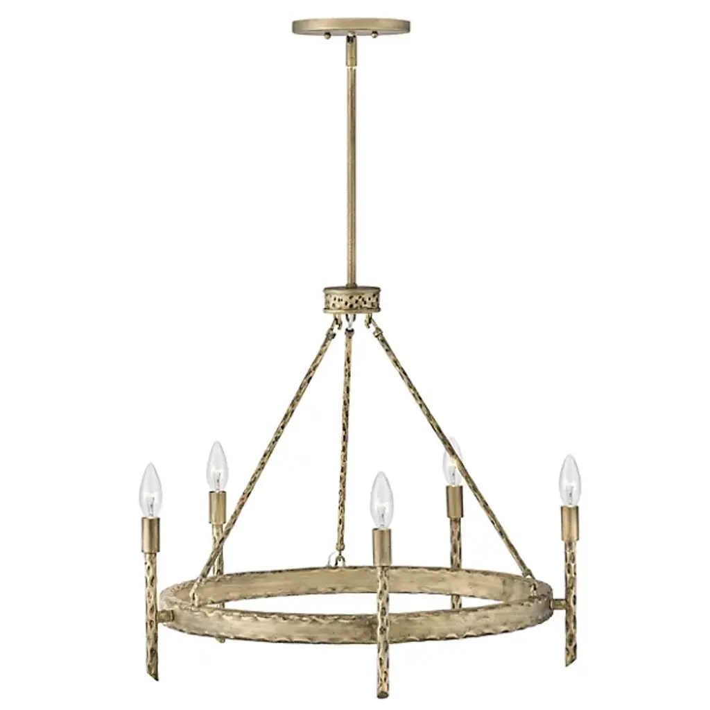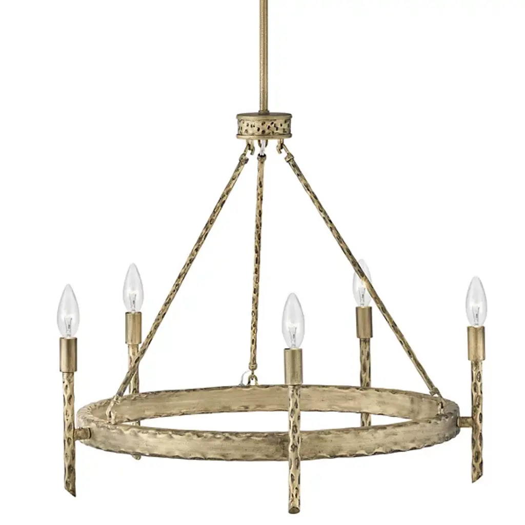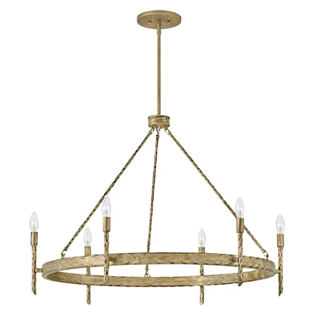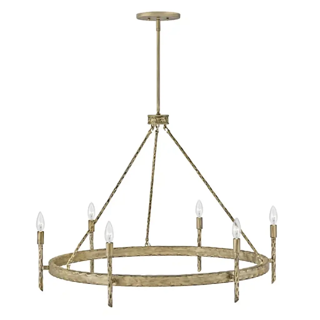 An open, transitional design replete with hand-hammered character. Descending from a sleek, disc-shaped canopy, the Tress Chandelier from Hinkley Lighting seats a rounded hub beneath a slender downrod, dispatching three slender stems down to a slender ring below. Below the stem and canopy, each metal surface is enhanced by hand-hammered marks, while a series of vertical rods with bevel-cut ends are arranged around the outer surface of the horizontal ring. These rods support open candelabra-style lamping rising from smooth single sockets that blaze out around the fixture, burnishing the supportive metal structure with a warm ambiance.