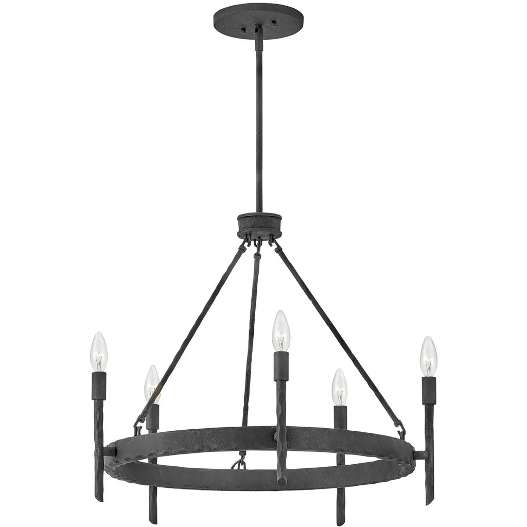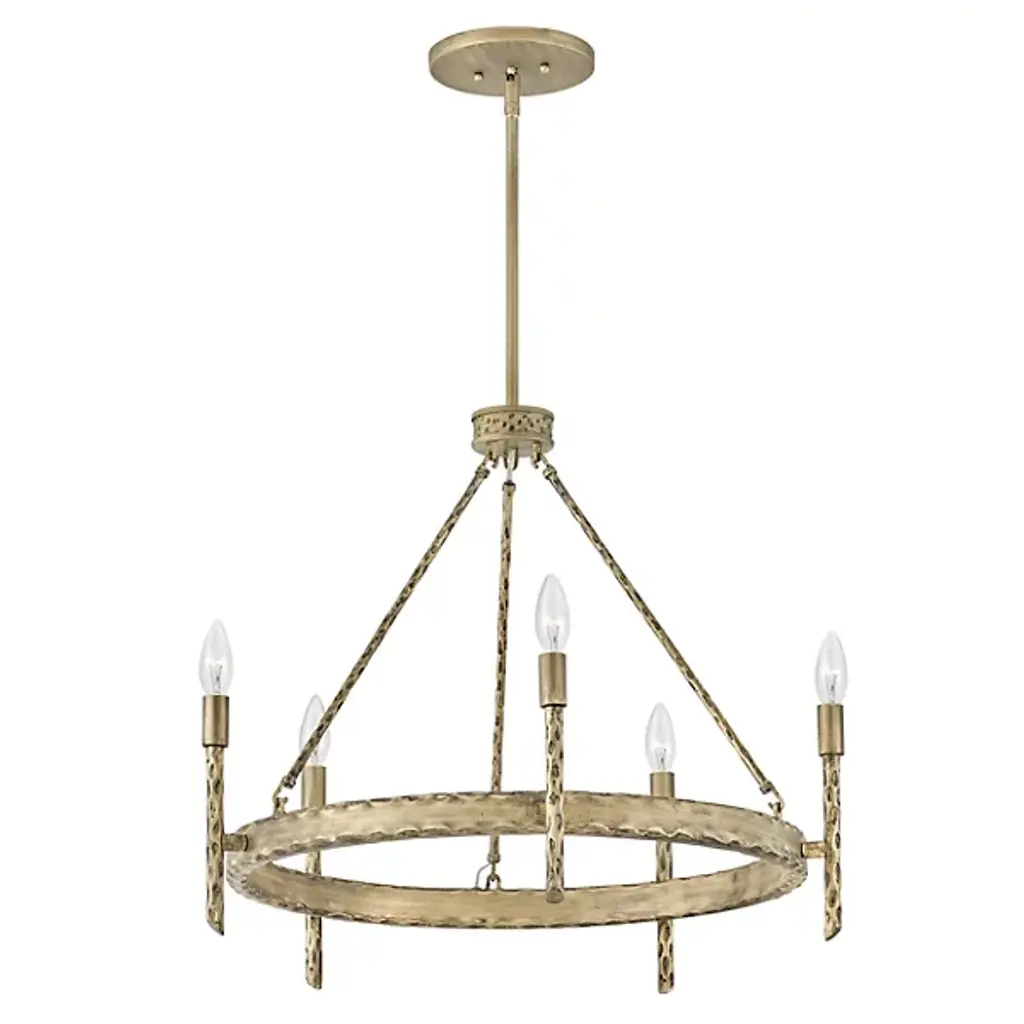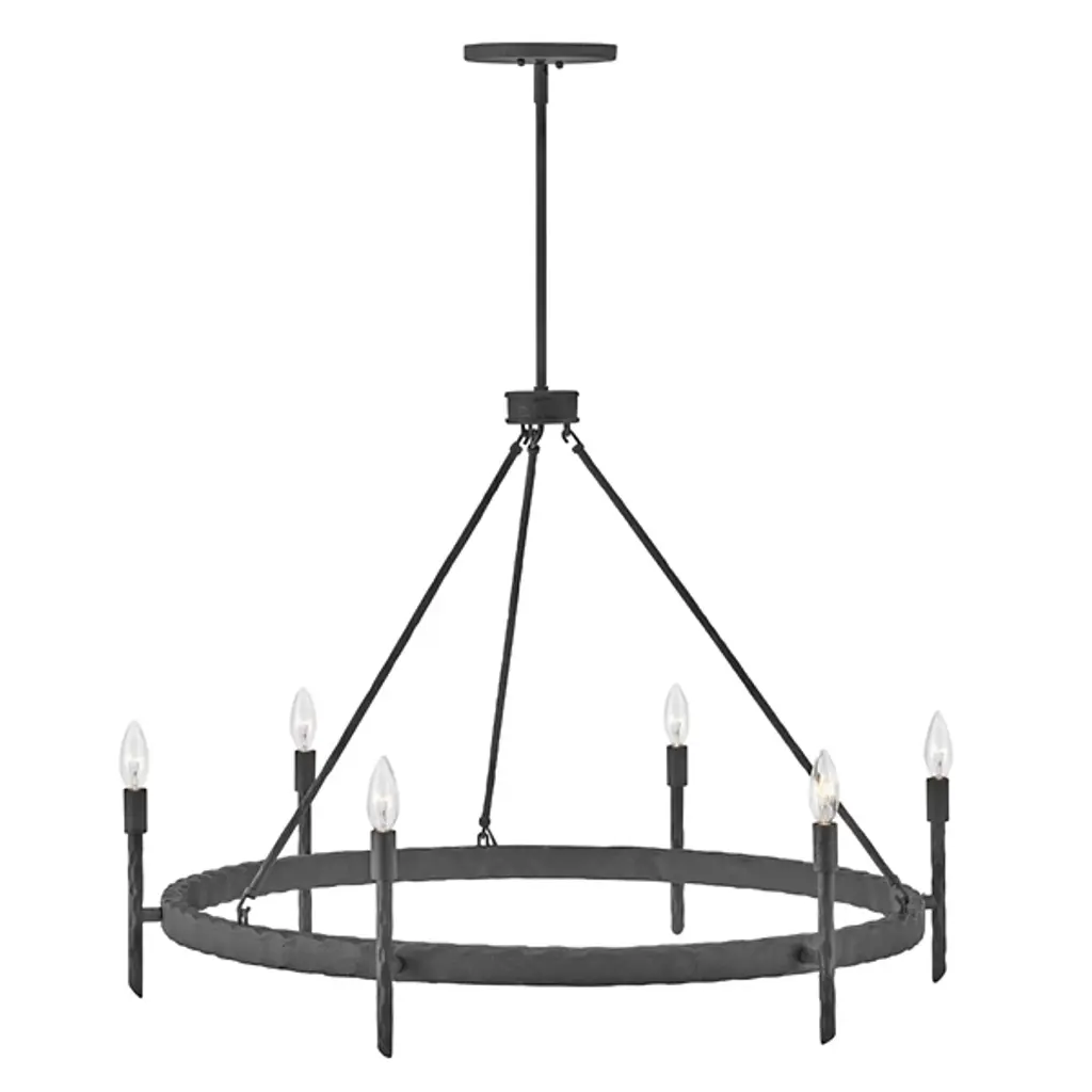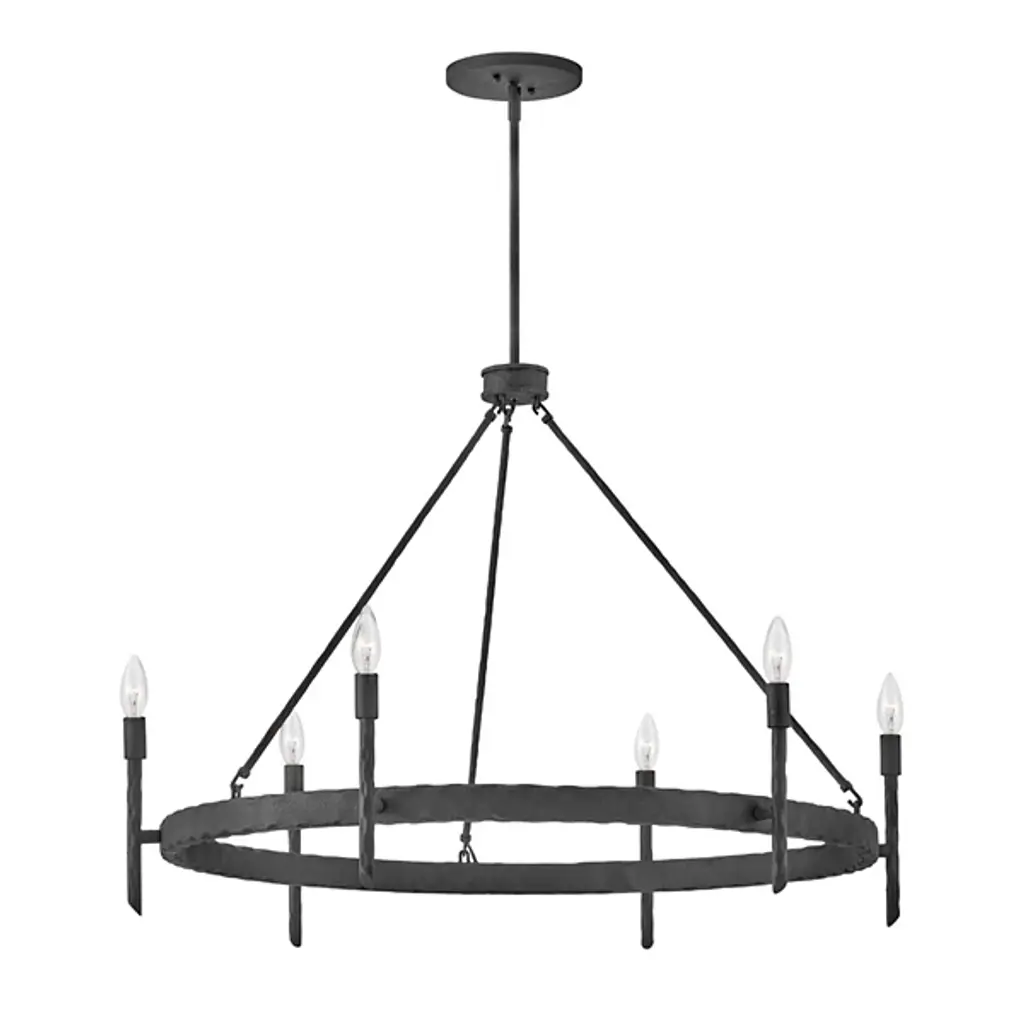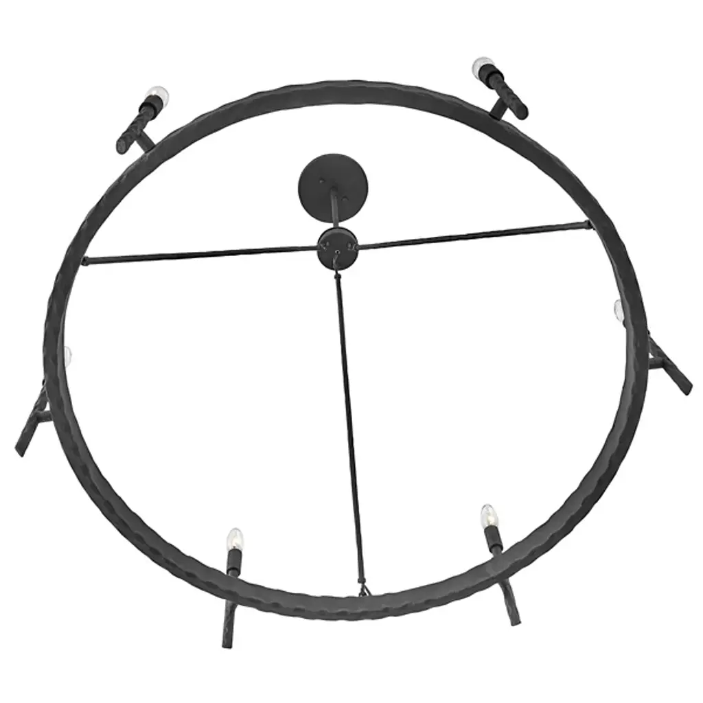 An open, transitional design replete with hand-hammered character. Descending from a sleek, disc-shaped canopy, the Tress Chandelier from Hinkley Lighting seats a rounded hub beneath a slender downrod, dispatching three slender stems down to a slender ring below. Below the stem and canopy, each metal surface is enhanced by hand-hammered marks, while a series of vertical rods with bevel-cut ends are arranged around the outer surface of the horizontal ring. These rods support open candelabra-style lamping rising from smooth single sockets that blaze out around the fixture, burnishing the supportive metal structure with a warm ambiance.