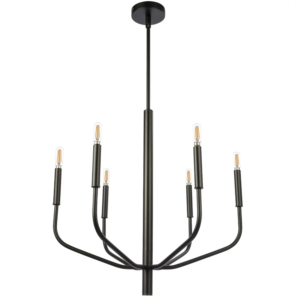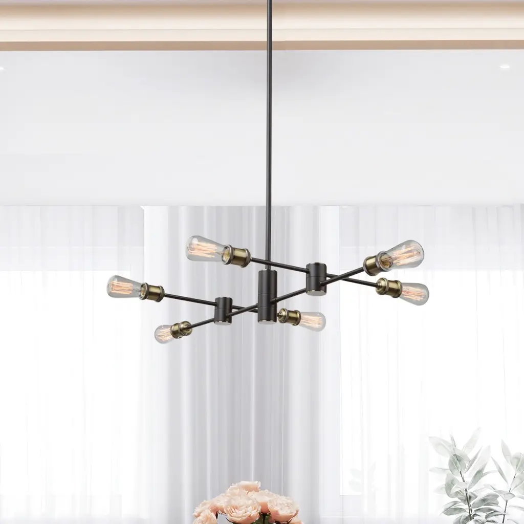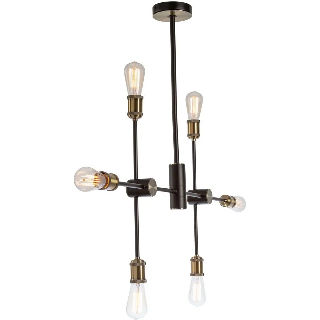 Modular in design, the "Tribeca" series elegantly adopts the beauty of retro Edison bulbs (not included). This version has a trendy two tone color factor. The frame is matte black while the socket cover, arm connectors, and part of the canopy are in plated satin brass. An instant classic which brightens up any area. 6 light chandelier shown - other size also available. Comes with hang straight for sloped ceilings and multiple rods for desired height.