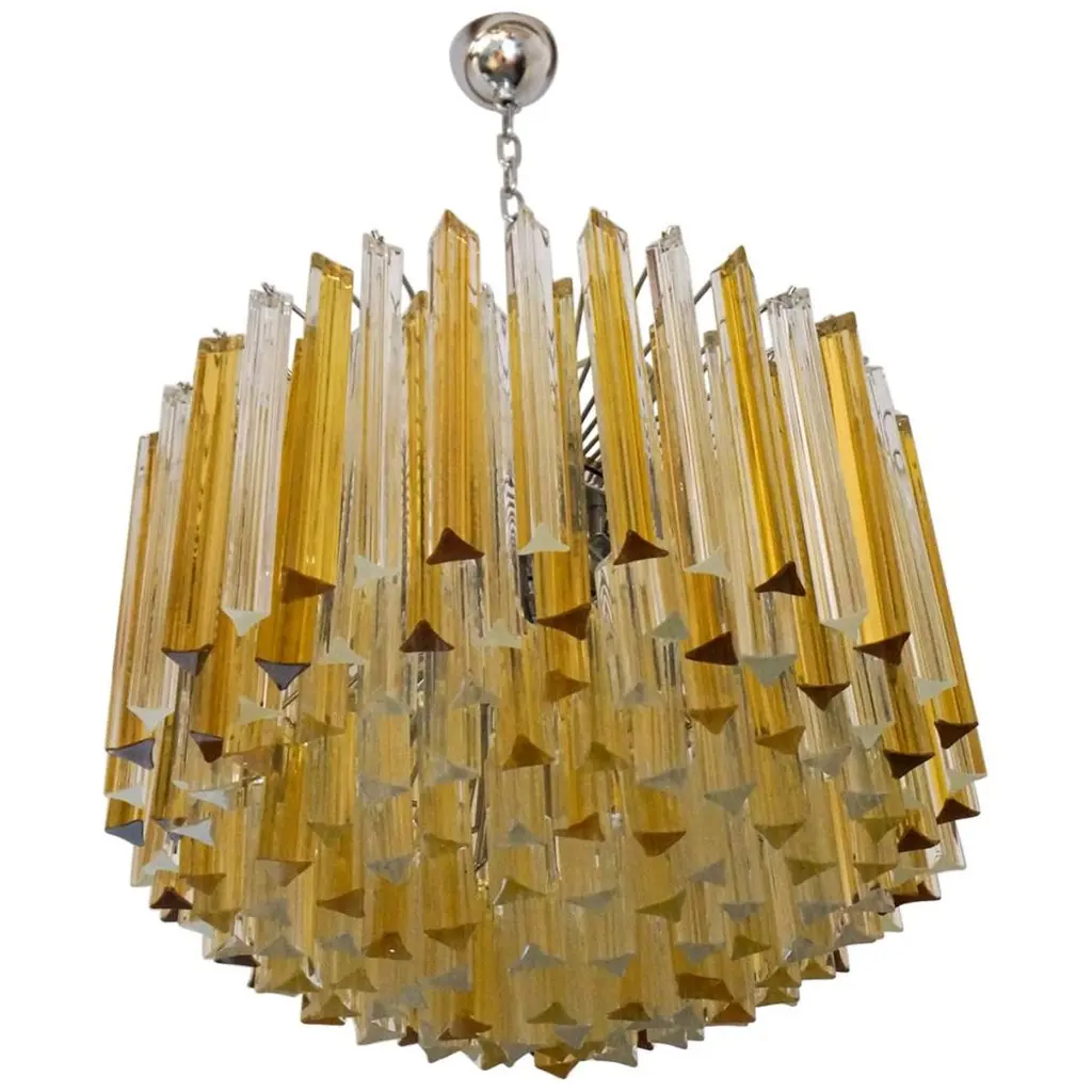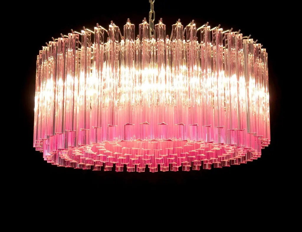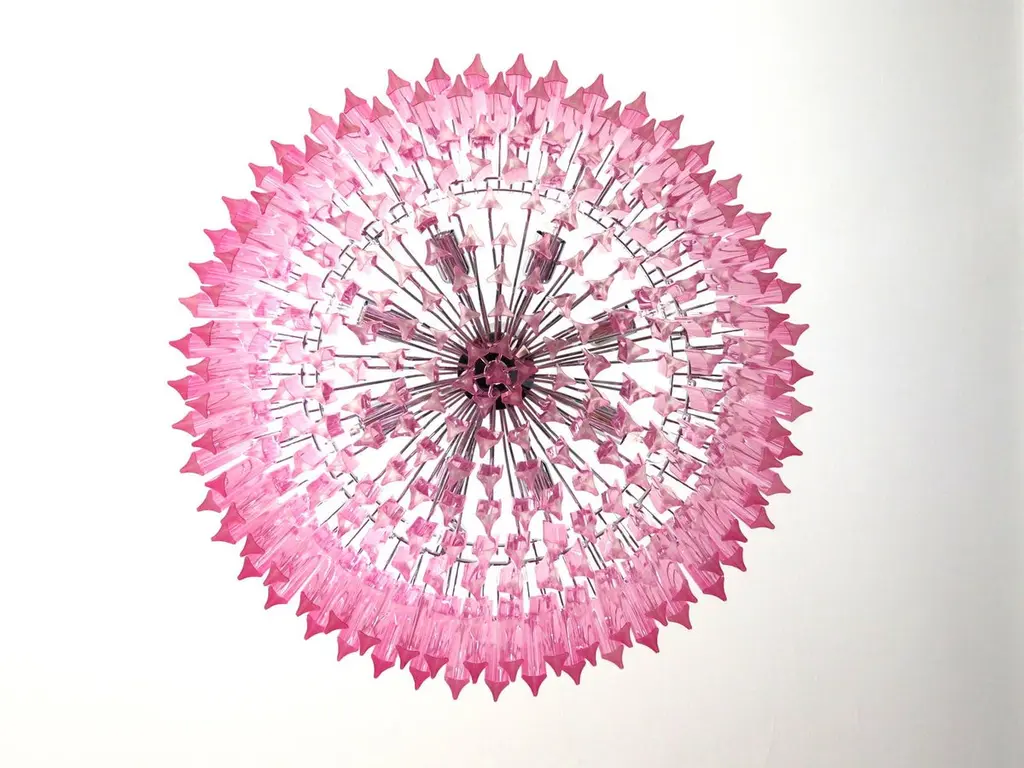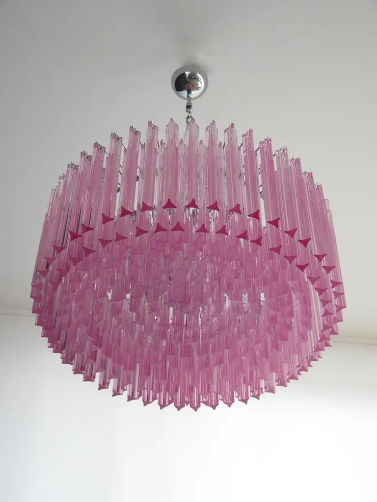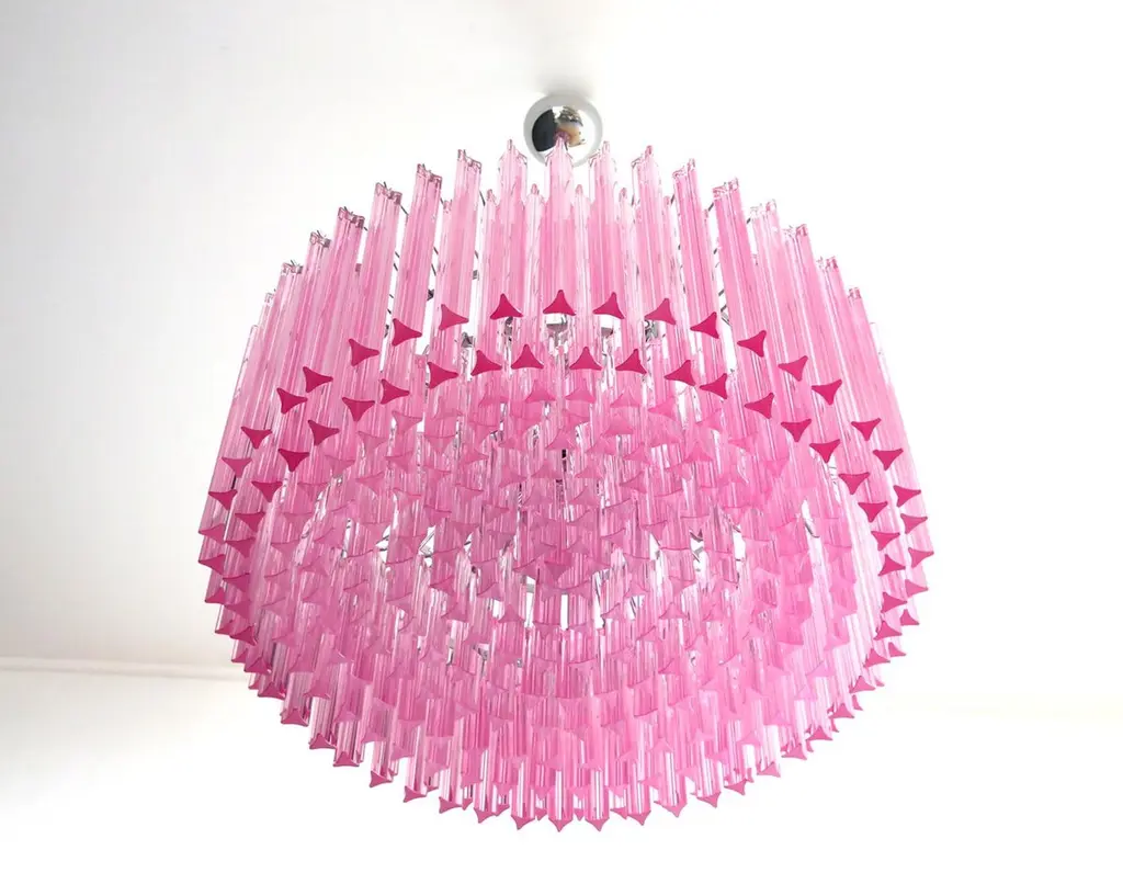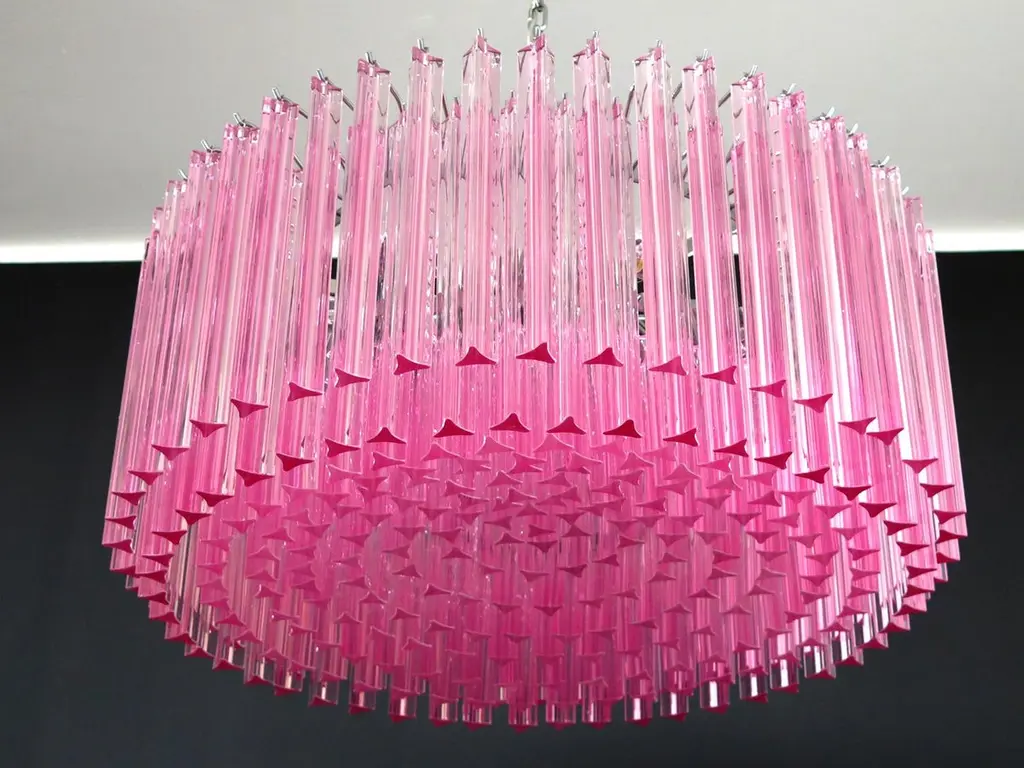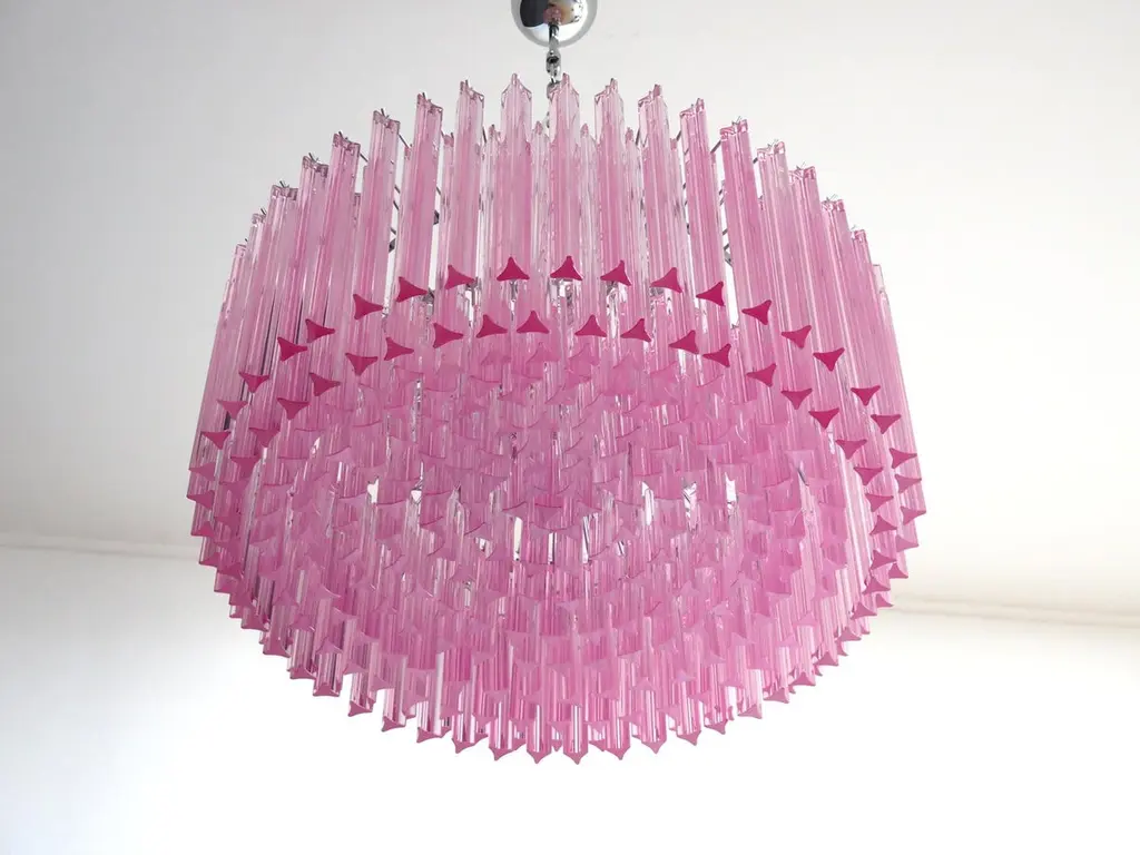 Triedri Murano glass chandelier, 265 pink prismA magnificent Murano glass chandelier, 265 pink triedri on crome frame. This large midcentury Italian chandelier is truly a timeless Classic.Period: late 20th centuryDimensions: 43.30 inches (110 cm) height with chain, 15.75 inches (40 cm) height without chain, 29.50 inches (75 cm) diameter. (The measurements are taken with a chandelier mounted, so there can be minimal differences)Dimension of glasses: 96 pink triedri, height 11 inches (28 cm) + 169 pink triedri, height 3.95 inches (10 cm)Light bulbs: 8 light bulbs, E27 dimension (not included in the sale), on request we can replace the lampholders with those suitable for the American electrical system.Condition: Perfect condition and fully working.