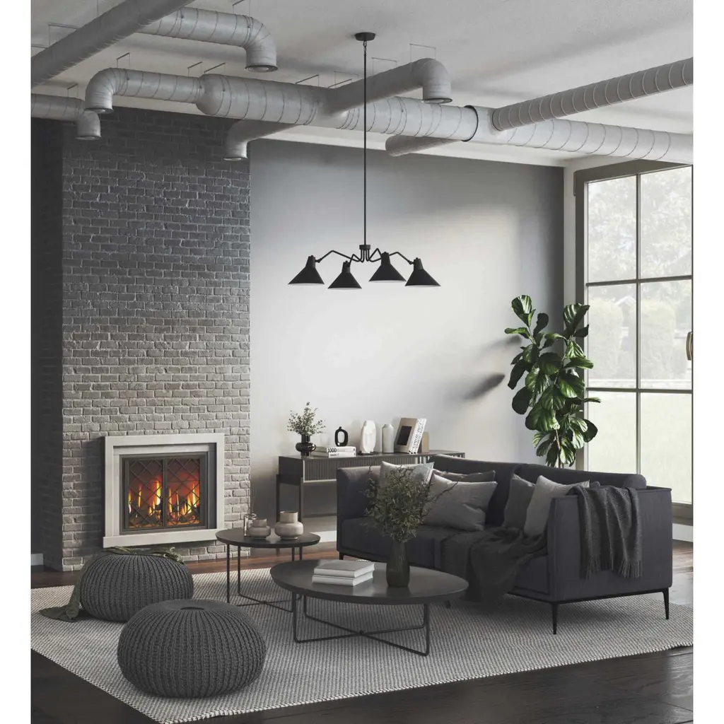 Angular metal shades suspended from an expansive frame create a signature design statement in the Trimble Collection. Its mid-century modern inspiration incorporates a streamlined approach and rich visual details that bring iconic style to open spaces. Its opaque metal shades are finished in subtle matte black. This pendant is ideal for deliveringsp downlight to living rooms, dining rooms and bedrooms in mid-century modern and luxe industrial settings.