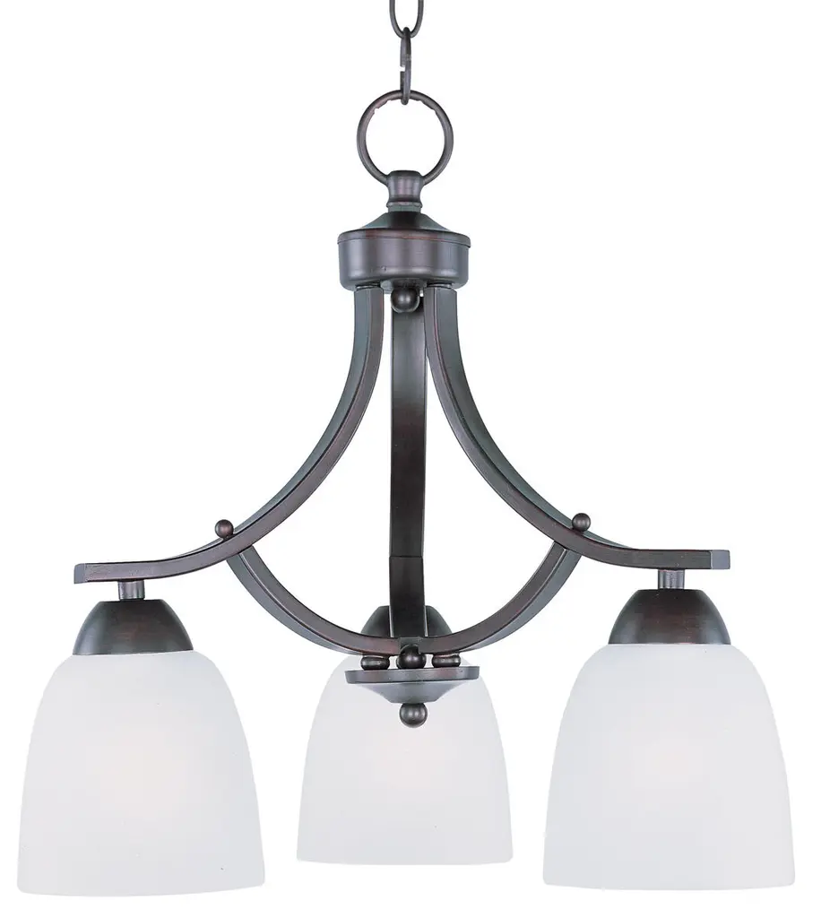 Three-light chandelier featuring soft angles, curving lines and etched glass shades. Gracefully exotic, the Trinity Collection offers classic sophistication for transitional interiors. Sculptural forms of metal and glass are enhanced by a classic finish. This transitional style can transform a room or your whole home with its charming versatility.