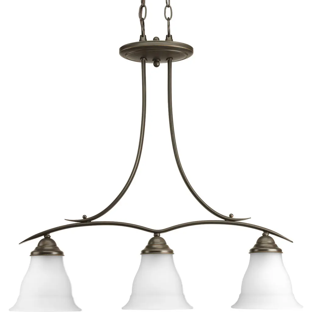 Three-light linear chandelier featuring soft angles, curving lines and etched glass shades. Gracefully exotic, the Trinity Collection offers classic sophistication for transitional interiors. Sculptural forms of metal and glass are enhanced by a classic finish. This transitional style can transform a room or your whole home with its charming versatility. Antique Bronze finish.