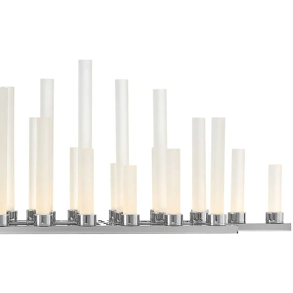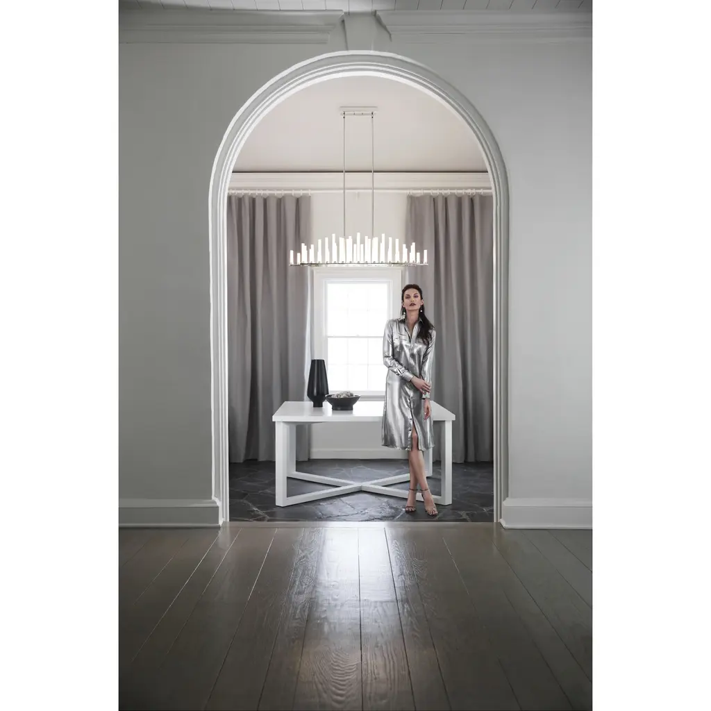 This stunning silhouette suggests rows of candles burning at different rates as in days of old, yet Trinity is modern in every aspect. Each frosted glass column is evenly lit with integrated LED, producing multiple points of light in undulating fashion along the Polished Nickel or Heritage Brass frame. The effect is breathtaking, unexpected and completely spectacular.