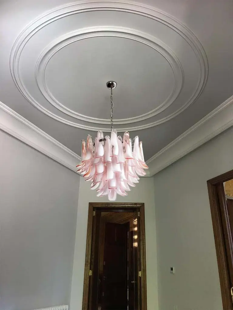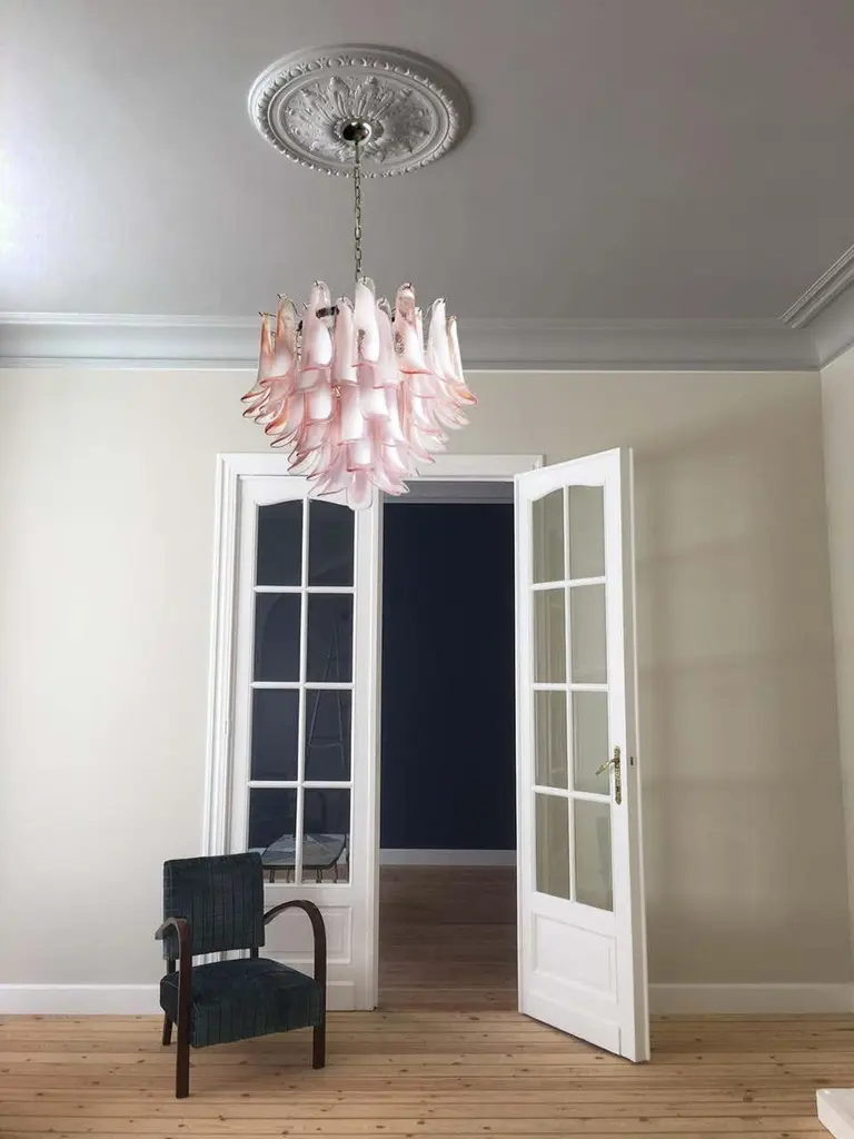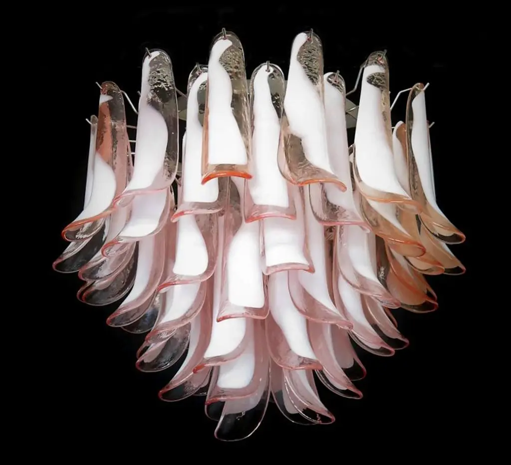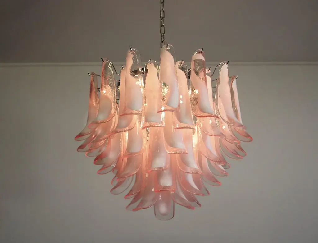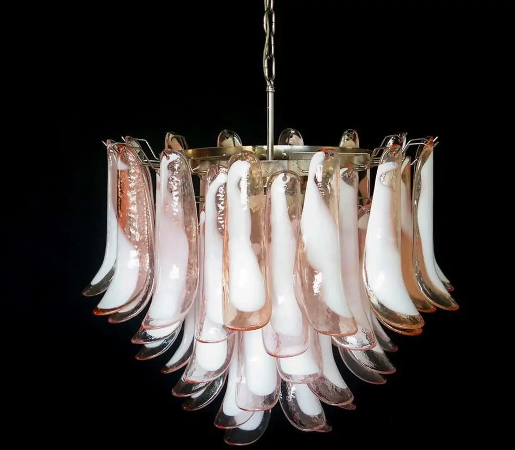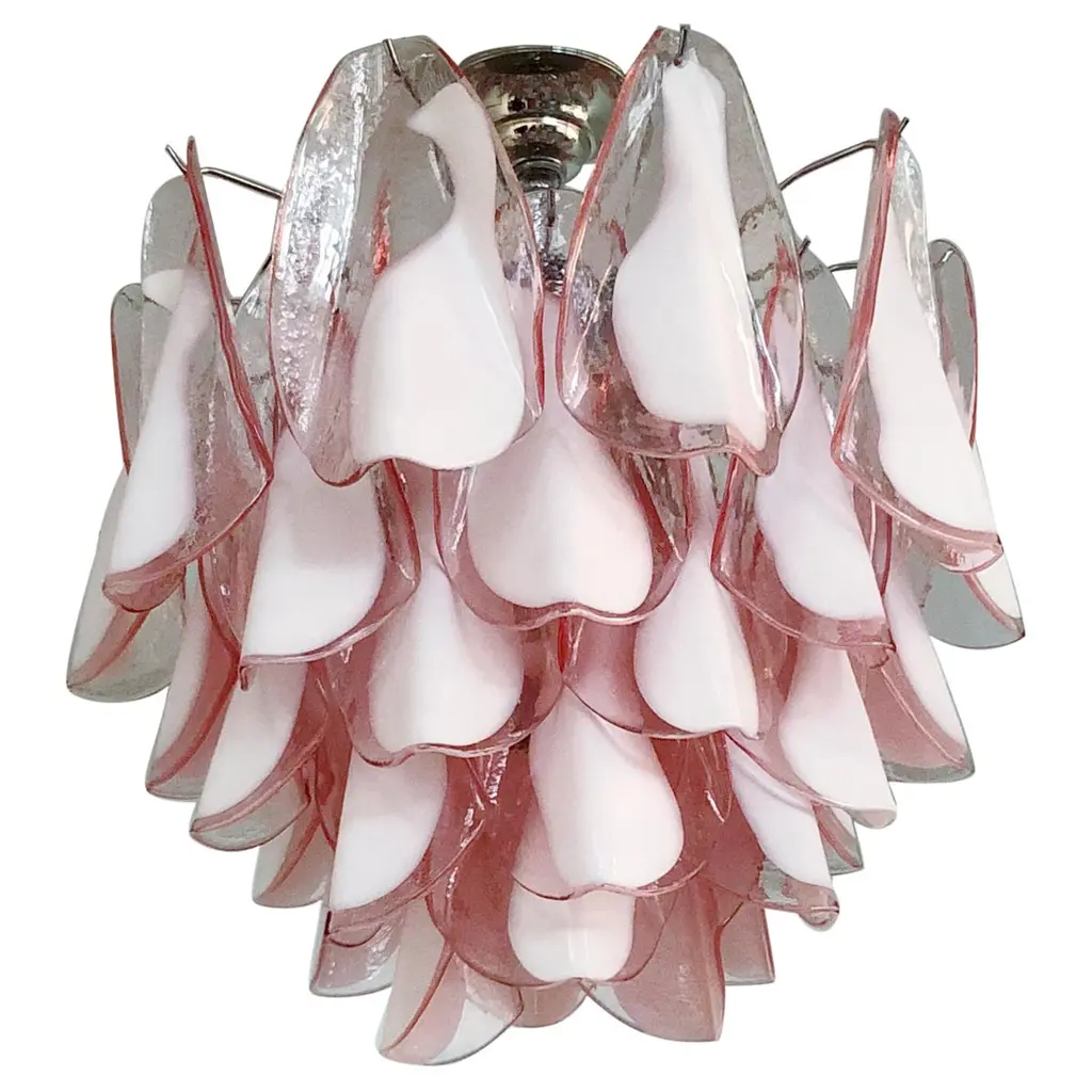 Trio Italian vintage Murano chandeliers, Mazzega Style. Each chandelier is made 53 pink lattimo glass petalsMurano Italian glass chandelier. Fantastic chandelier with pink and white “lattimo” glasses, nickel-plated metal frame. It has 53 big monumental petals glass. The glasses are very high quality, the photos do not do the beauty, luster of these glasses.Period: Late 20th centuryDimensions: 51.20 inches (130 cm) height with chain, 25.60 inches (65 cm) height without chain, 27.55 inches (70 cm) diameter.Dimension glasses: 11.40 inches (29 cm) height, 3.15 inches (8 cm) maximum width.Light bulbs: 7 light bulbs: E14 dimension (not included in the sale), on request we can replace the lampholders with those suitable for the American electrical system.Condition: Perfect vintage condition and fully working; the glasses are perfect and the chrome has wear consisting in age and use.