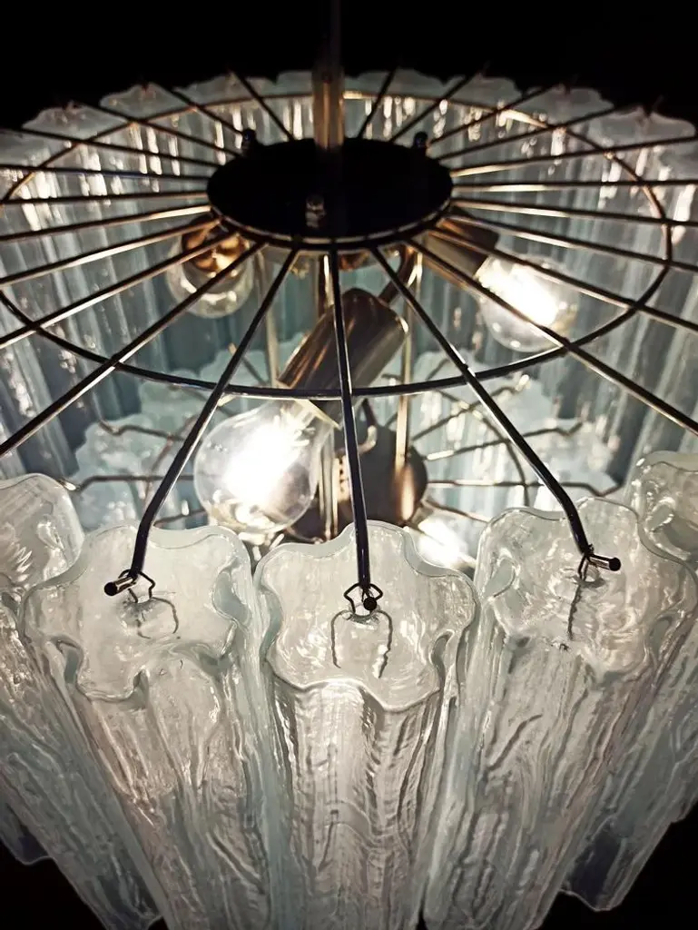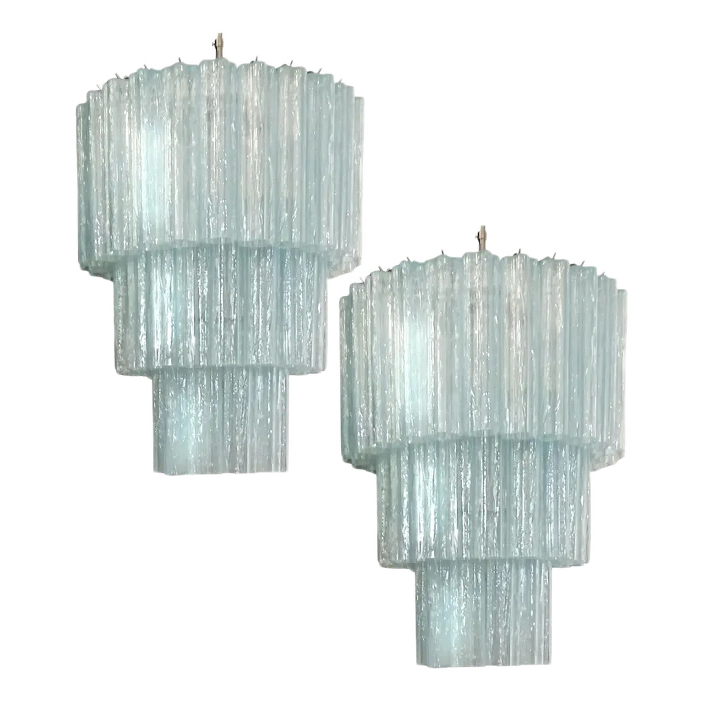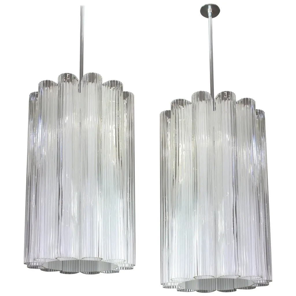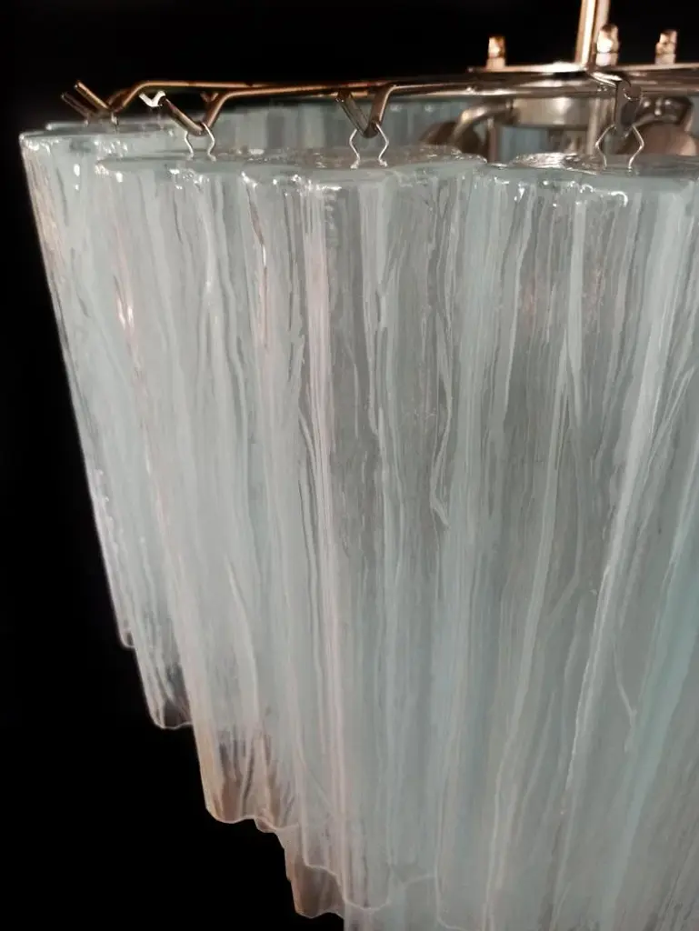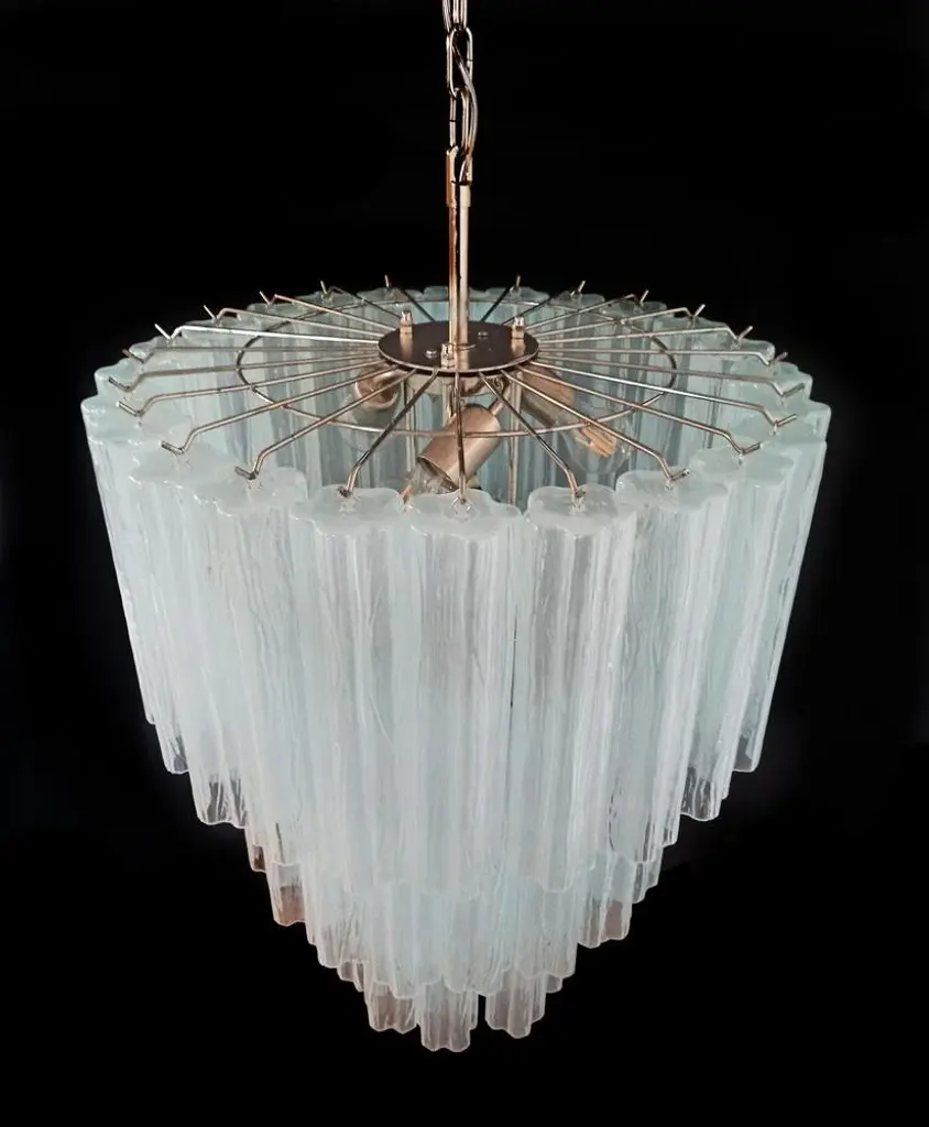 Pair italian vintage chandeliers in murano glass and nickel-plated metal structure. The armor polished nickel supports 52 large opal silk glass tubes in a star shape. period: late 20th century dimensions: 58,90 inches (152 cm) height with chain; 34,90 inches (90 cm) height without chain; 23,60 inches (60 cm) diameter. dimension glasses: 11,60 inches (30 cm) height; 2,75 inches (7 cm) diameter light bulbs: 7 light bulbs e27 dimension (not included in the sale) condition: perfect vintage condition and fully working. The metal structure shows some signs of opacity due to the passing of time, the conditions are very good overall. this piece is designed in the style of the selected designer and/or manufacturer, up to 250v (europe/uk standard).the wiring of this item may be original and might need replacement, if not specified otherwise.