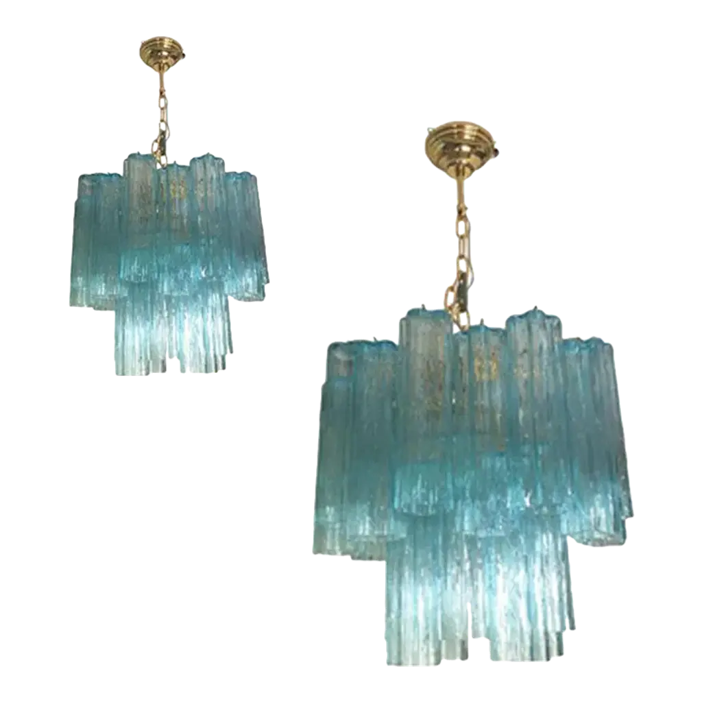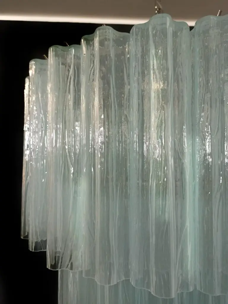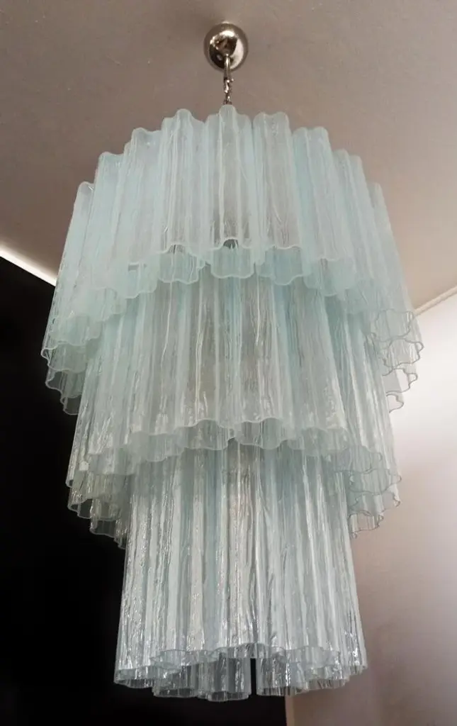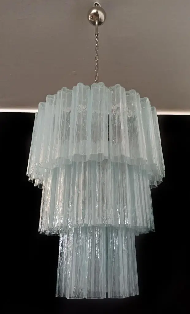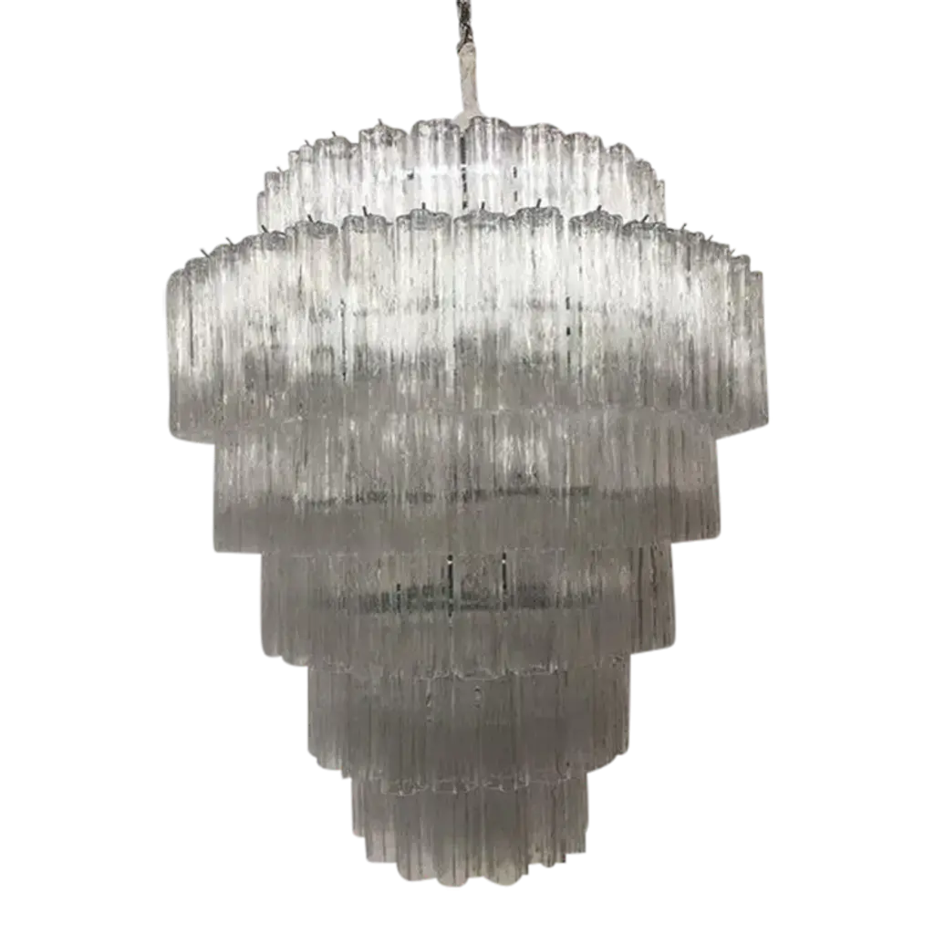 Pair italian vintage chandeliers in murano glass and nickel-plated metal structure. The armor polished nickel supports 52 large opal silk glass tubes in a star shape. period: late 20th century dimensions: 58,90 inches (152 cm) height with chain; 34,90 inches (90 cm) height without chain; 23,60 inches (60 cm) diameter. dimension glasses: 11,60 inches (30 cm) height; 2,75 inches (7 cm) diameter light bulbs: 7 light bulbs e27 dimension (not included in the sale) condition: perfect vintage condition and fully working. The metal structure shows some signs of opacity due to the passing of time, the conditions are very good overall. this piece is designed in the style of the selected designer and/or manufacturer, up to 250v (europe/uk standard).the wiring of this item may be original and might need replacement, if not specified otherwise.