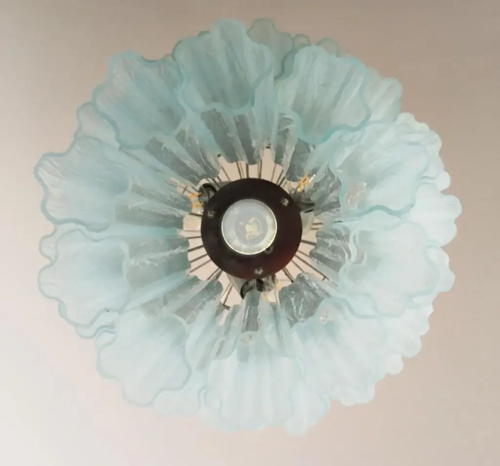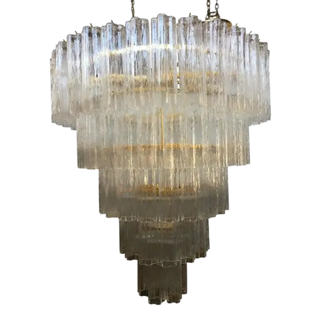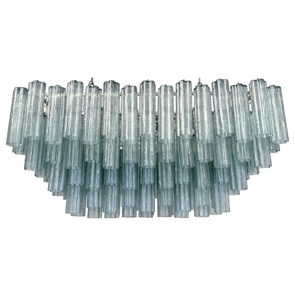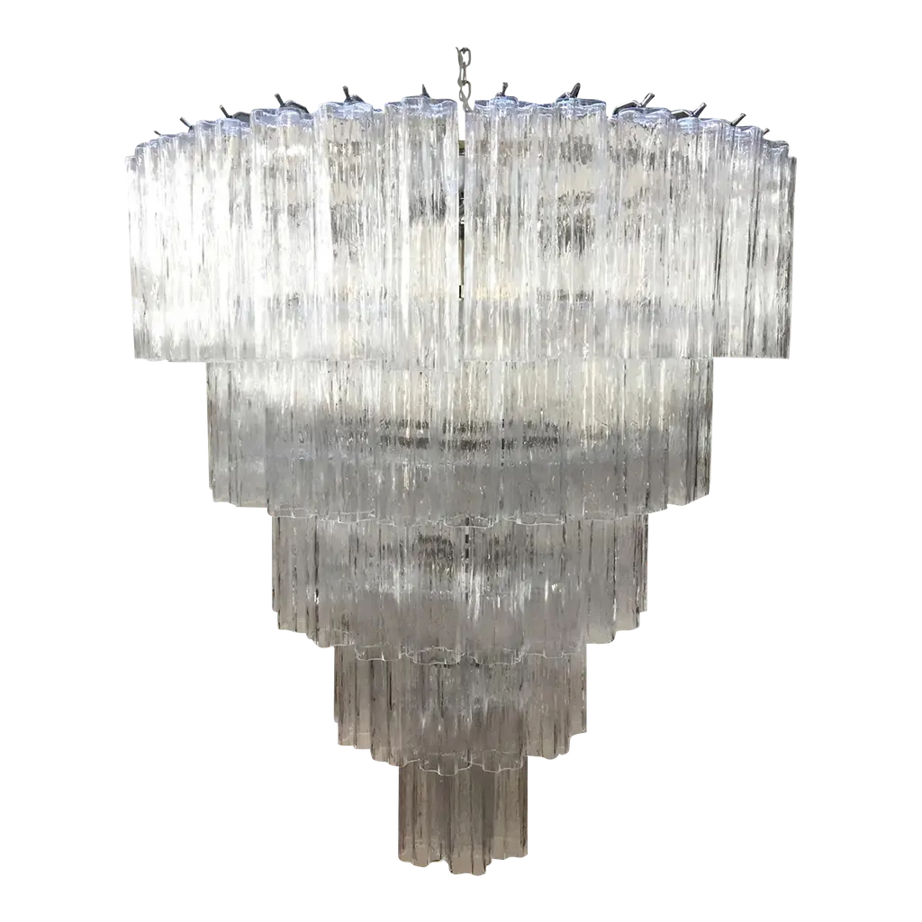 Pair italian vintage chandeliers in murano glass and nickel-plated metal structure. The armor polished nickel supports 52 large opal silk glass tubes in a star shape. period: late 20th century dimensions: 58,90 inches (152 cm) height with chain; 34,90 inches (90 cm) height without chain; 23,60 inches (60 cm) diameter. dimension glasses: 11,60 inches (30 cm) height; 2,75 inches (7 cm) diameter light bulbs: 7 light bulbs e27 dimension (not included in the sale) condition: perfect vintage condition and fully working. The metal structure shows some signs of opacity due to the passing of time, the conditions are very good overall. this piece is designed in the style of the selected designer and/or manufacturer, up to 250v (europe/uk standard).the wiring of this item may be original and might need replacement, if not specified otherwise.