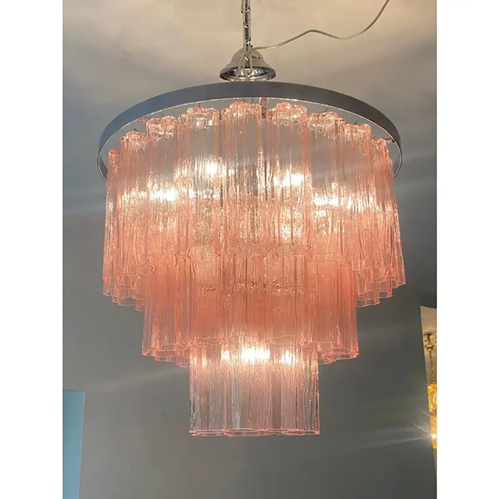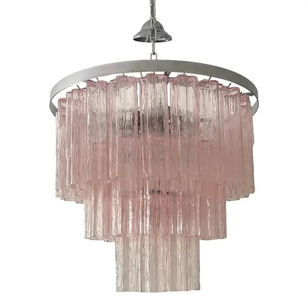 Contemporary pink “tronchi” murano glass chandelier with a chromed belt. “tronchi”are blown inside a wooden mold, into which the hot glass slides., element in murano glass. metal frame in chromed plating bath. spare parts are included. Bulbs not included, they are compatible with led sustainability. entirely made in italy, made in murano glass fruit of of high italian know-how. dimensions(cm/in): d 60 cm h 60cm/ d 23,6″” h 23,6″ finiture: krome metal frame chain 19.7″ more canopy ship from italy up to 250v (europe/uk standard).