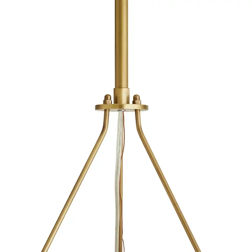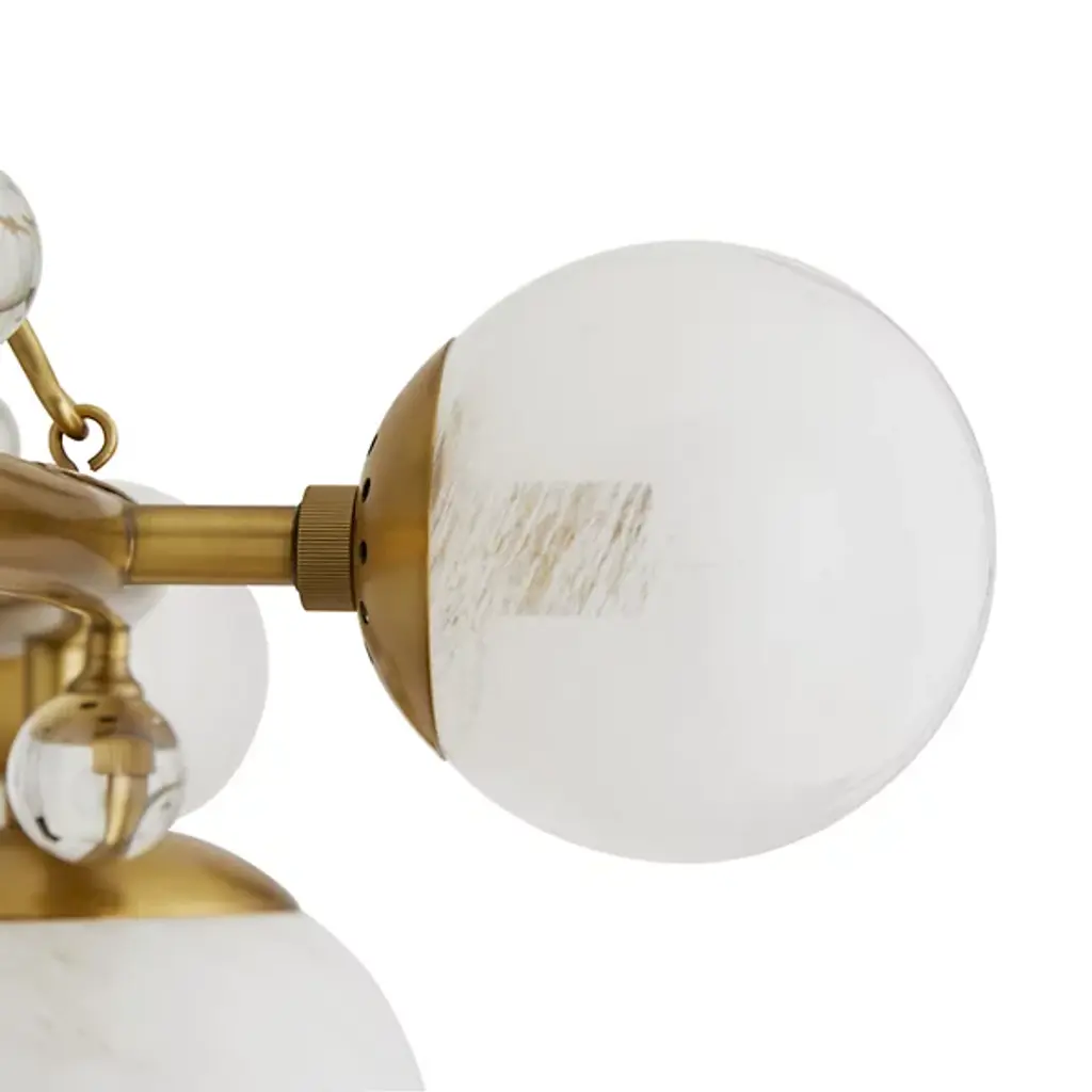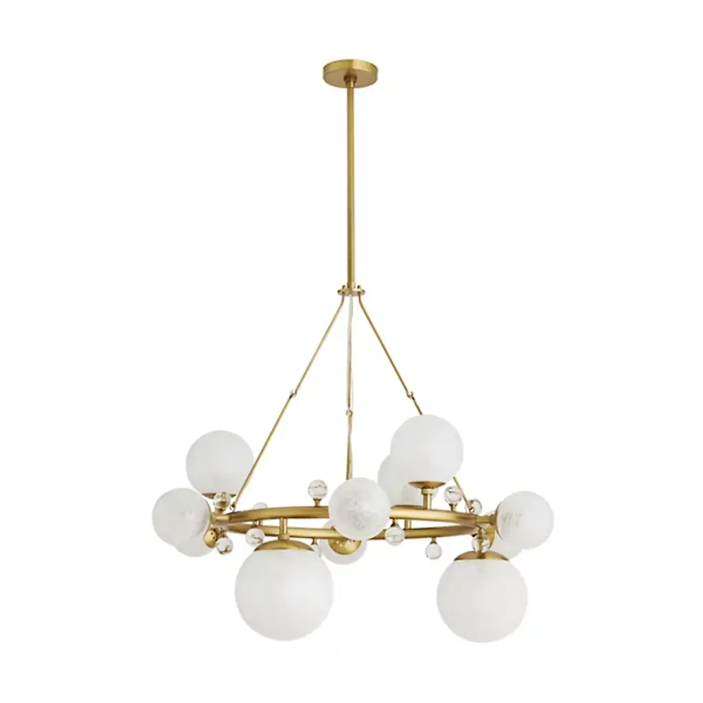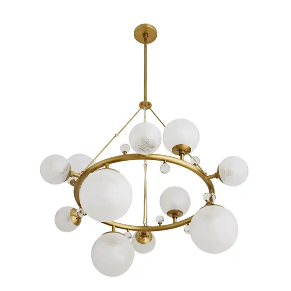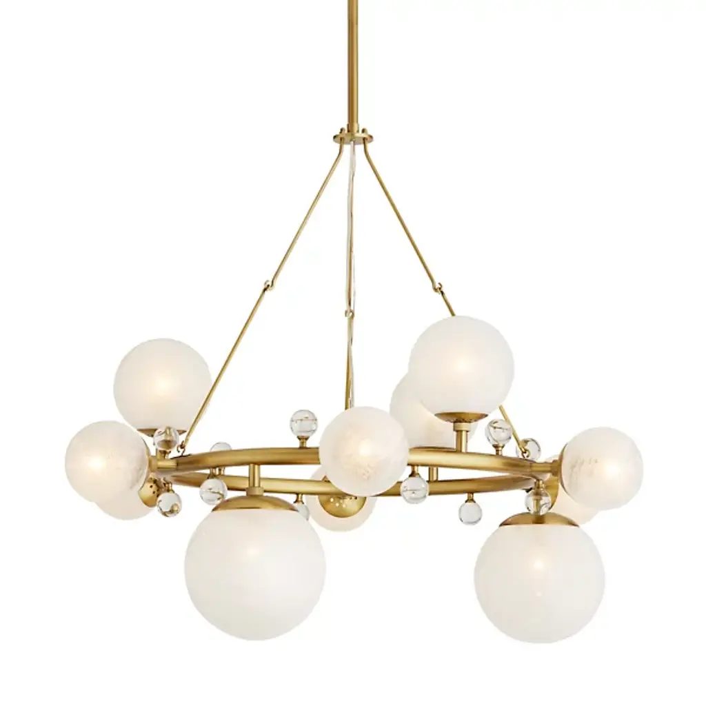 The Troon Round Chandelier by Arteriors is a sophisticated design that features a beautiful collection of glass spheres. Varying in size, these glass shades orbit a sleek, openly styled halo that is suspended by slender hooked supports to give this design an airy feel. Small, smooth, crystal knobs add a layered, decorative look to this chandelier while playfully capturing the light that each glass orb filters onto surroundings, making this elegant piece a perfect blend of form and function.