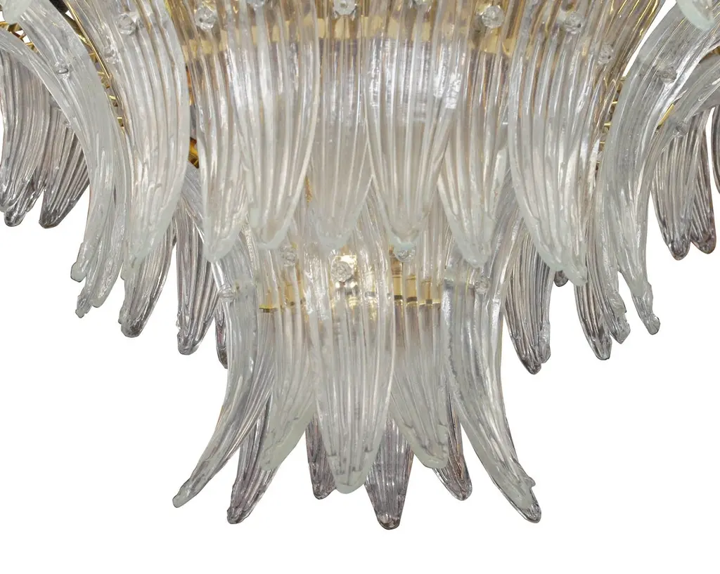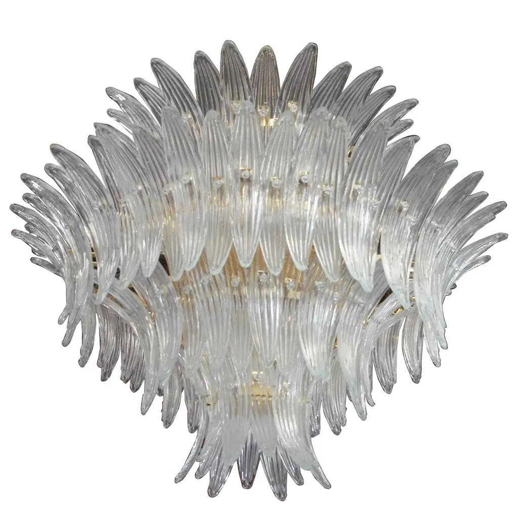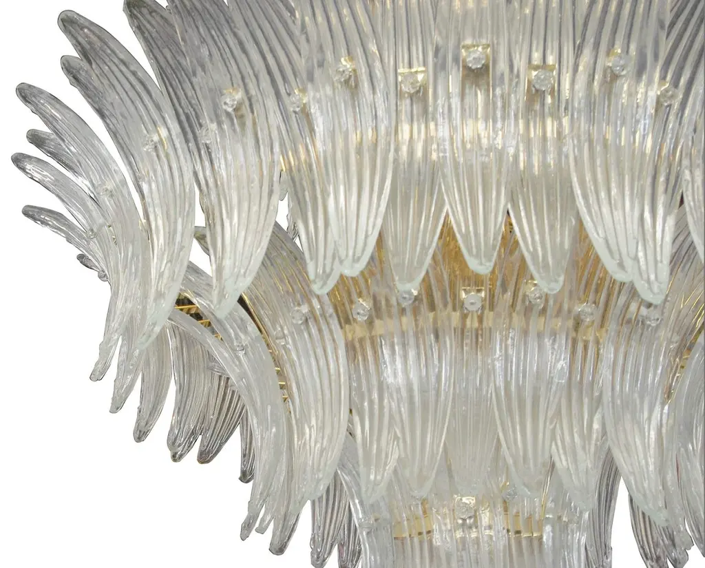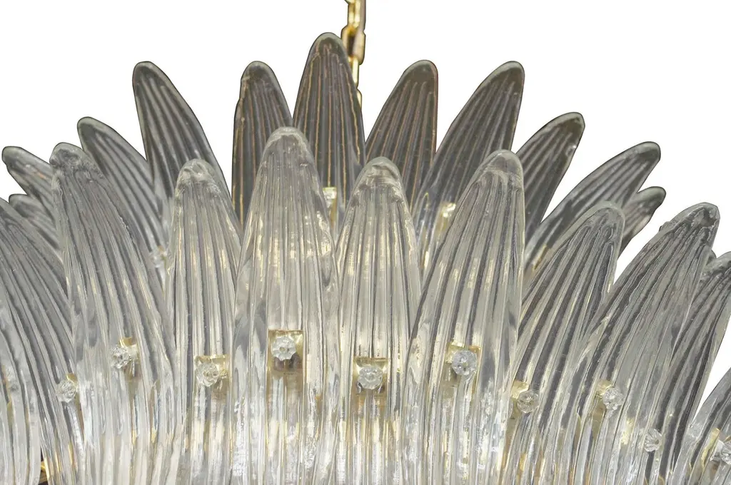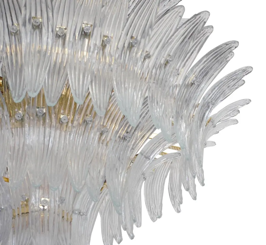 Italian Palmette chandelier with clear Murano glass leaves arranged on four tiers and mounted on gold-plated metal frame by Fabio Ltd / Made in Italy16 lights / E26 or E27 type / max 60W eachMeasures: Diameter 36 inches / Height 27 inches plus chain and canopyOrder Only / This item ships from Italy