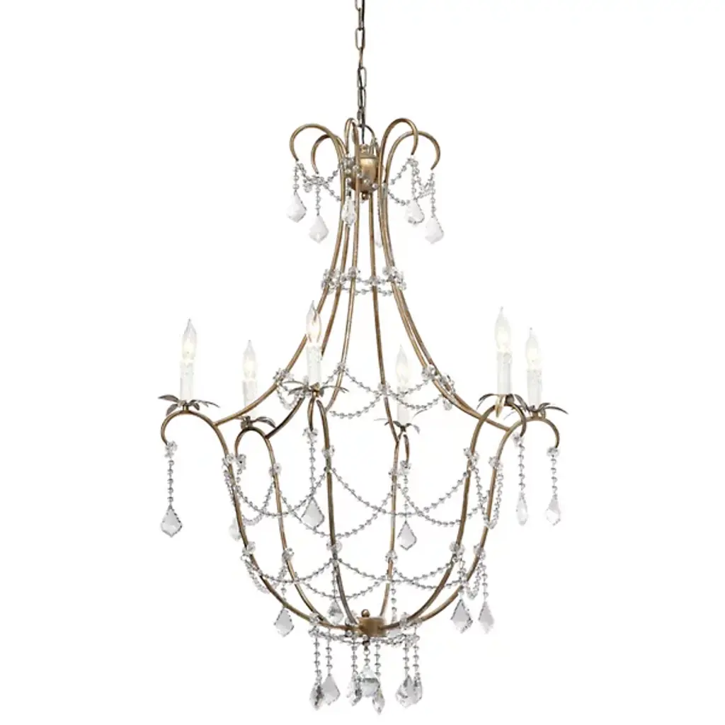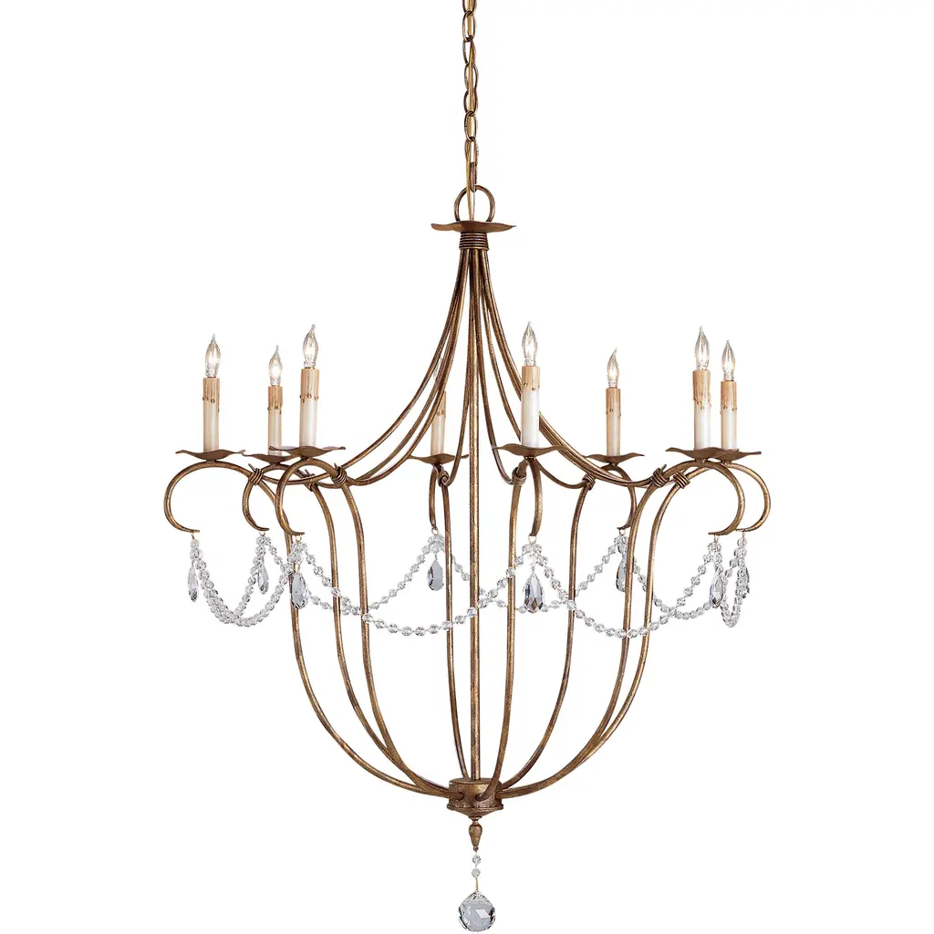 Collection: Viola, Material: Iron, Finish Color: Distressed Gold Leaf, Width: 27.5", Height: 33.5", Chain Length: 72", Lamping Type: Incandescent, Number Of Bulbs: 8, Wattage: 60 Watts, Moisture Rating: Dry Rated, Desc: Canopy Included: TRUE / Shade Included: TRUE / Canopy Diameter: 5.25 x 1< Room Recommendation: Kitchen/Dining Room/Bedroom/Living Room/Entry/Foyer/Hallway/Office / Canopy Included: Yes / Canopy Diameter: 5.25 / Chain Length: 72.00. ,