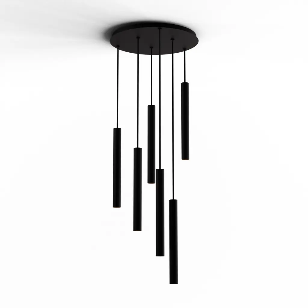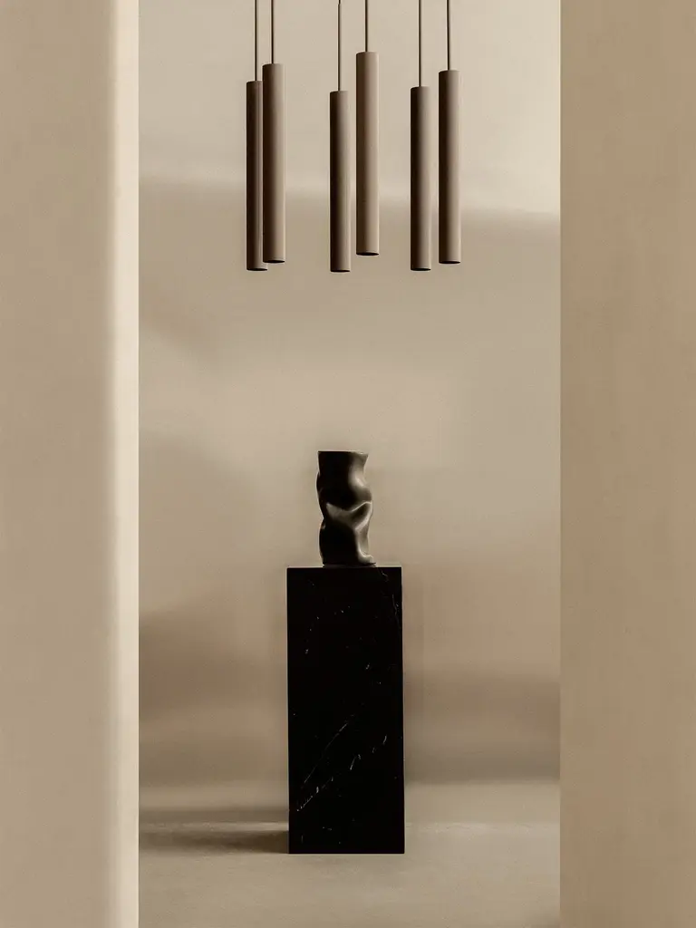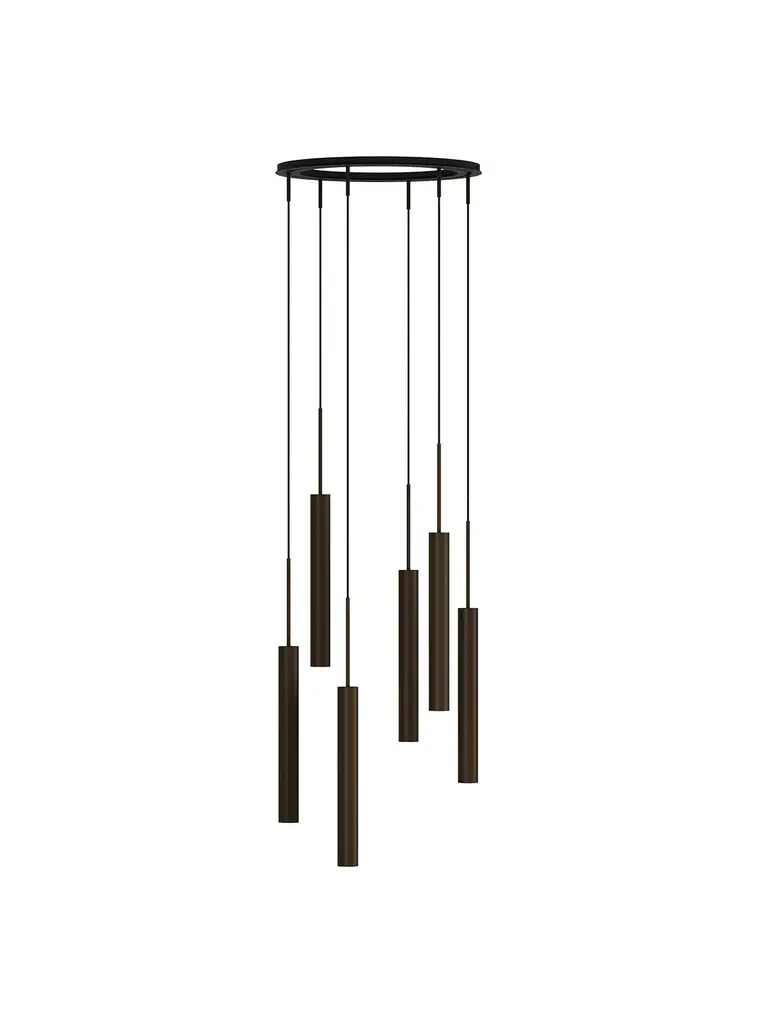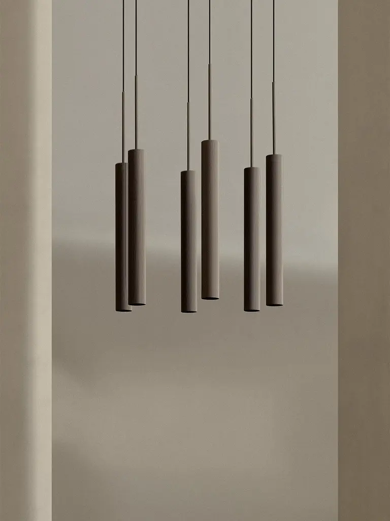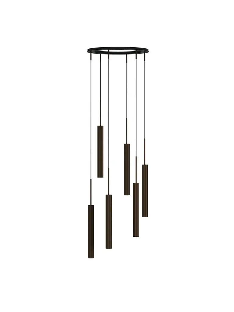 A visually striking lighting designed engineered for a range of spaces, the Tubulaire Chandelier combines industrial charm with a sleek and modern design. Holding between 6, 28 or 38 pendant lights in reeded, anodized aluminum with a bronzed brass surface finish, it delivers downward, mood-setting light, elevating the overall ambiance and contributing to a modern aesthetic.
