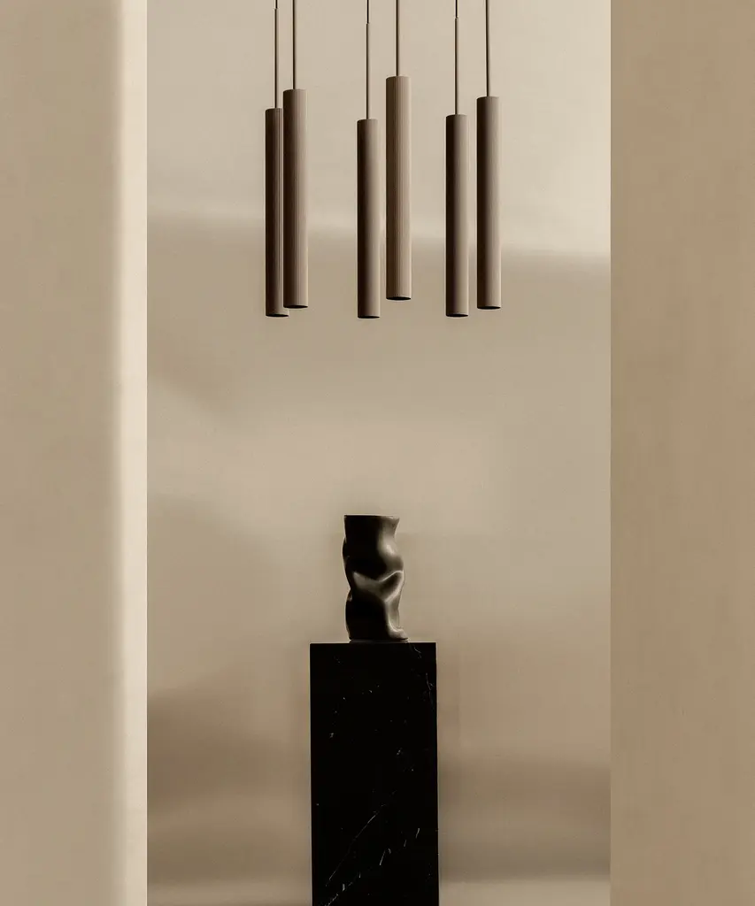 Visually striking lighting designed engineered for a range of spaces, the Tubulaire Chandelier combines industrial charm with a sleek and modern design. Holding between 6, 28, or 38 pendant lights in reeded, anodised aluminum with a bronzed brass surface finish, it delivers downward, mood-setting light, elevating the overall ambiance and contributing to a modern aesthetic. Designed by Kroyer-Saetter-Lassen for the Danish design company, Audo Copenhagen.