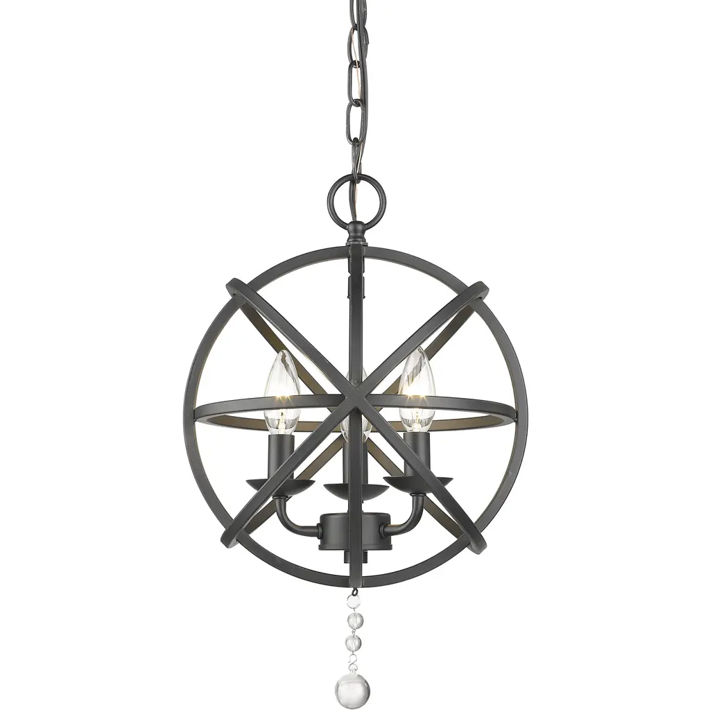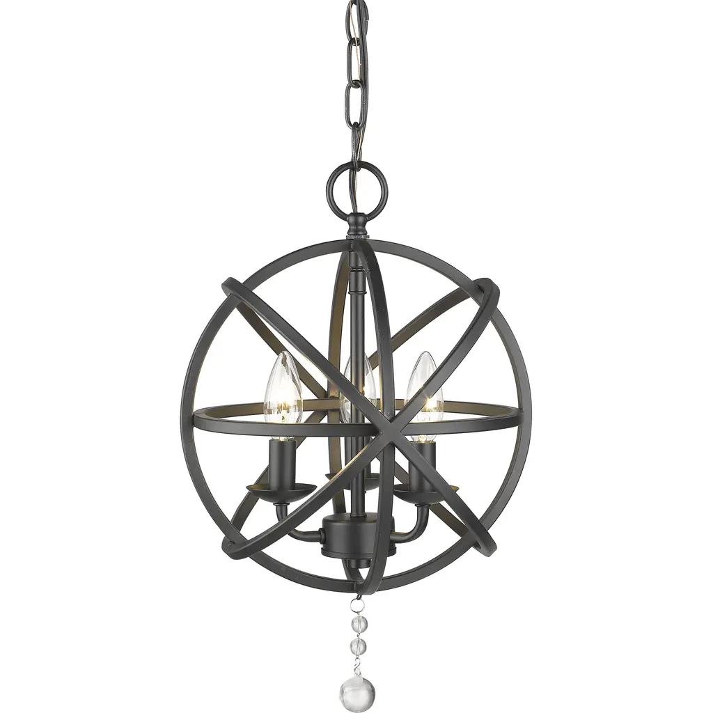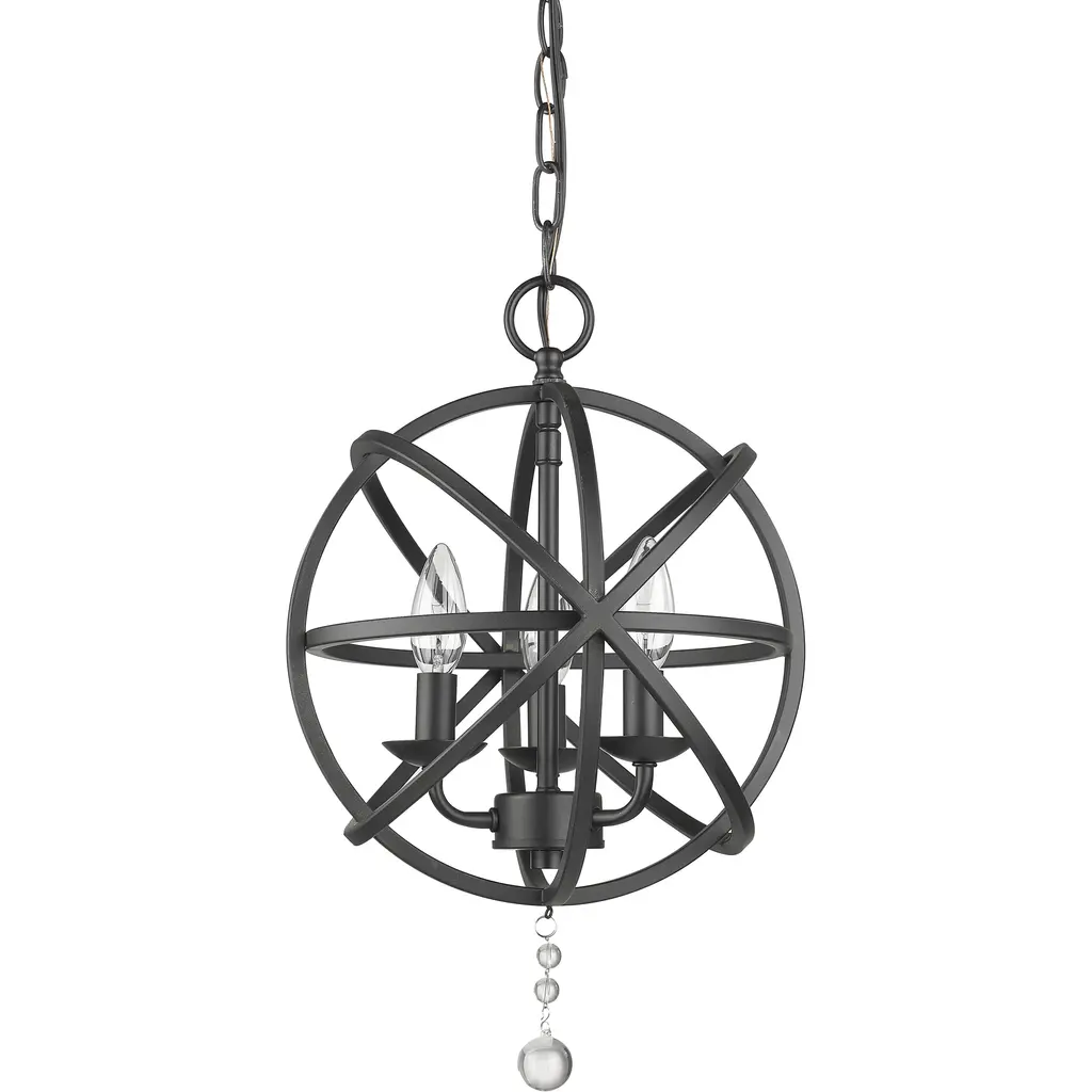 Go for an eye-catching atomic flavor with transitional charm, and choose this steel three-light chandelier to highlight a custom designed space. Fully customizable in finishes, its open-concept matte black steel frame suspends from a tasteful chain, hosting charming candelabra-style bulb bases and finials and a bonus of clear crystal balls.
