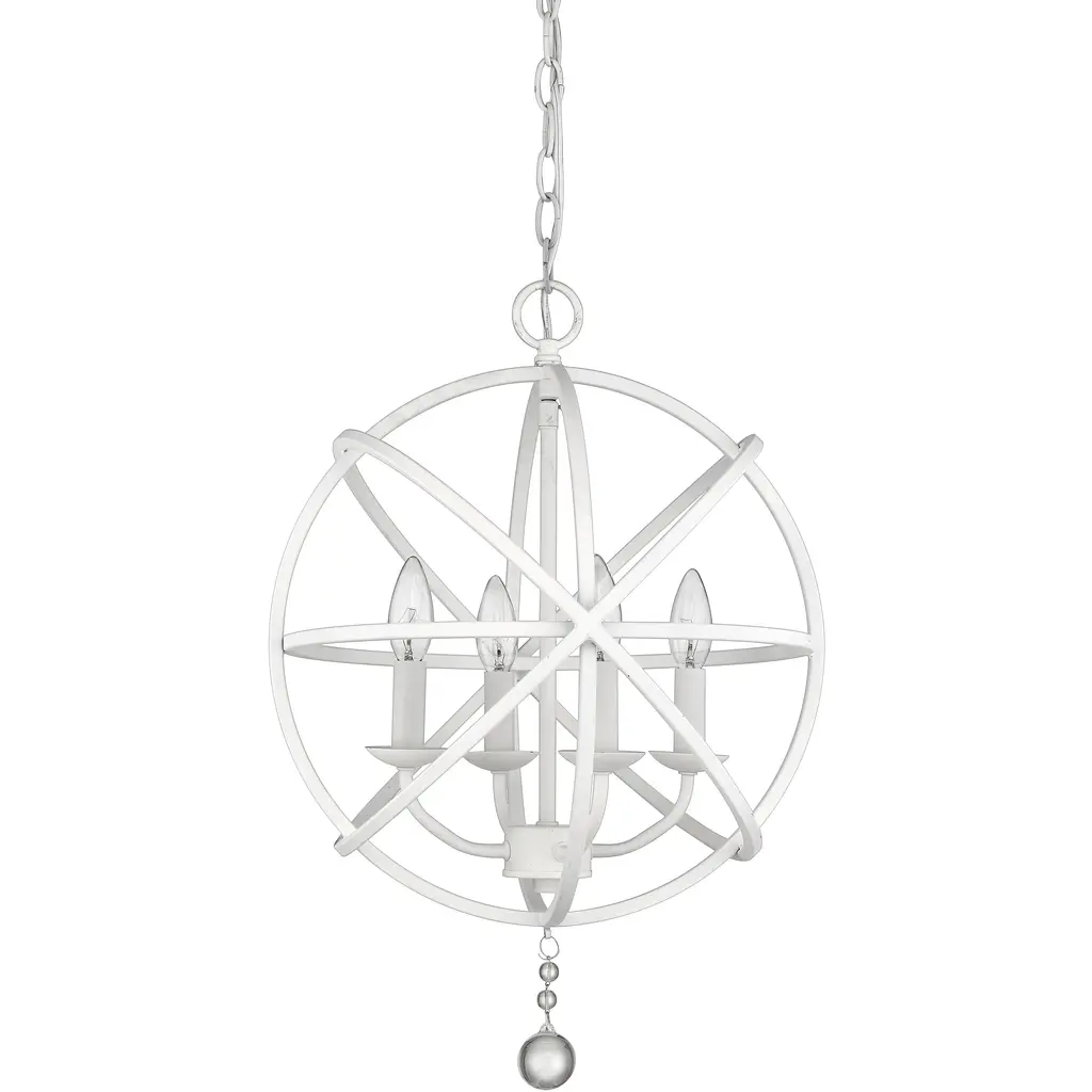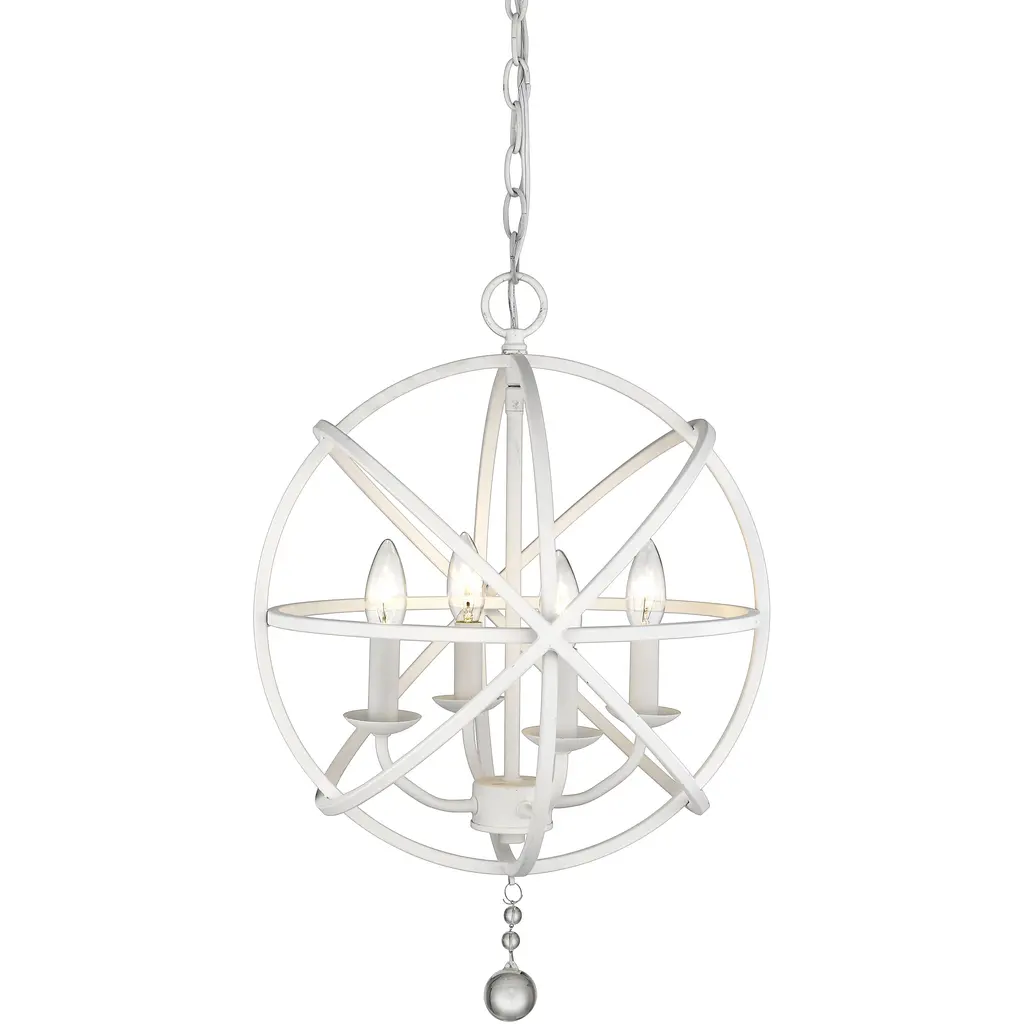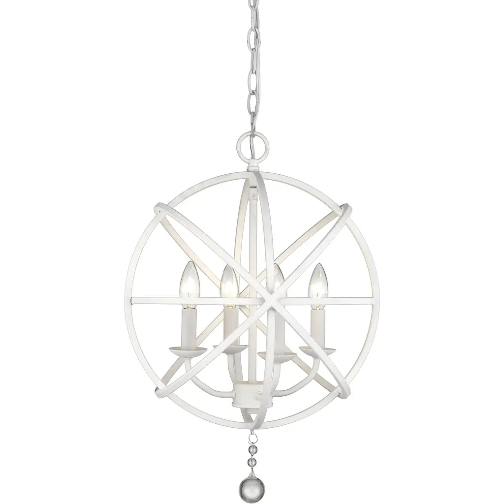 A charming strand of crystal accents bring a delightful touch to the versatile appeal of this steel four-light chandelier. Start with a fresh matte white open-concept orb base and choose tailored options for bulb base, finial, and interior frame finishes.